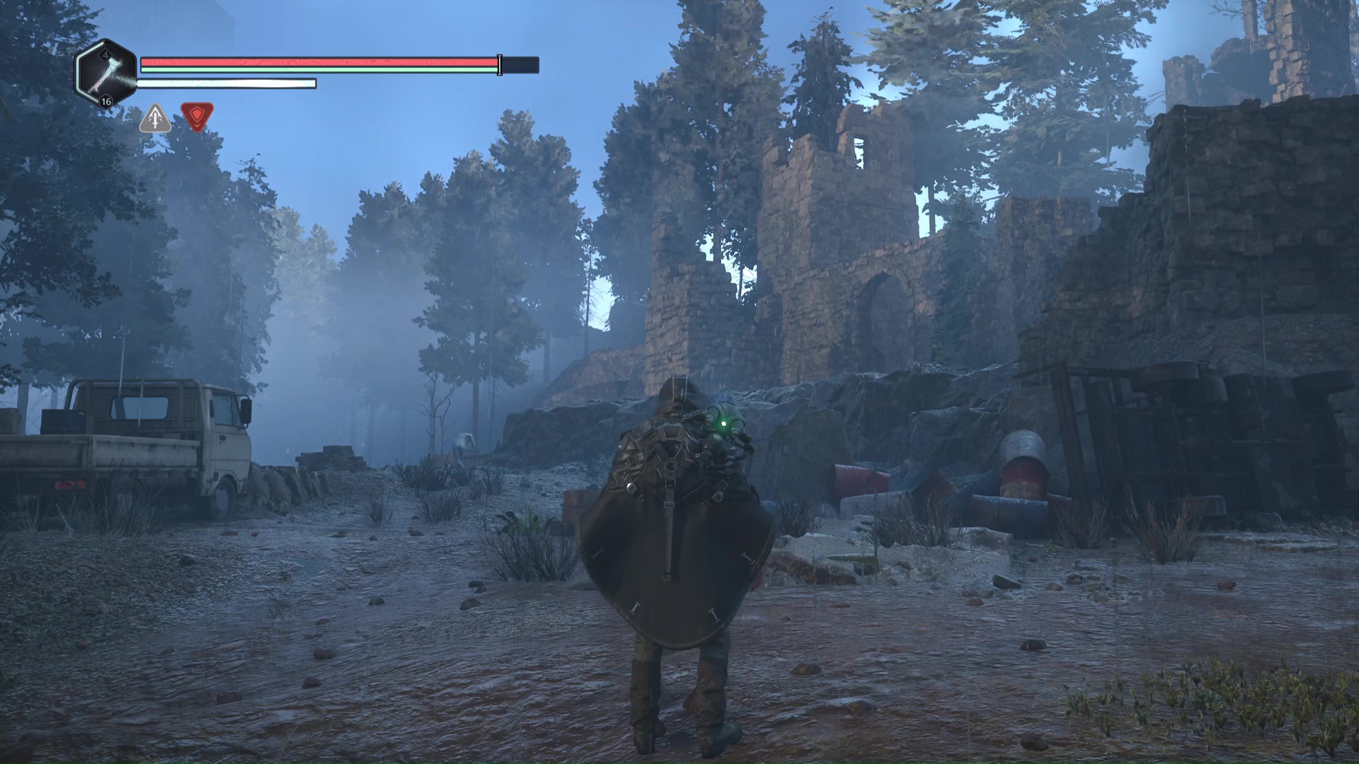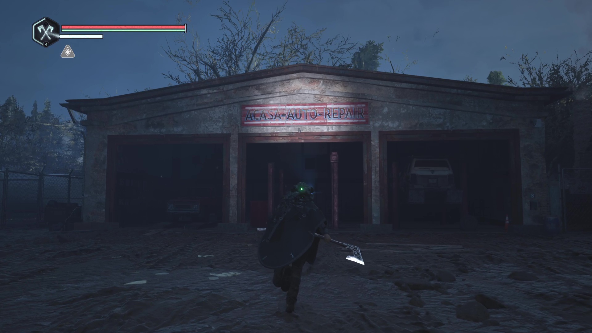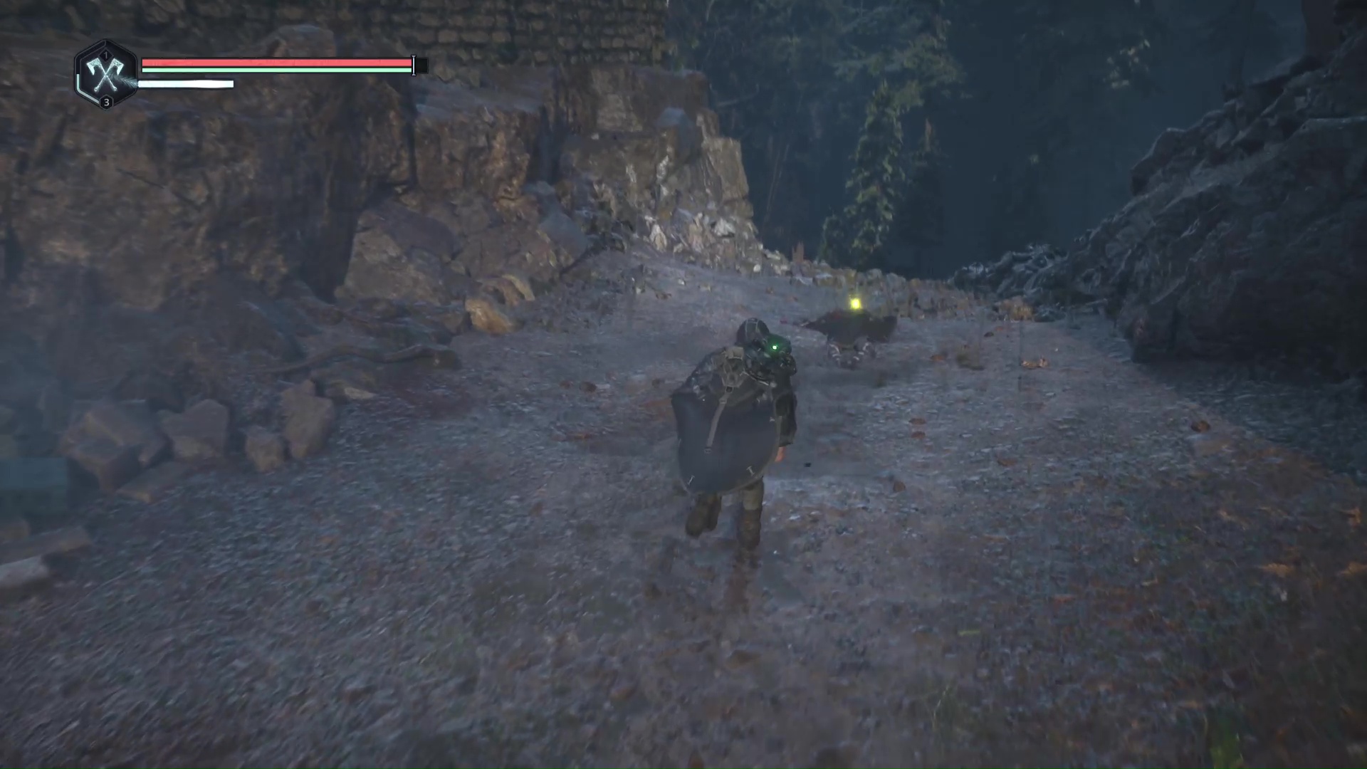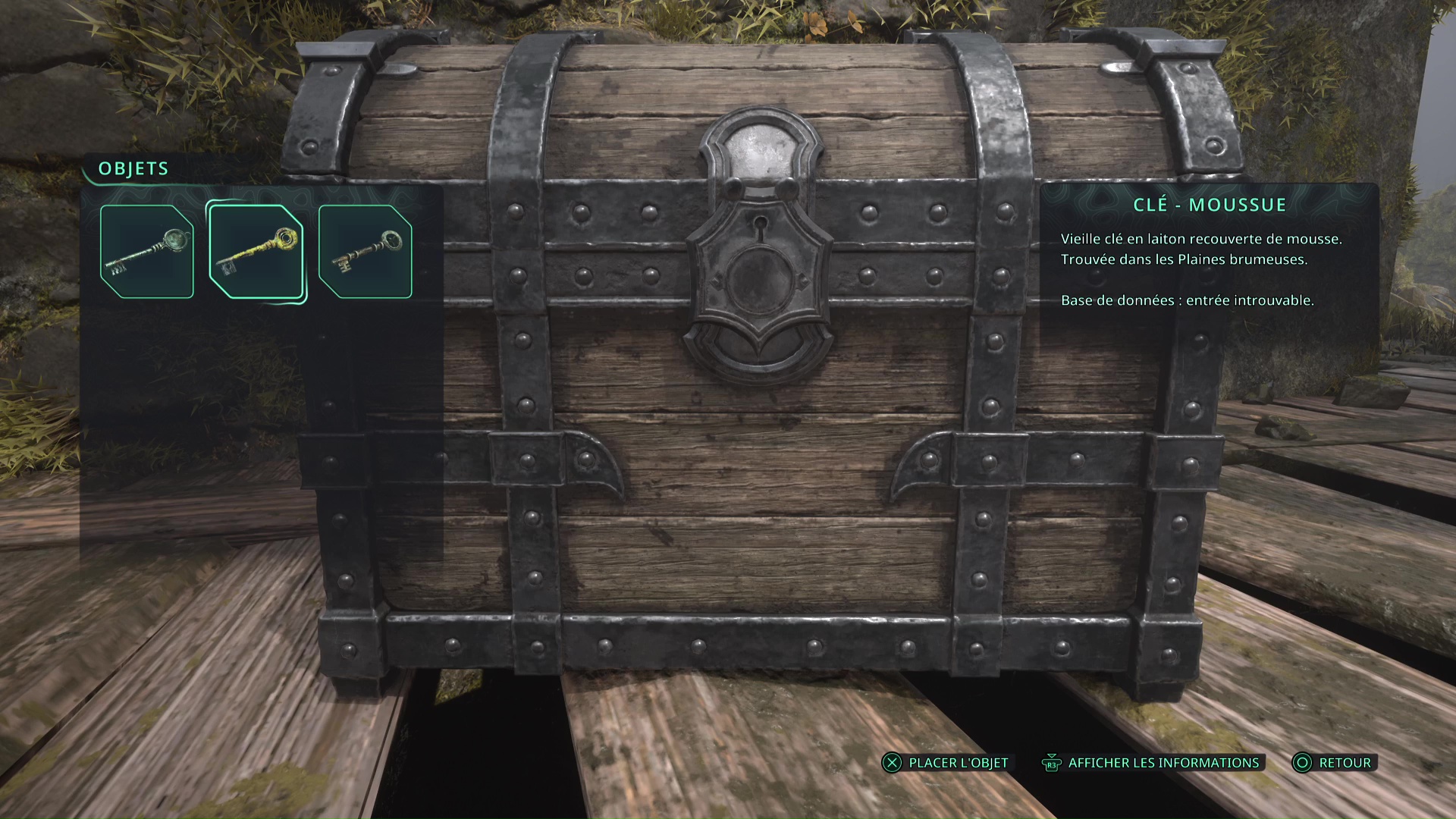 Franchissez le pont de bois devant vous pour rejoindre l’autre côté et allez directement à gauche au bout du chemin. Ensuite, retournez-vous pour apercevoir un point brillant par terre. Il s’agit d’une Clé – Rouillée.