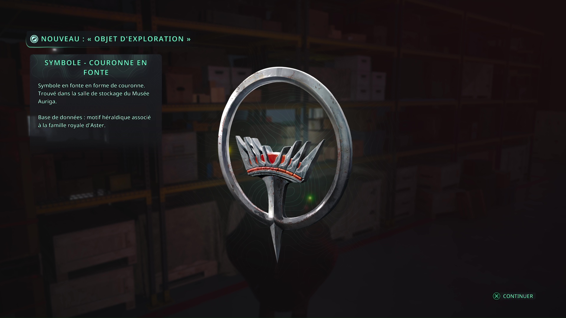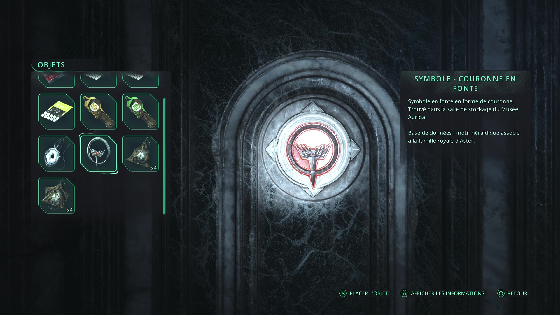 Revenez à l’entrée du Musée Auriga, où vous avez pivoté les statues d’Hollow Walkers. Sur la droite de la salle, quand vous faites face à l’entrée du musée, une porte est verrouillée. Placez le Symbole – Couronne en fonte pour l’ouvrir.