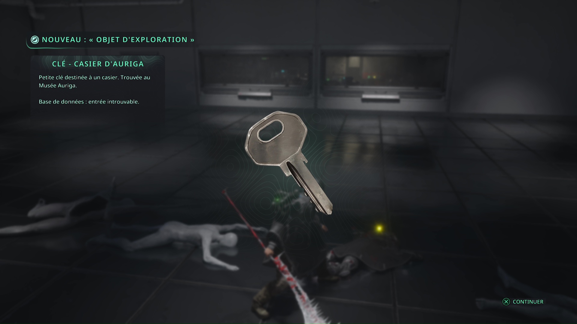 Ce mystère commence en ramassant une note à l’étage B3 du Musée Auriga. Pour la récupérer, il faut d’abord être entré dans la salle d’entraînement, accessible en actionnant l’interrupteur de maintenance de couleur bleue. A l’intérieur, éliminez les Hollow Walkers et examinez le point doré brillant par terre. Il s’agit de la Clé – Casier d’Auriga.