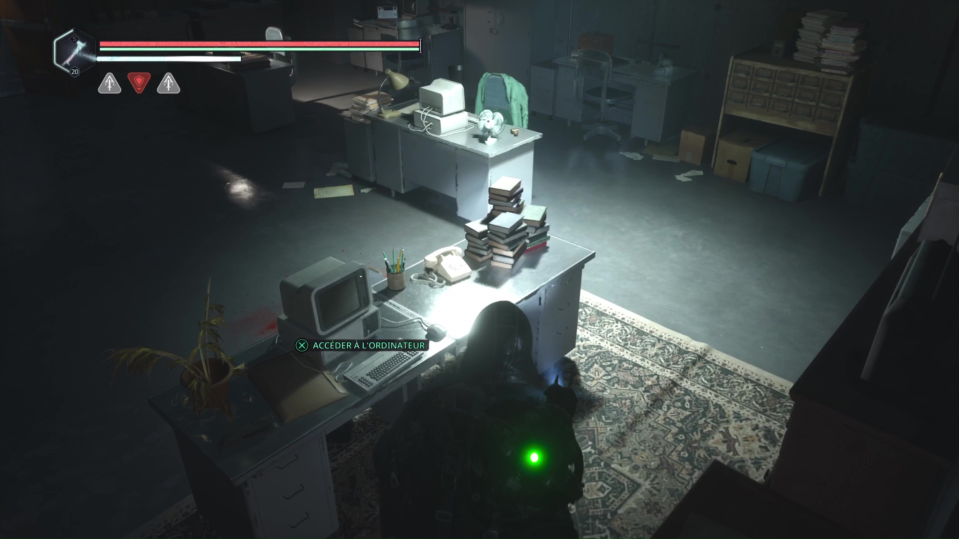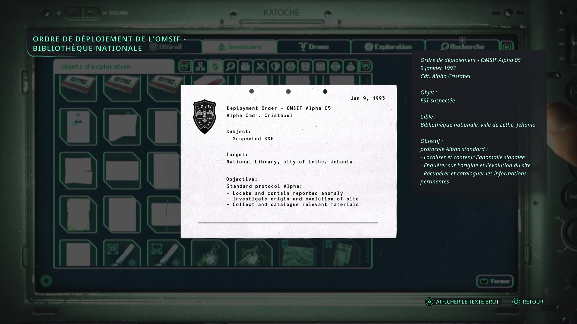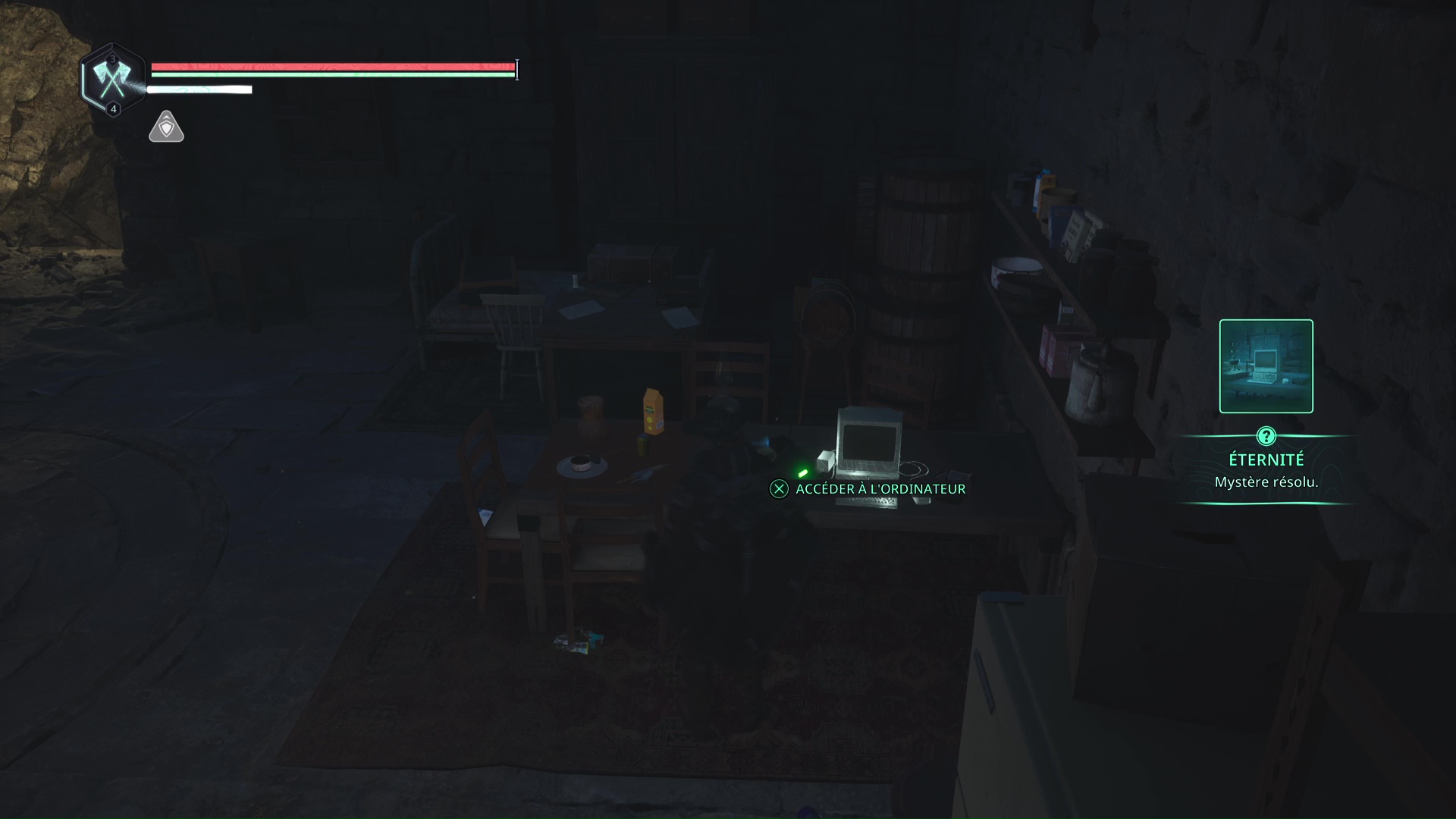 Bien caché derrière les cartons se trouve l’ordinateur mentionné par la note. Ensuite, il faut reprendre les informations de la Note – Doutes et regarder les numéros des ordres de déploiement de l’OMSIF de la Bibliothèque nationale de Léthé, de la Forêt de Senedra et des Marais d’Acasa, dans cet ordre.