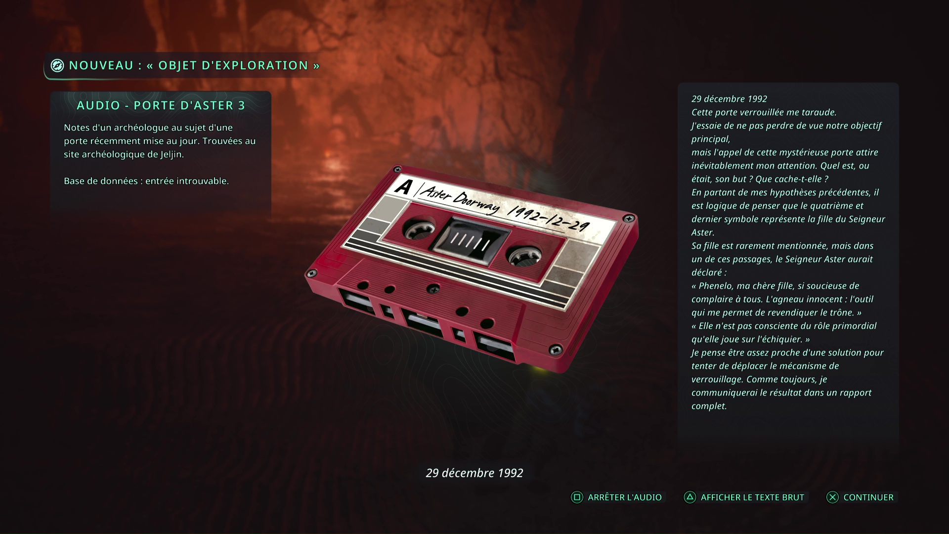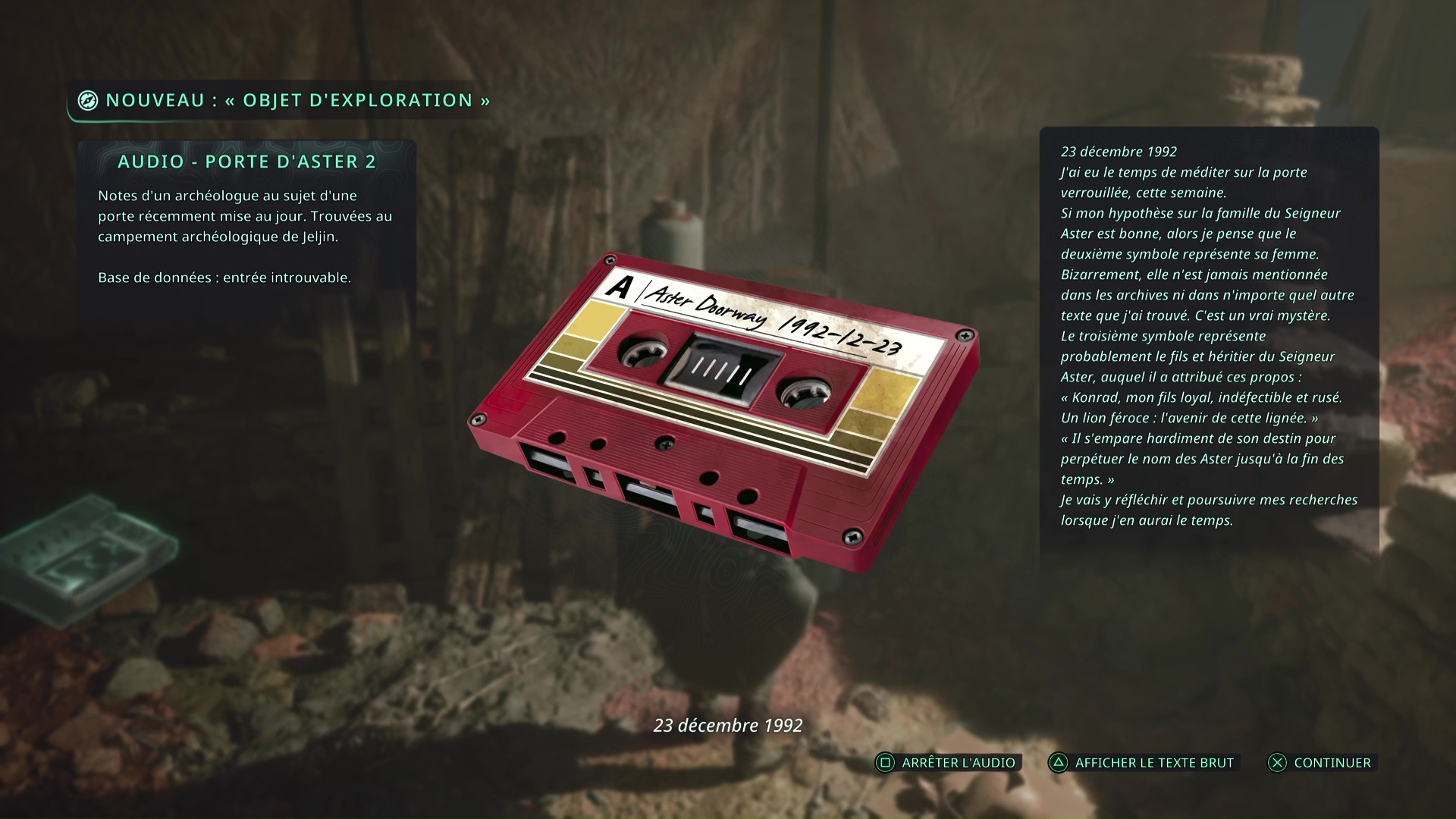 Enfin, l’Audio – Porte Aster 3 est à récupérer à l’emplacement de la boucle temporelle située dans les souterrains du campement archéologique. Il faut donc éradiquer la boucle.
