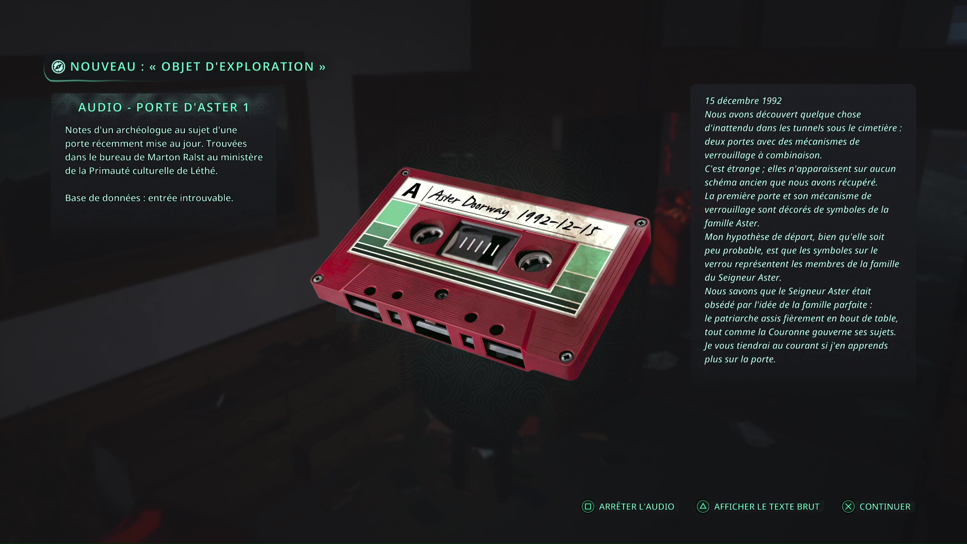 Pour trouver la combinaison normalement, il faut récupérer trois enregistrements. L’Audio – Porte d’Aster 1 se trouve à Lethé – Ministère de la Primauté culturelle. Dans le bâtiment, et dans la pièce où est pendu Marton Ralst, juste à droite en entrant et sur une étagère, vous trouverez l’enregistrement.