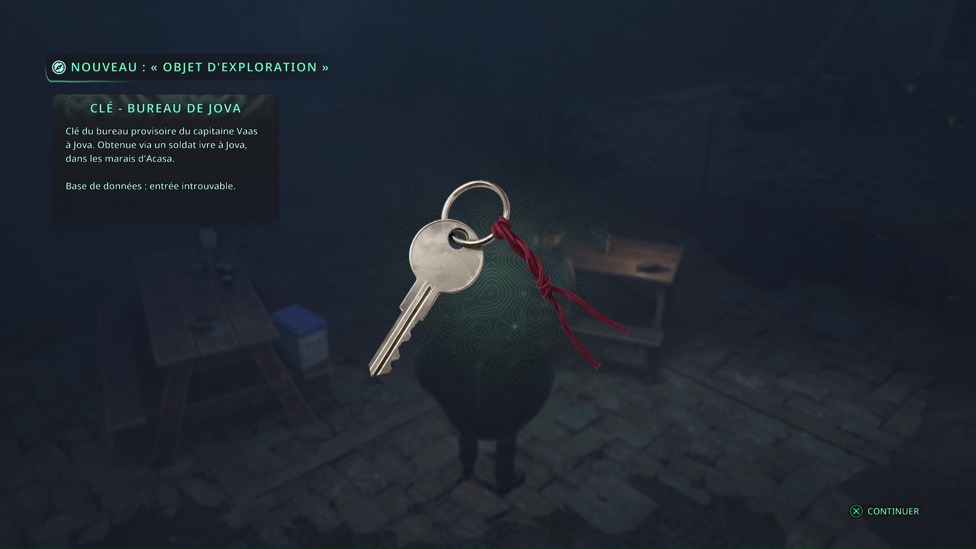 Revenez à Jova, donnez la bouteille pleine au soldat éméché, et il vous donnera enfin la Clé – Bureau de Jova.