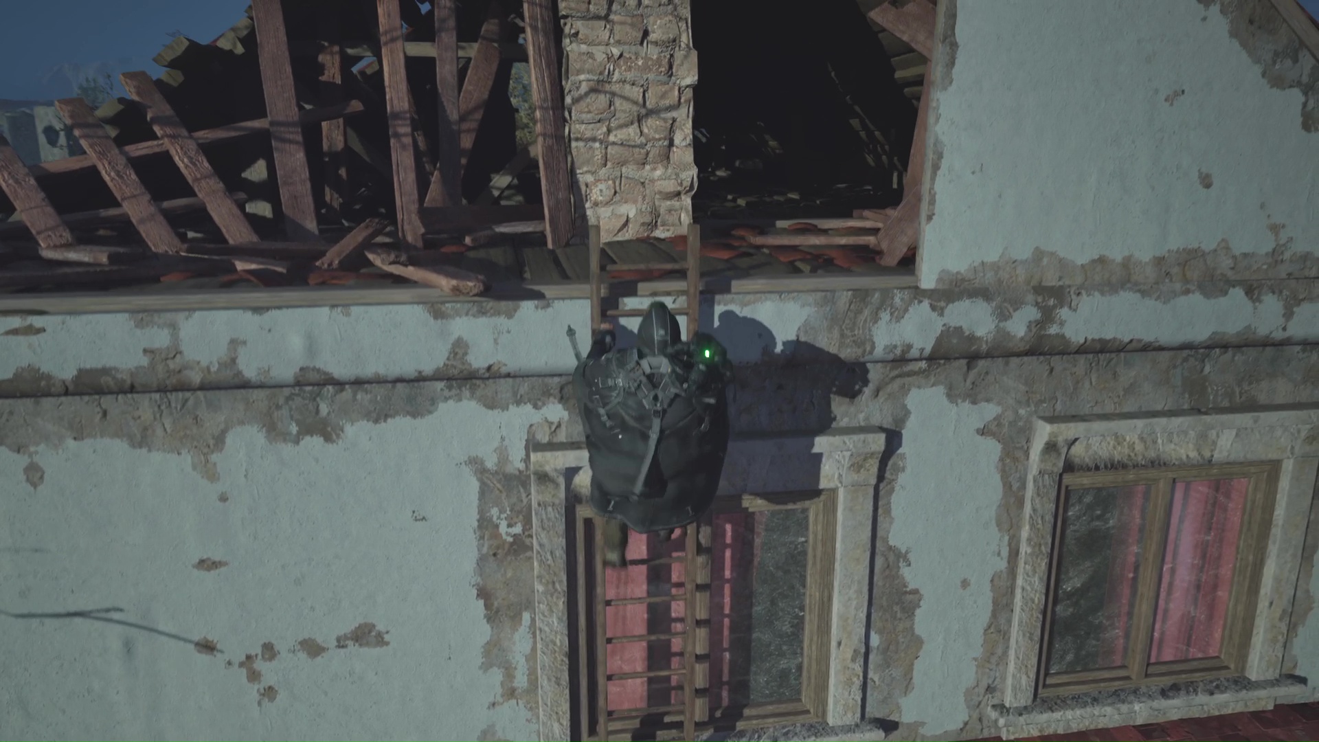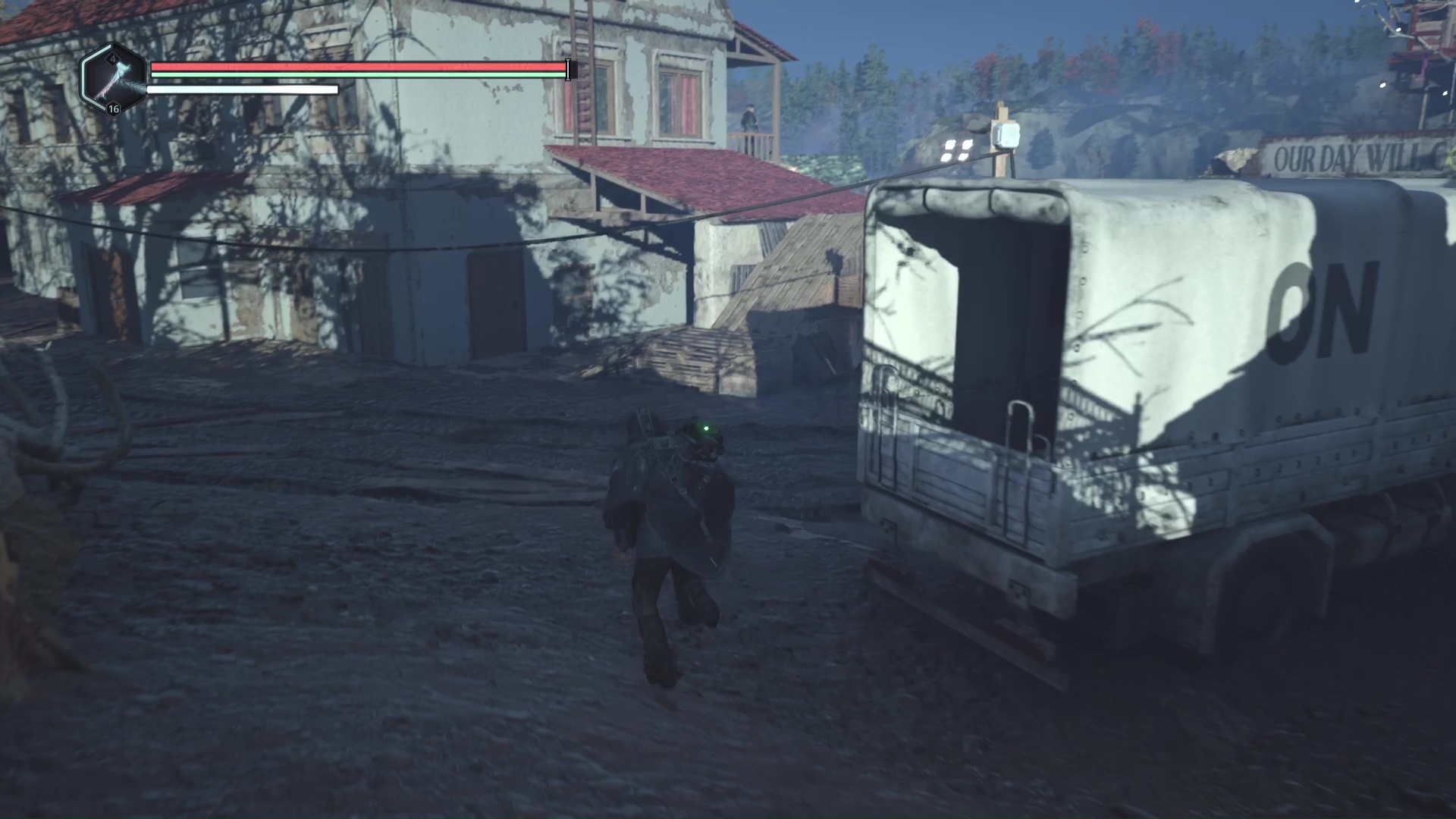 Allez ensuite sur la place principale. Pour accéder au bureau, il va falloir le contourner. Montez quelques palettes, grimpez à une échelle et traversez le toit. Laissez-vous tomber au bout pour arriver sur le balcon du bureau.
