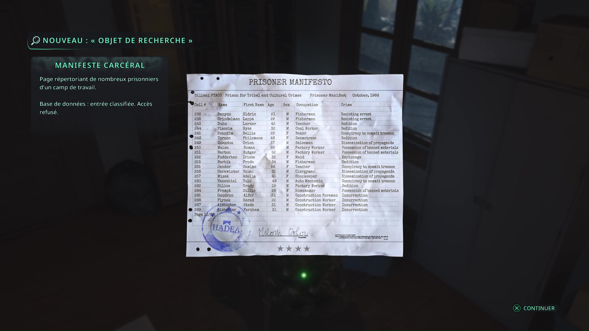 Déverrouillez enfin la porte grâce à la clé du capitaine et entrez. Ouvrir la porte suffit à valider le mystère mais il est important de fouiller la pièce pour récupérer l’objet de recherche Manifeste carcéral, le Collier du chagrin – Marchandage (Rang 3) et la Casquette – Sabinienne.