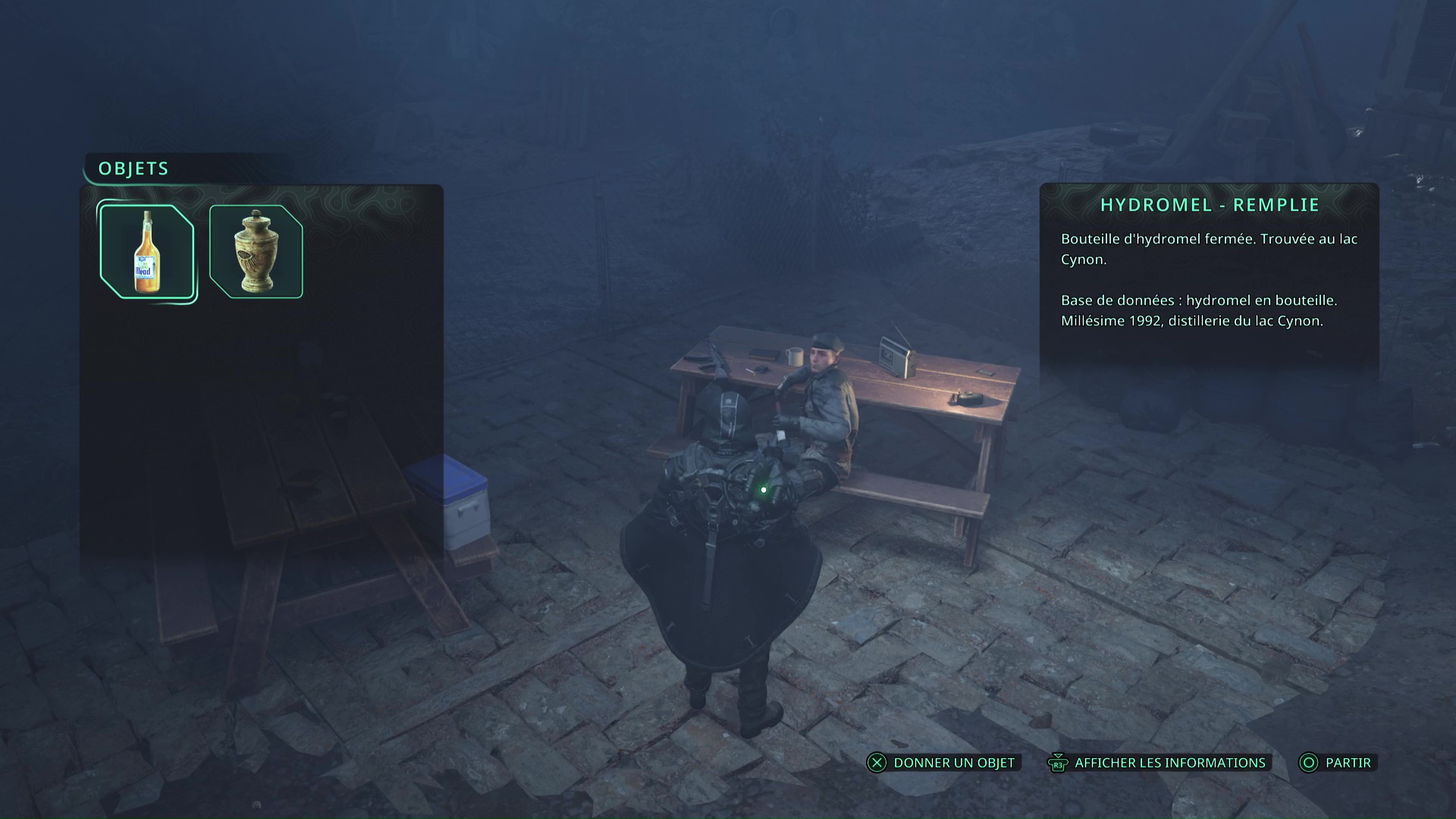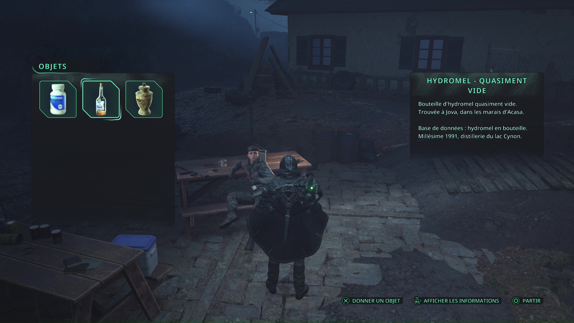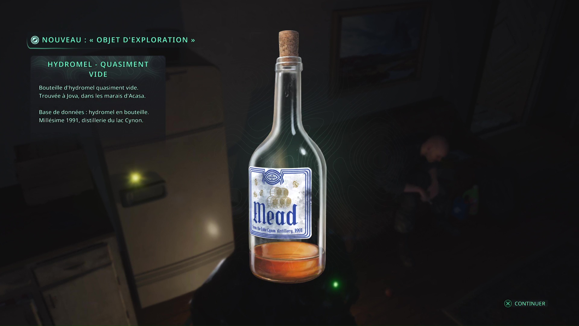 Pour entrer à l’intérieur de cette maison, montez grâce aux palettes et laissez-vous tomber sur le balcon. Ouvrez la porte, entrez, et allez au rez-de-chaussée pour ramasser l’objet brillant doré sur le frigidaire. Il s’agit donc d’une bouteille de Hydromel – Quasiment vide.