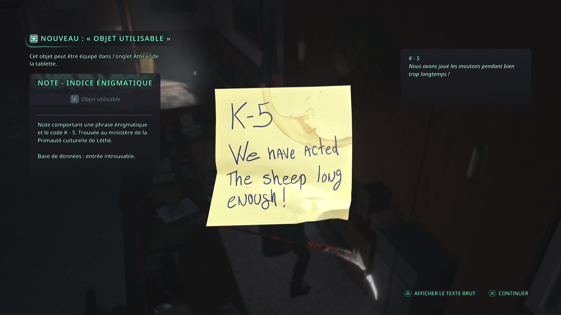 Une cinquième Note – Indice énigmatique « K-5 » se cache à Lethé – Ministère de la Primauté culturelle. Lors de votre remontée du rez-de-chaussée vers l’étage supérieur, vous passerez dans une réception avec deux ascenseurs en face du bureau. Passez justement derrière le bureau pour ramasser la note.