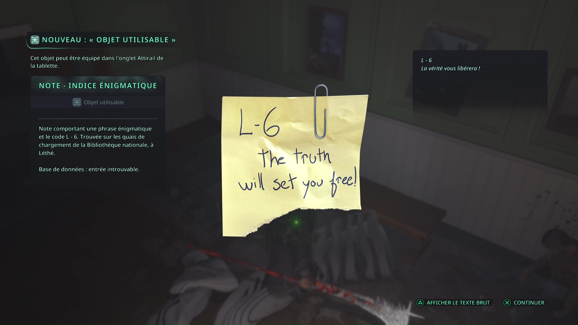 Une sixième Note – Indice énigmatique « L-6 » est à collecter au rez-de-chaussée de la Bibliothèque nationale de Lethé. Sitôt le premier Hollow Walker battu, regardez sur le banc sur votre gauche pour la trouver.