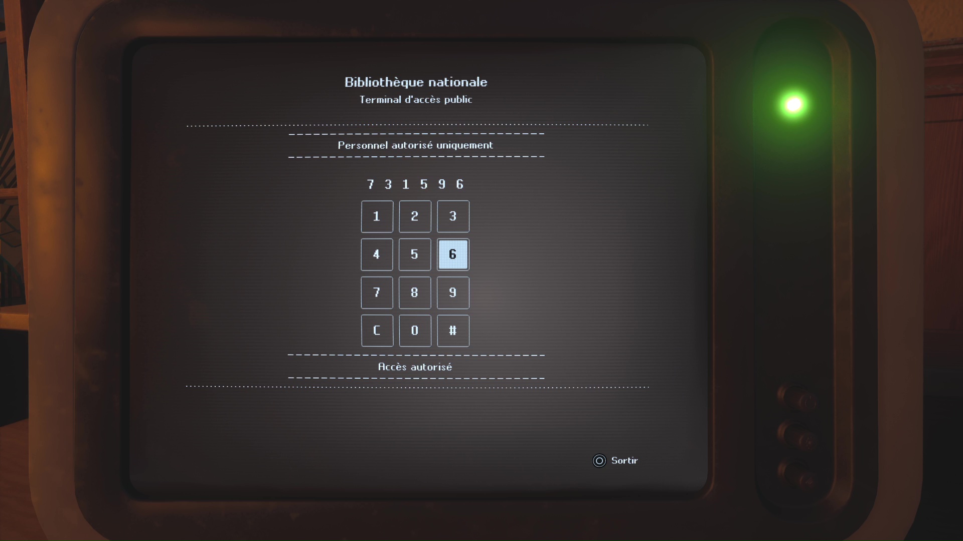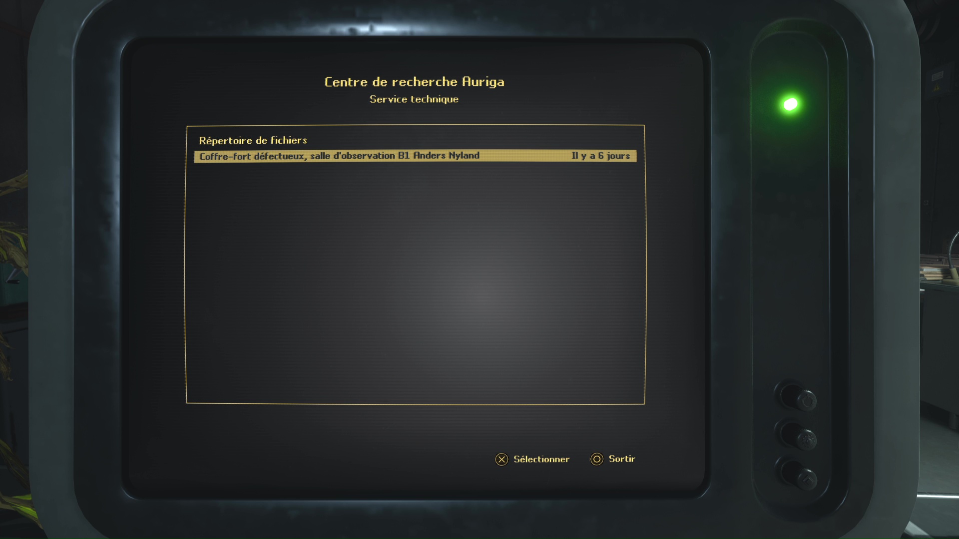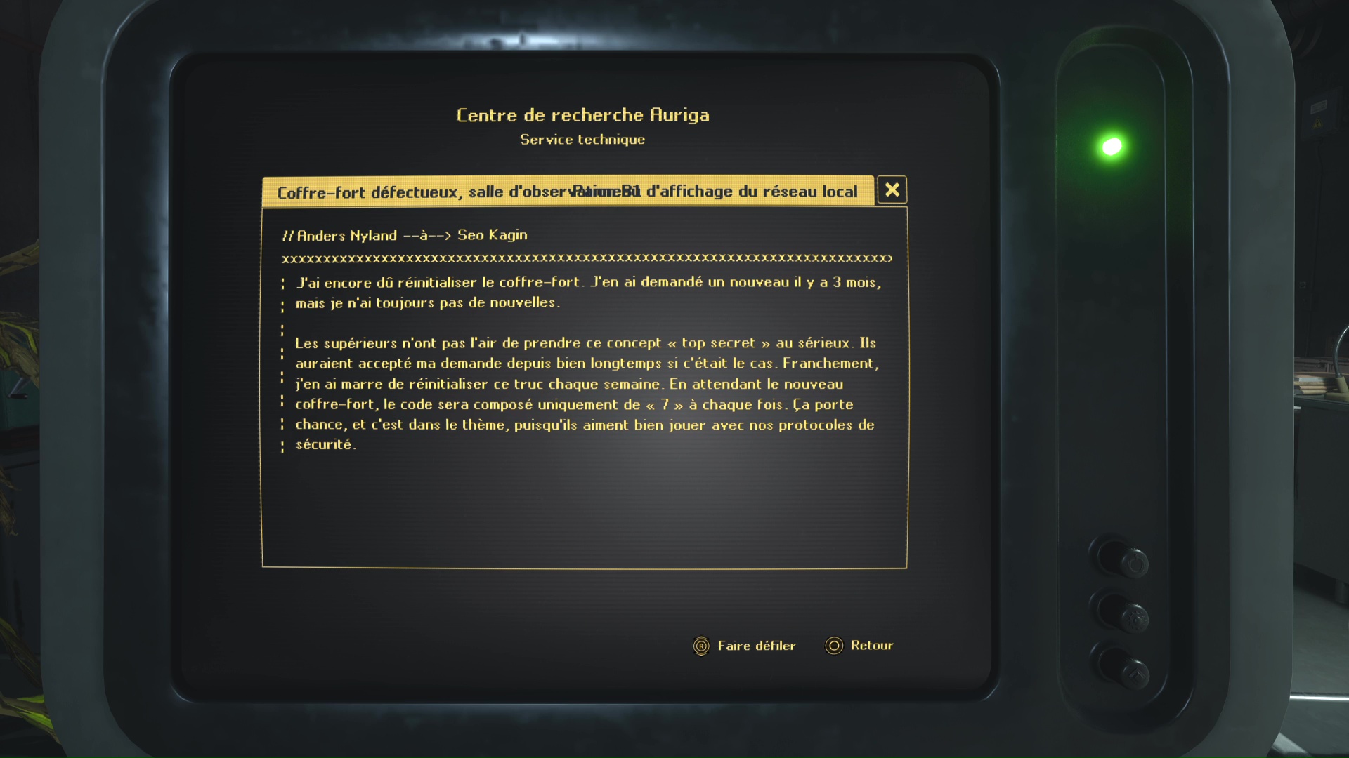 A l’étage B3 du Musée d’Auriga, et lorsque vous aurez activé l’interrupteur orange, revenez légèrement en arrière pour entrer dans la salle « Research Department » comme indiqué sur la plaque à gauche de la porte. A l’intérieur, allez au fond de la pièce et interagissez avec l’ordinateur. En cliquant sur le fichier, vous apprenez l’existence d’un coffre au niveau B1 dont le code est 77777.