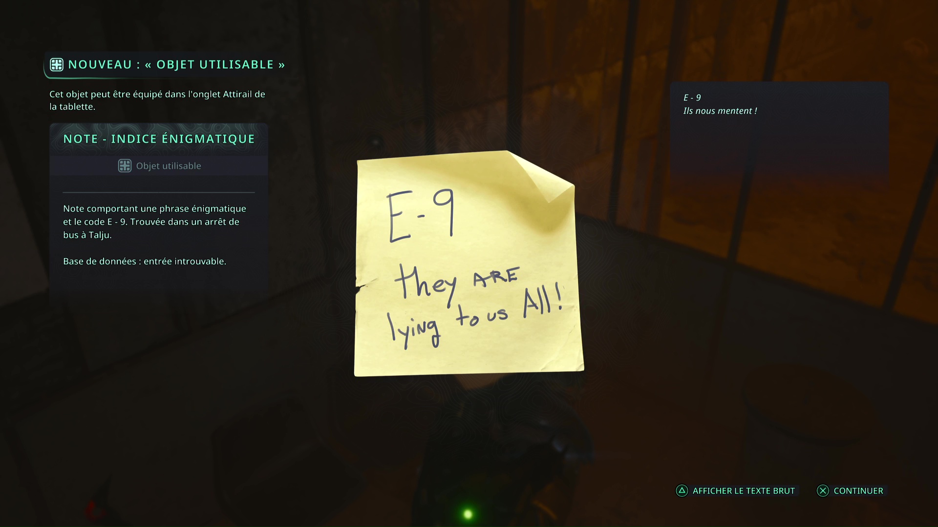 Une deuxième Note – Indice énigmatique « E-9 » est à récupérer dans un abribus collé au parking de Talju.