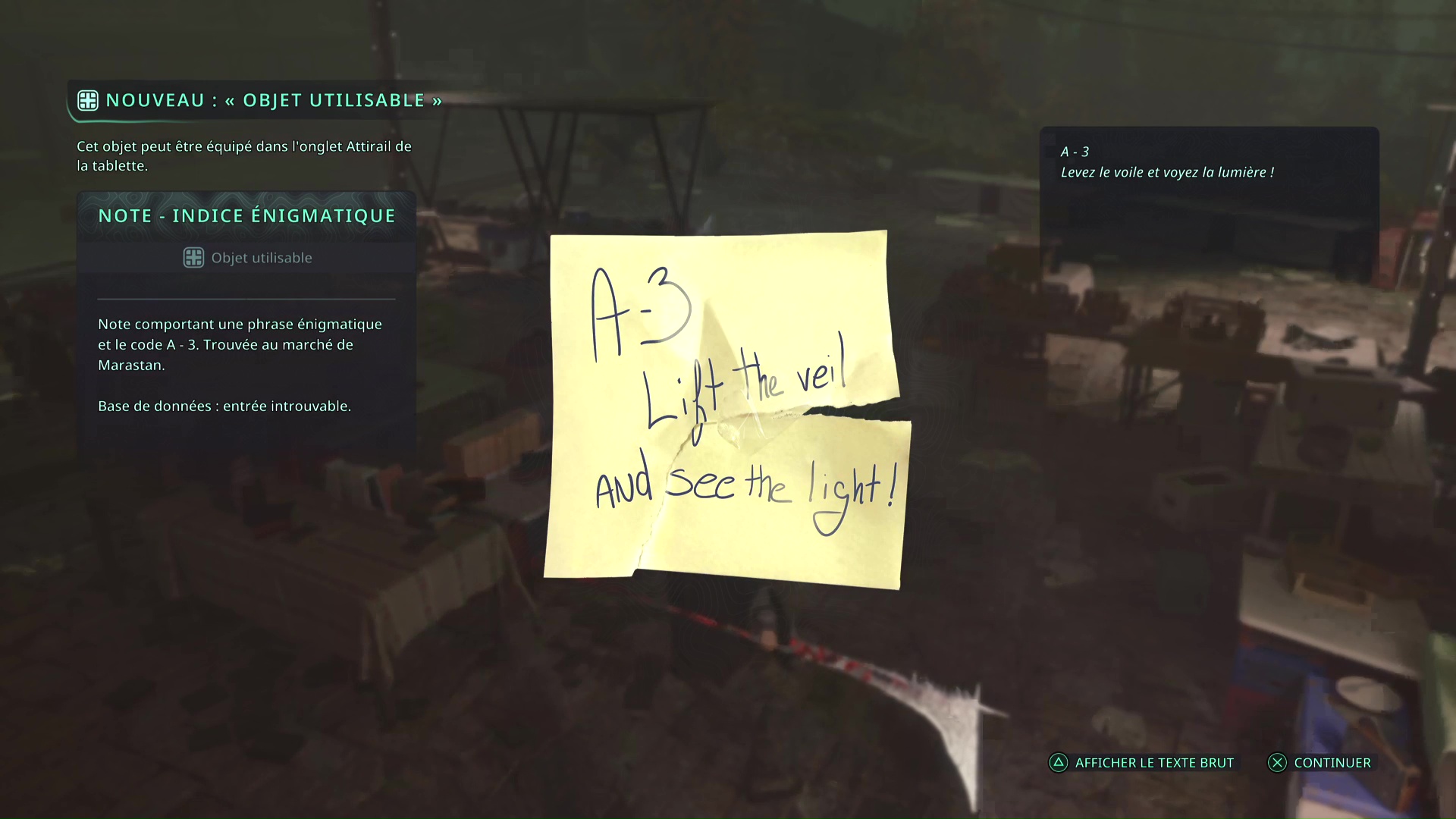 Une troisième Note – Indice énigmatique « A-3 » repose sur l’une des tables de la place du marché de Marastan, en plein centre-ville.