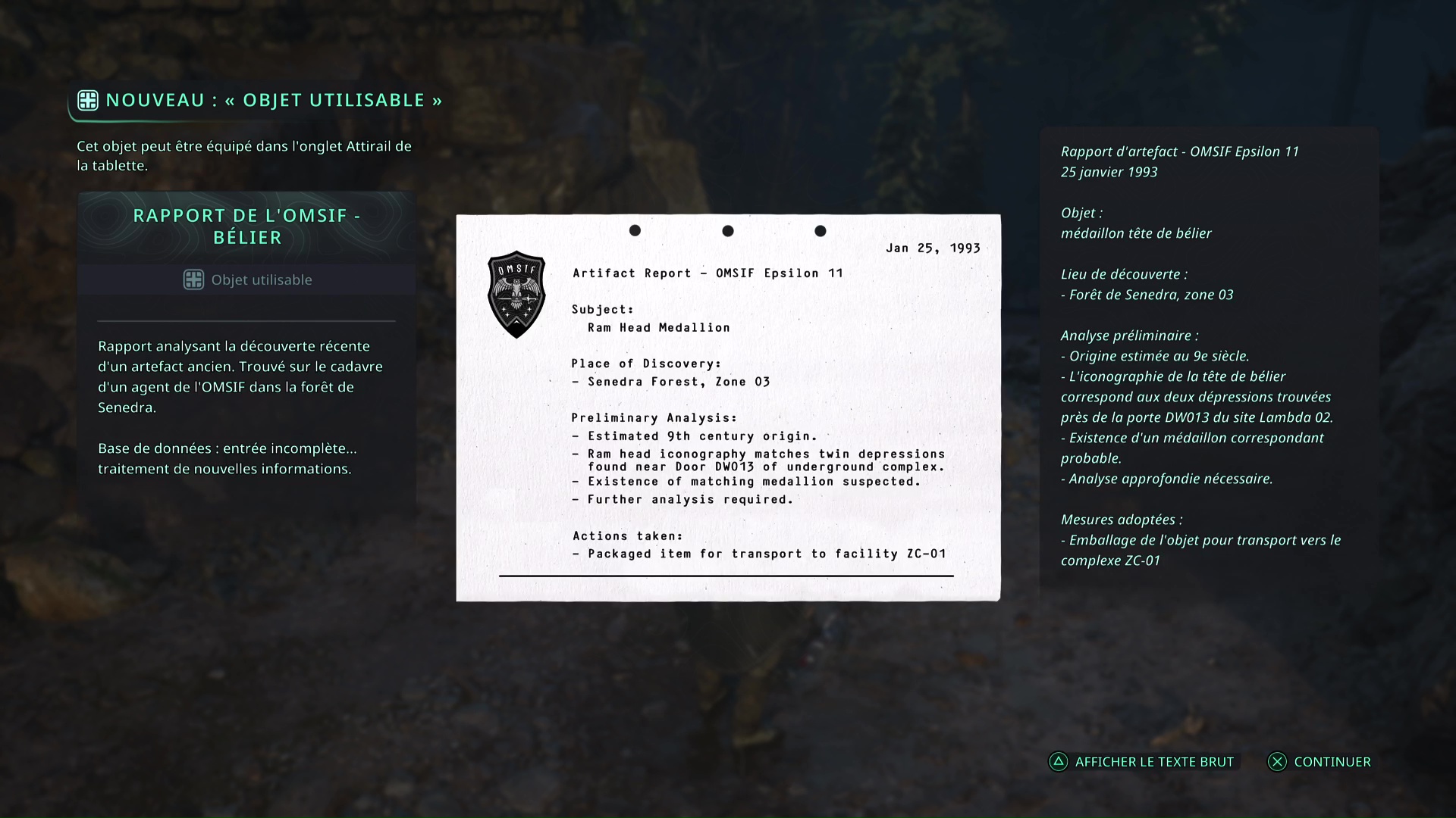 Le deuxième médaillon se situe sur votre chemin du retour au VAB, le véhicule blindé qui vous attend. Le passage précédemment bouché est dégagé, avec un cadavre en plein milieu. Ramassez l’objet brillant dessus : il s’agit du Médaillon Bélier – Pourpre et du Rapport de l’OMSIF – Bélier.