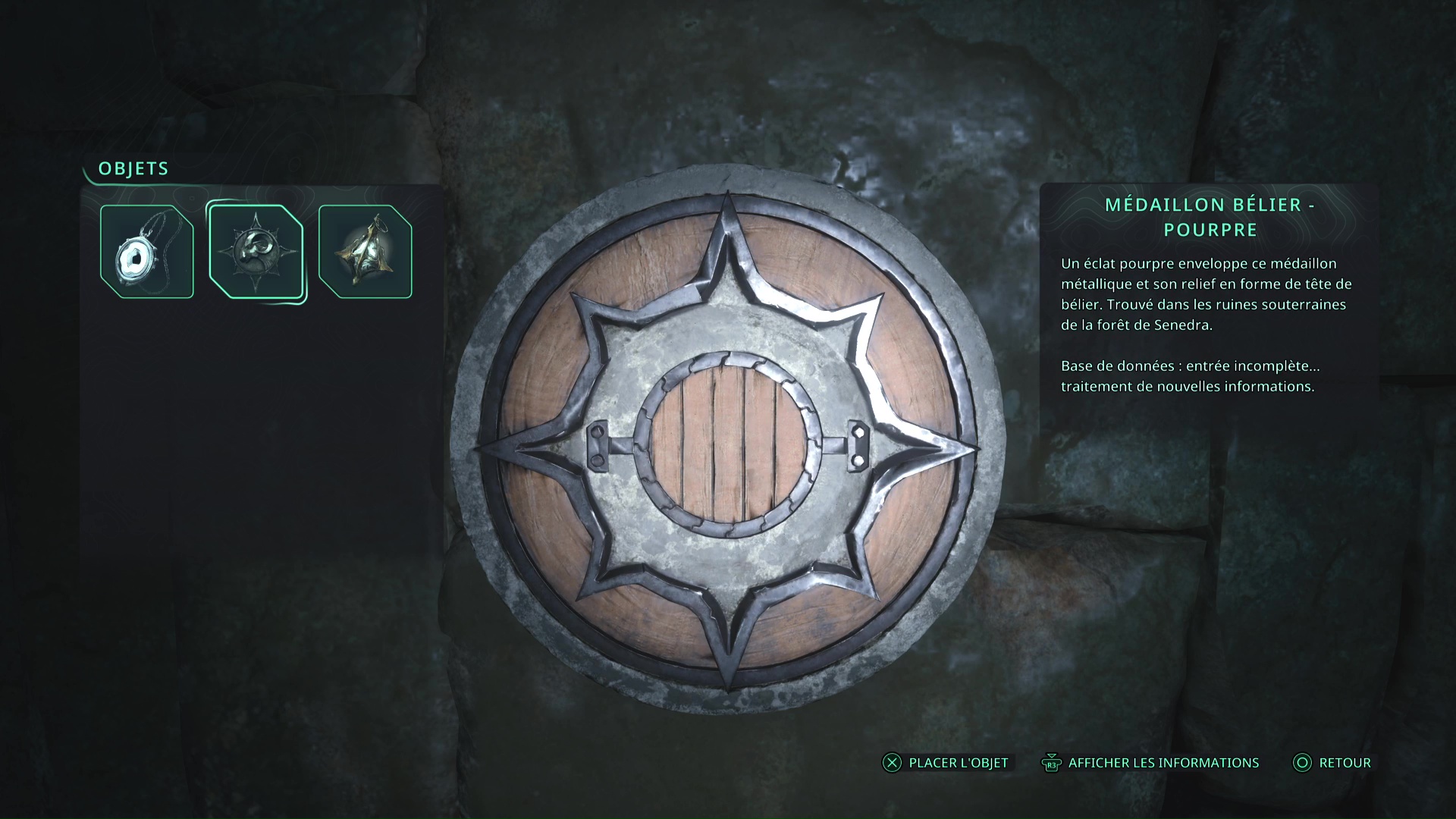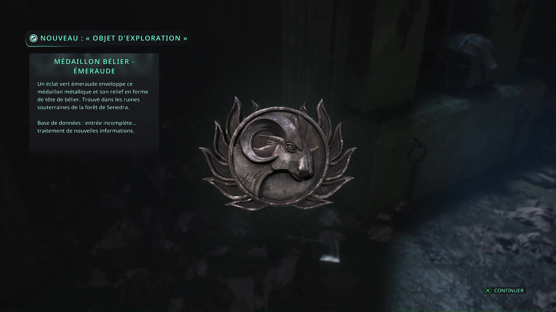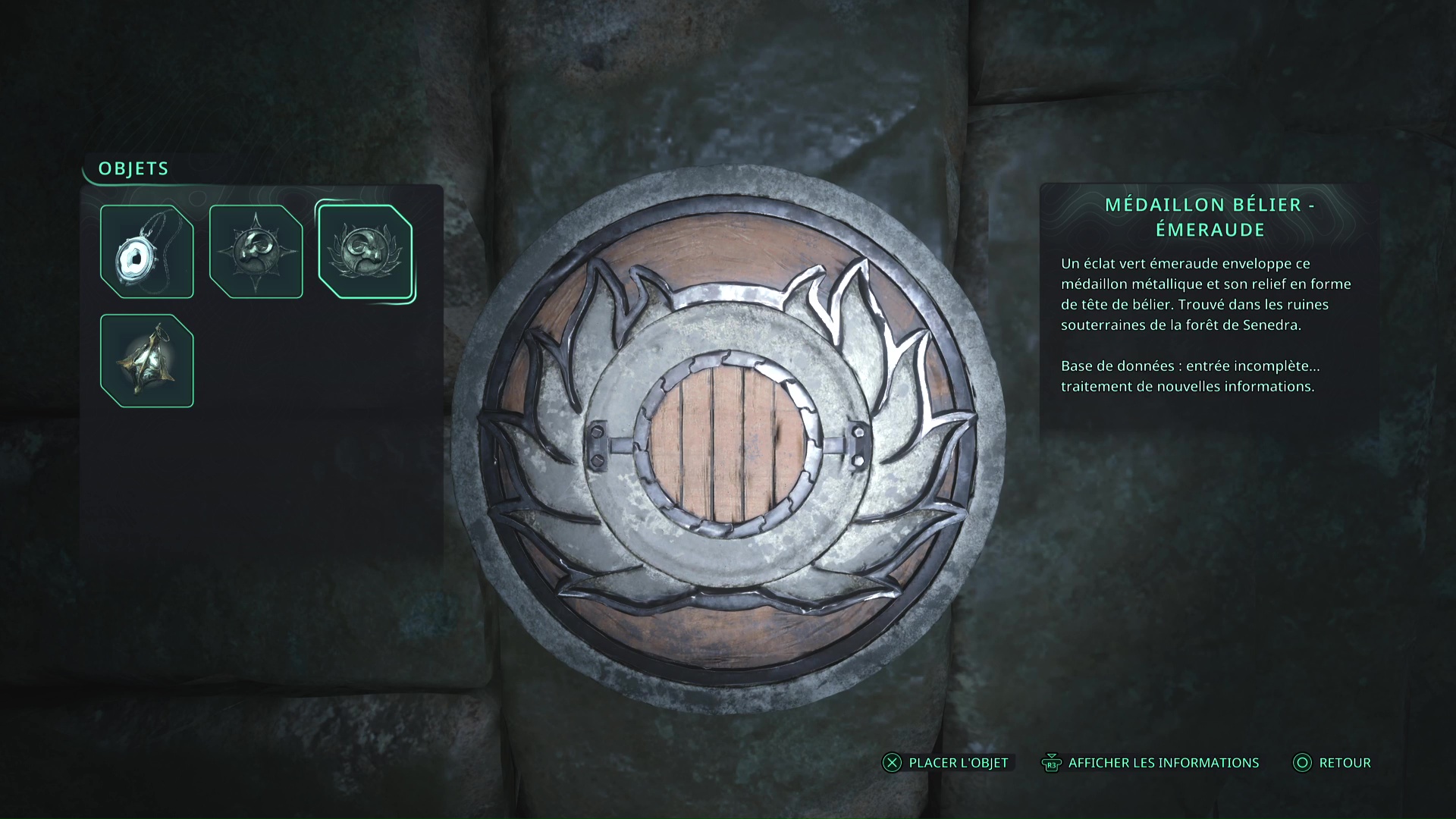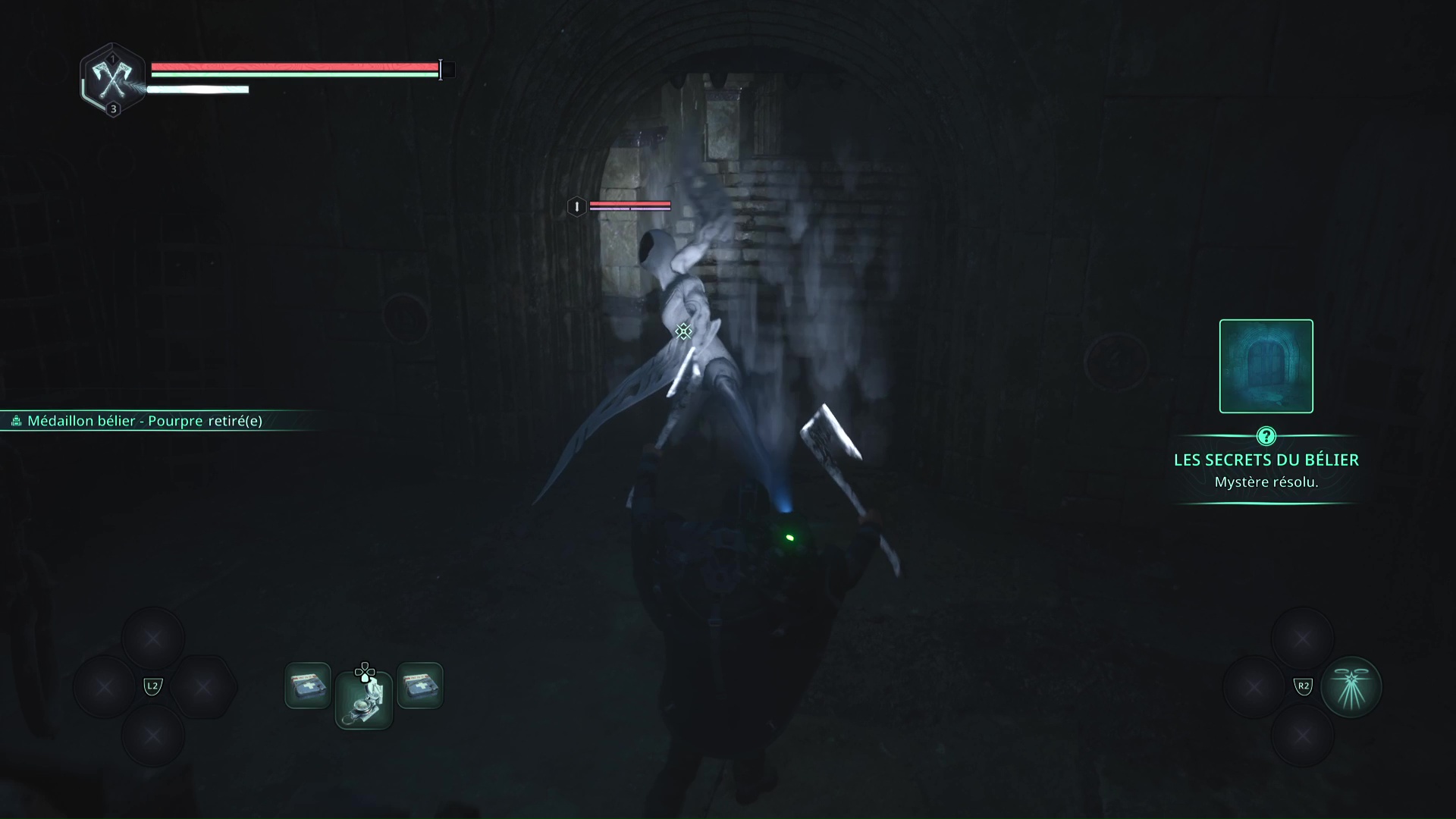 Le premier se trouve lui aussi dans les souterrains, et quelques salles plus loin. Dans une pièce éclairée et dans laquelle se trouvent deux ennemis, regardez au sol, sur votre gauche, pour y apercevoir un objet brillant. Ramassez-le, il s’agit du Médaillon Bélier – Émeraude.