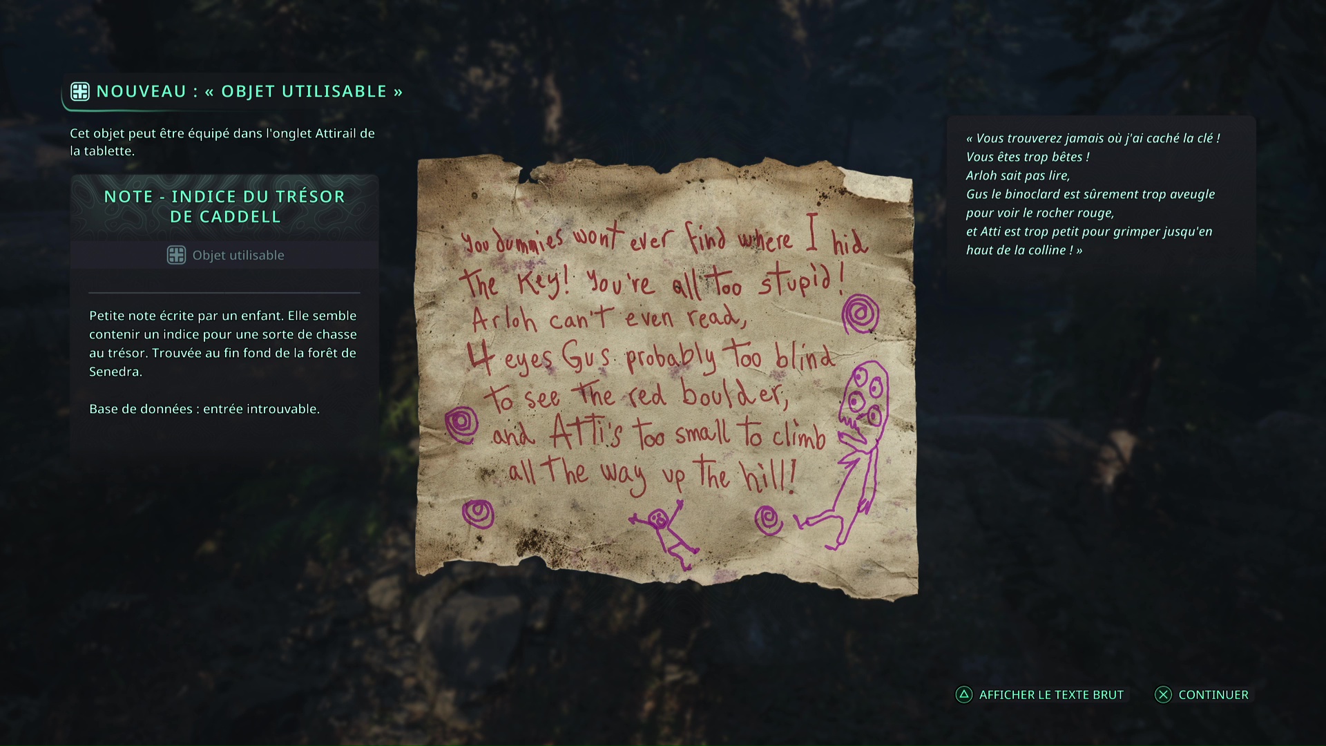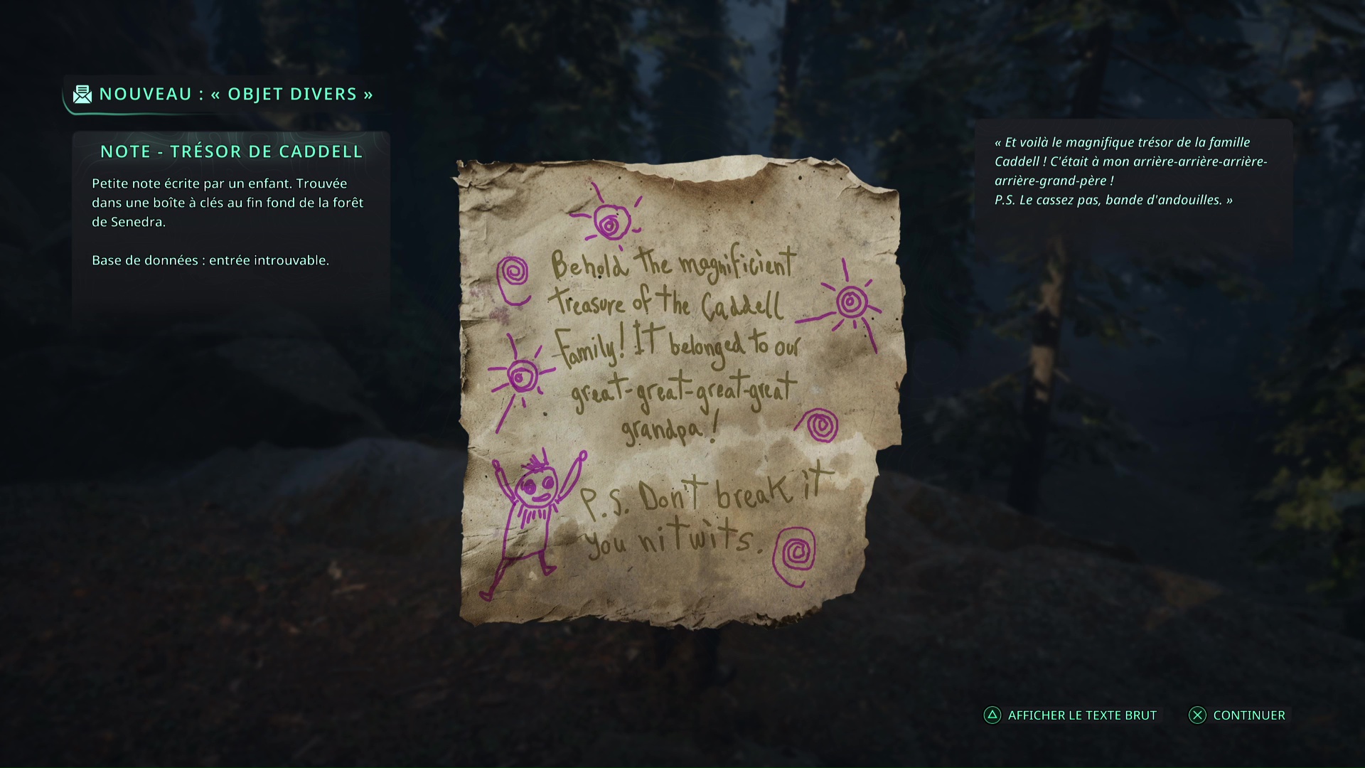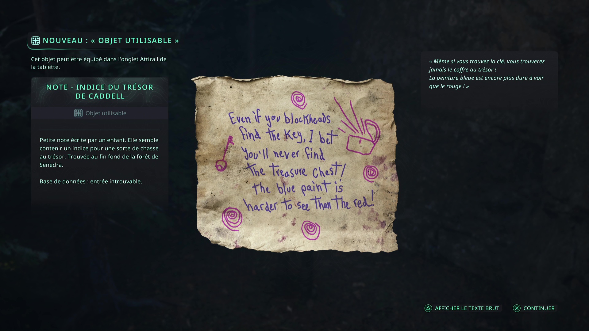Il s’agit d’une chasse au trésor à mener dans la forêt de Senedra, où vous récupérerez des notes ainsi qu’une clé pour mettre la main sur un coffre. Dans les bois où résonnent les carillons, en vous éloignant du chemin, vous trouverez un rocher peint en jaune sur lequel est posé la Note – Indice du trésor de Caddell.
