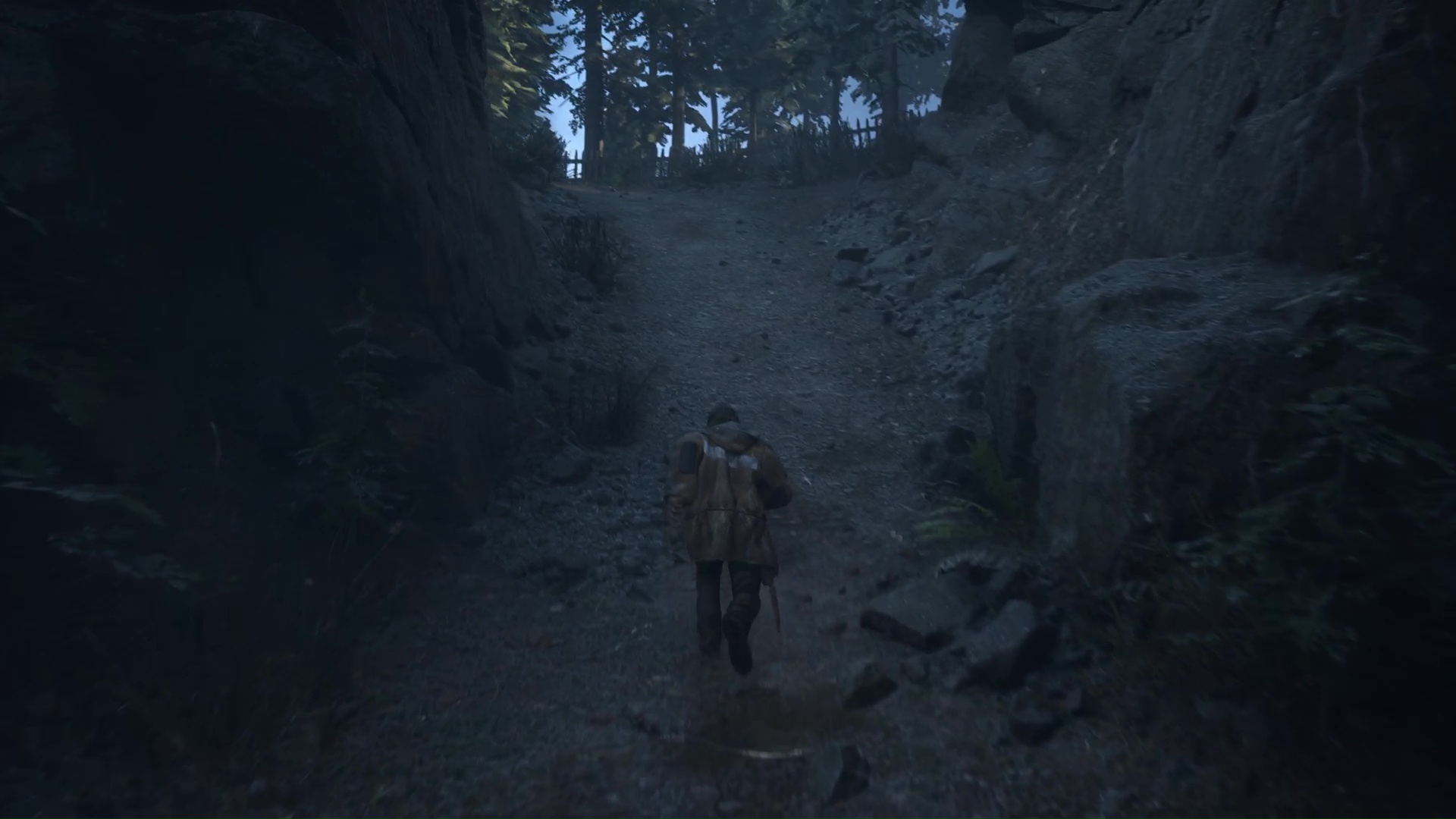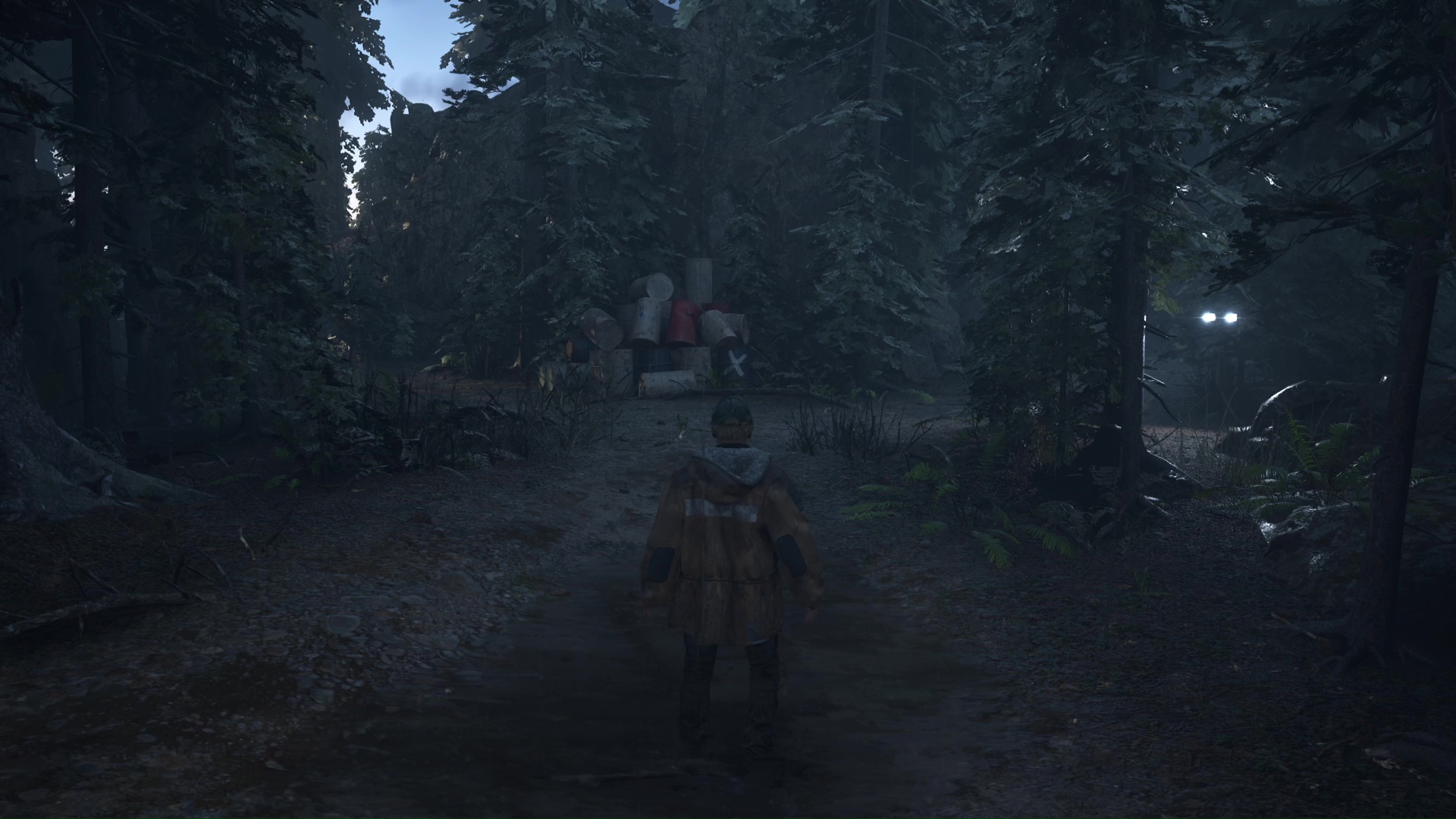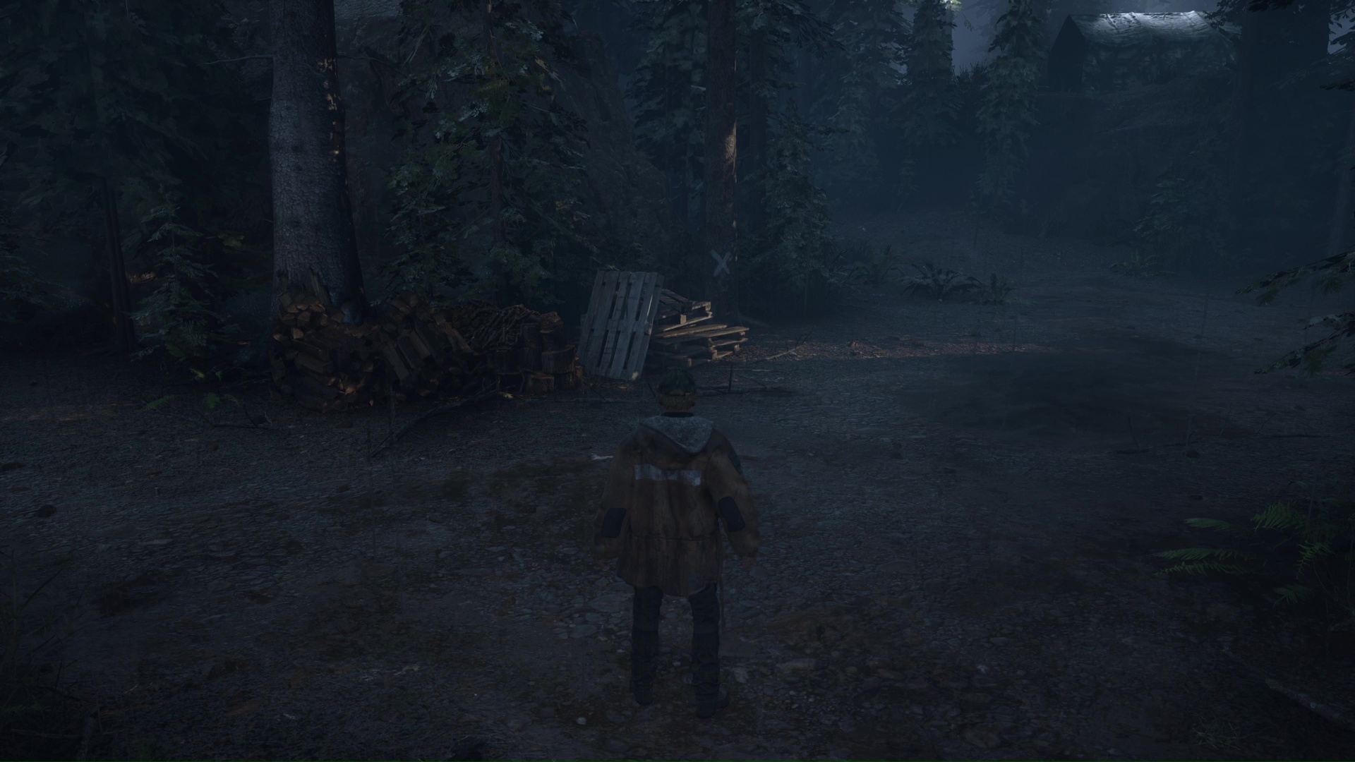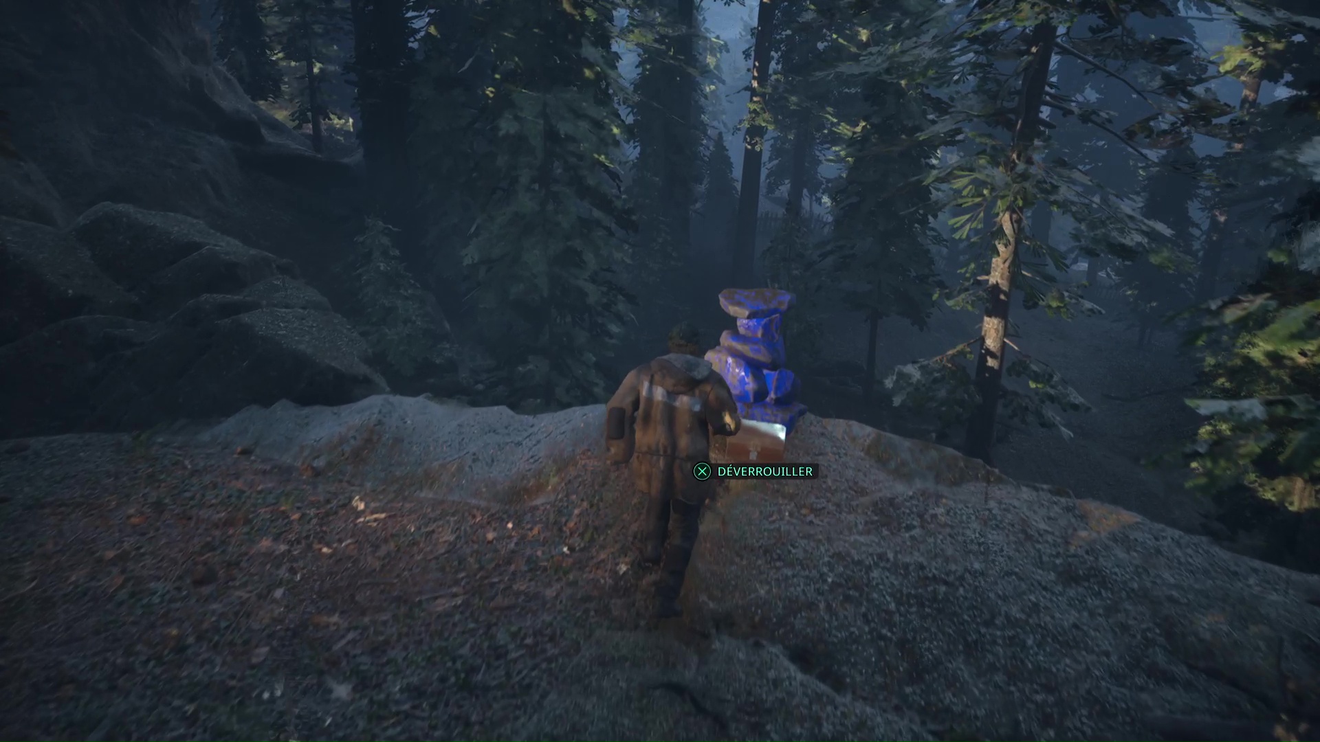 Dernière étape, toujours dans les bois peints d’une croix blanche, notez l’arbre marqué près d’un tas de palette. Face à lui, allez sur sa droite et grimpez le chemin et continuez de serrer à droite jusqu’à tomber d’un rebord. Vous apercevrez alors un rocher peint en bleu.