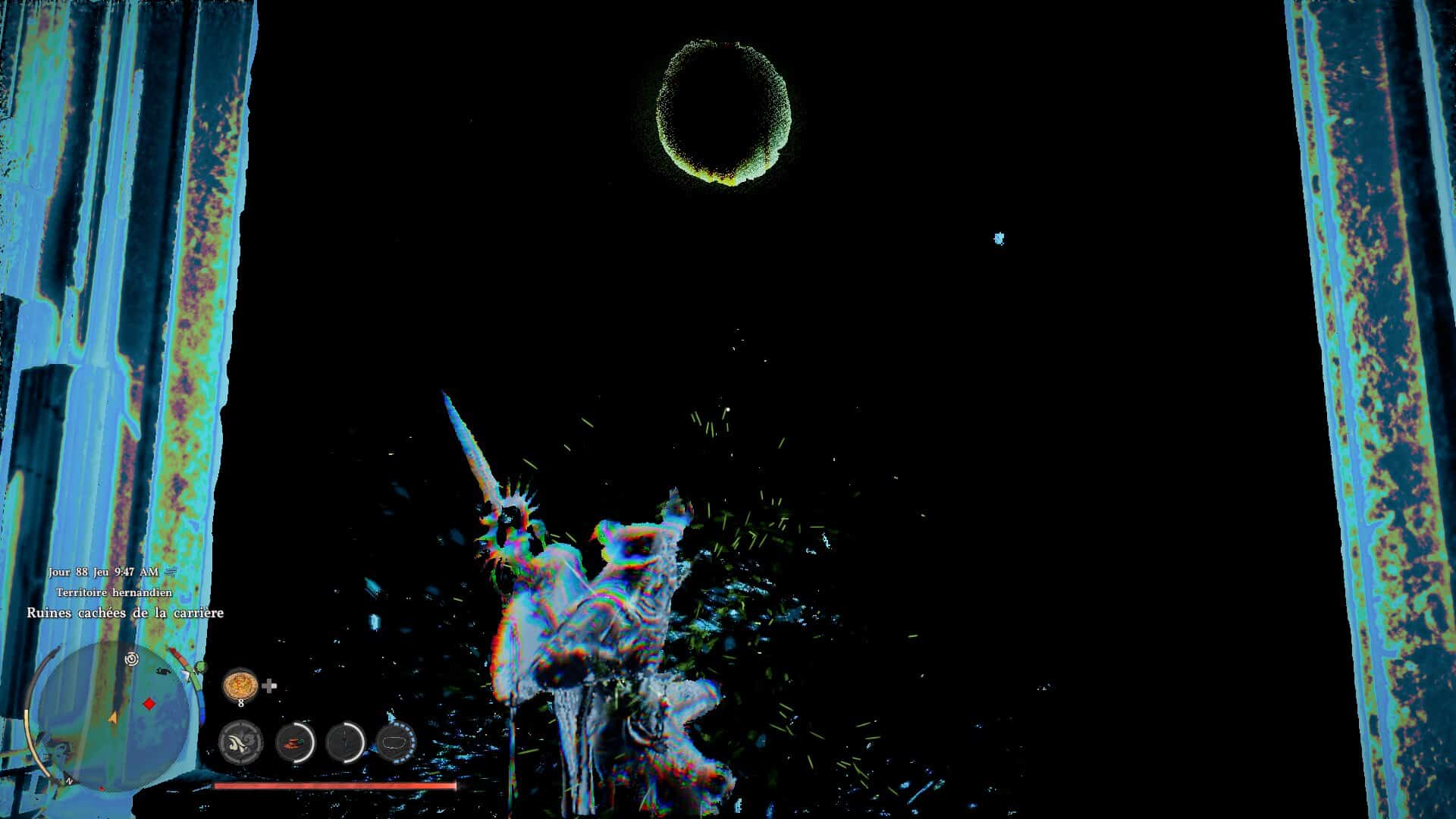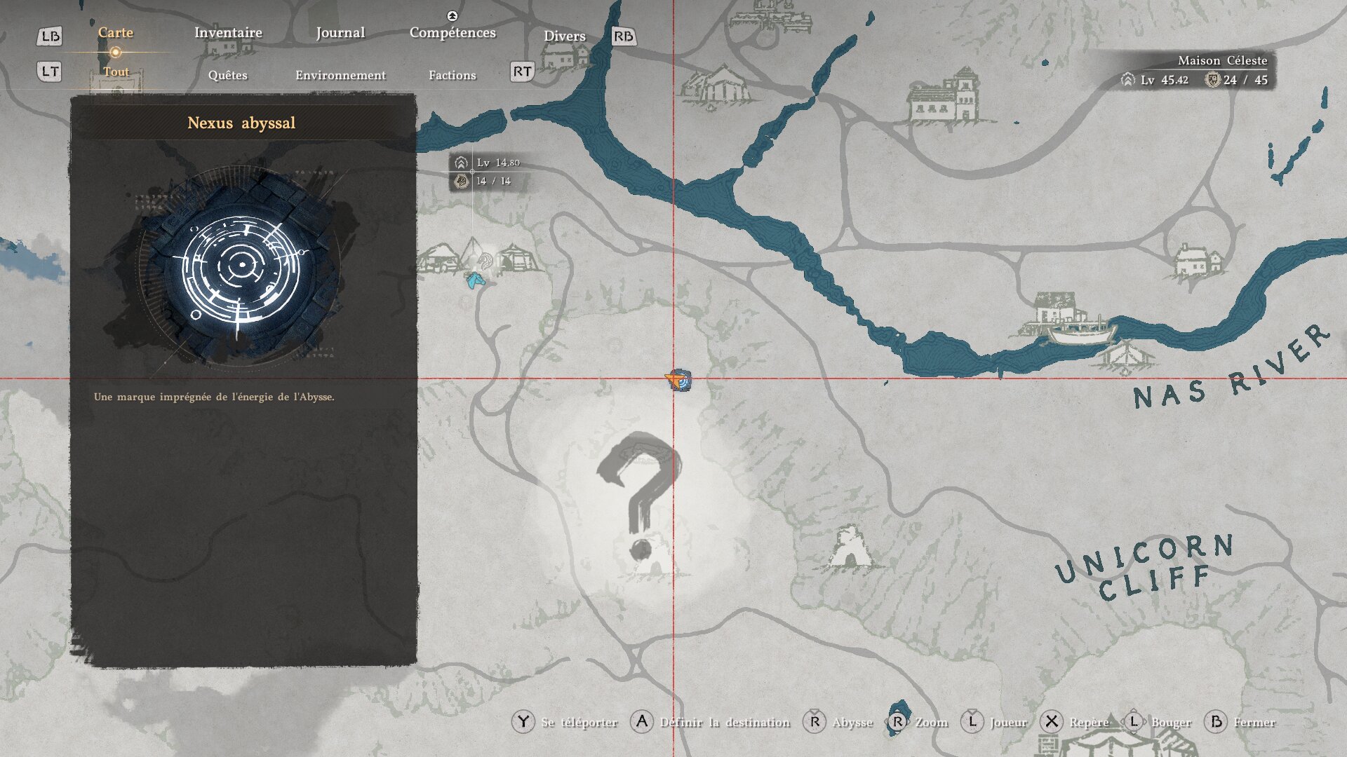 Pour trouver ce Nexus abyssal, sans doute le plus important de tout Crimson Desert, rendez-vous d’abord dans votre camp, à l’est de ce dernier. Vous trouverez sur votre map un point d’interrogation menant dans une prairie. Pour trouver le Nexus abyssal, rendez-vous près des arbres au bord de la falaise à l’endroit indiqué sur la map ci-dessous. Vous trouverez le dispositif, mais caché par des ronces. Levez donc votre épée vers le ciel et amassez de la lumière pour la refléter sur les ronces, afin qu’elles brûlent. Le Nexus abyssal se trouve alors en dessous.