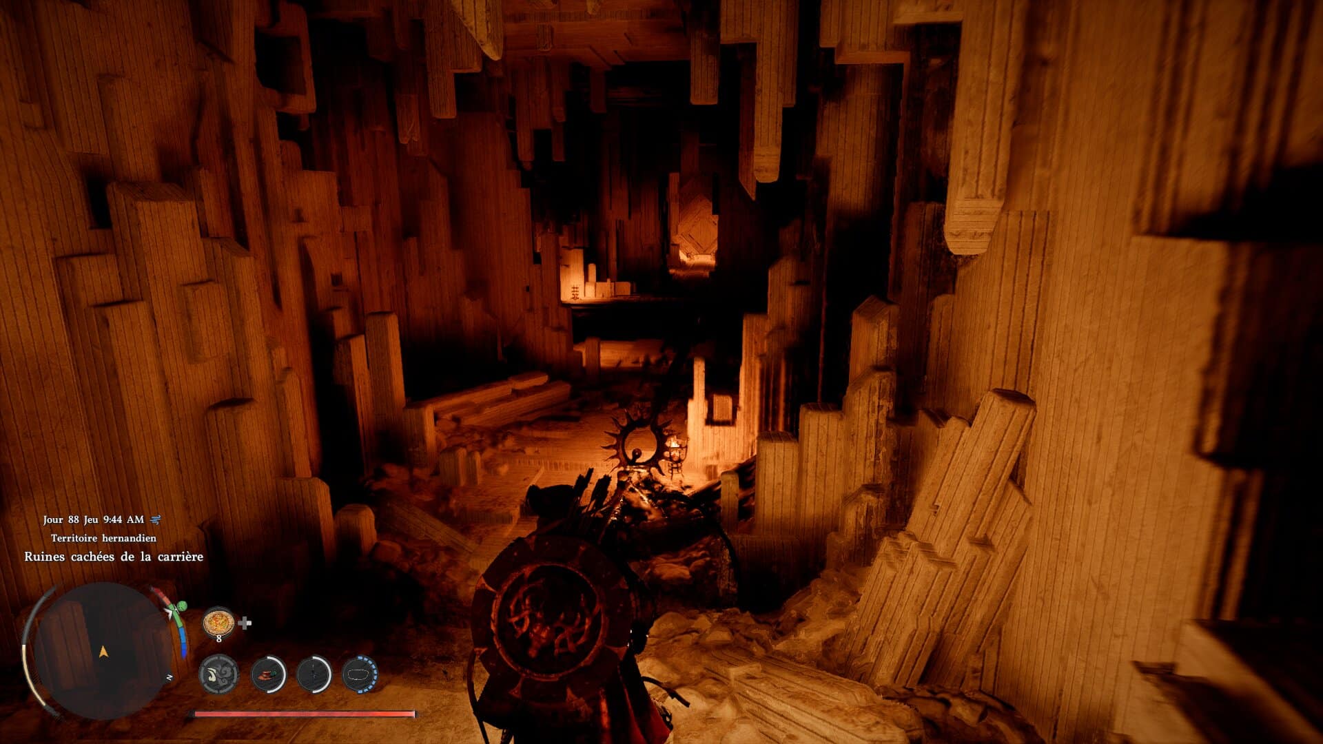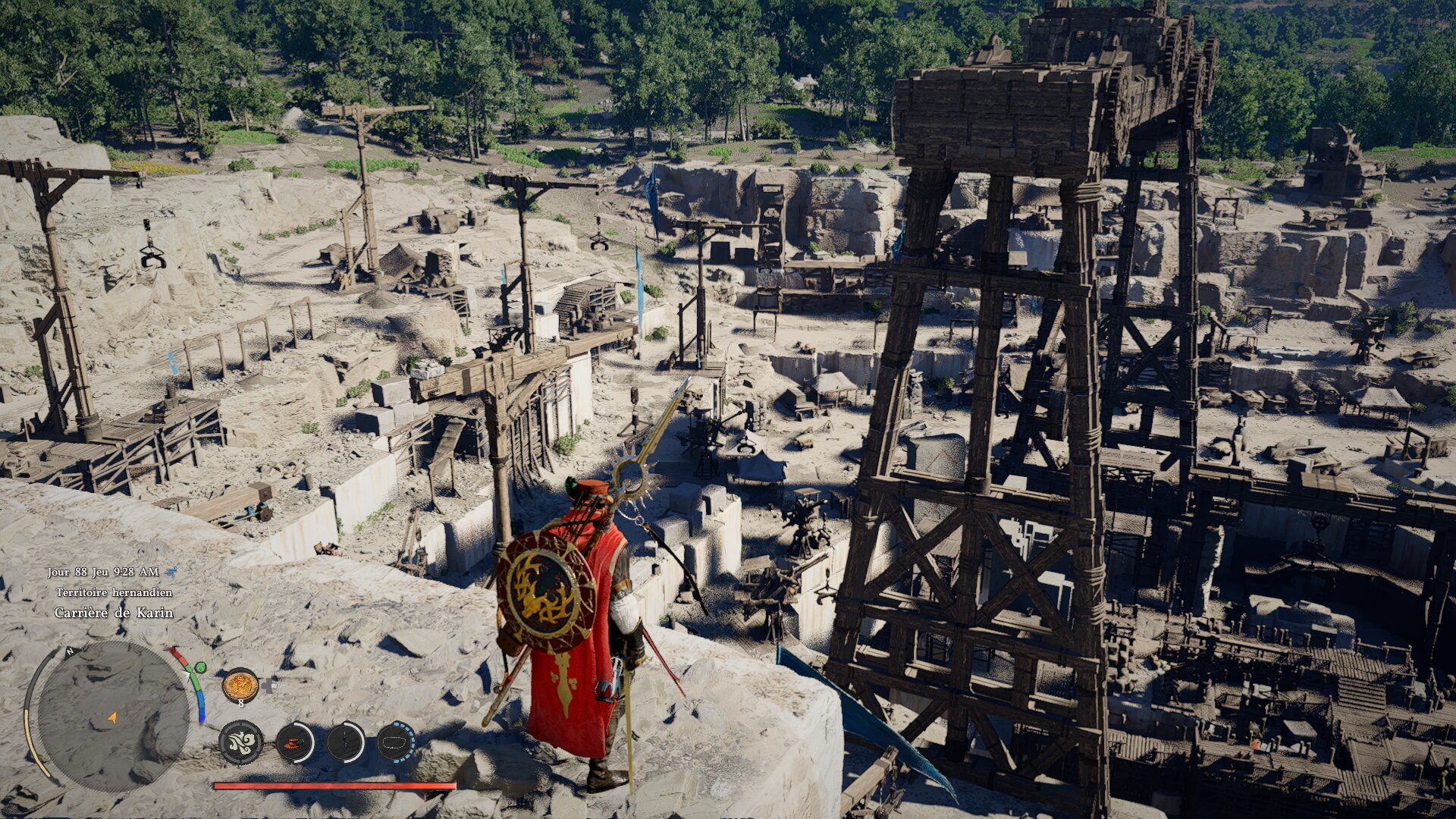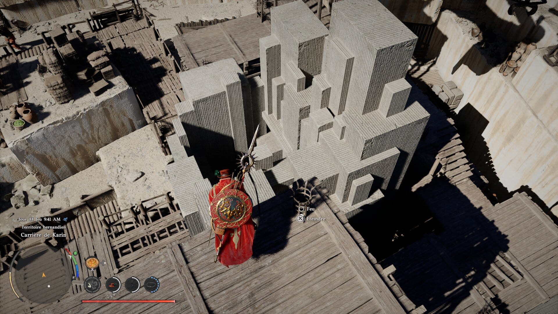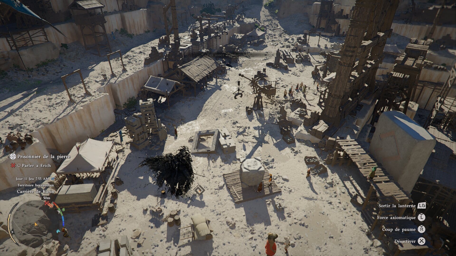 Une fois celle-ci tombée, un PNJ vous donnera un accès à l’ascenseur de la grande grue. Montez, et contrôlez la grue jusqu’à enlever la grande stèle qui trône au milieu de la carrière. Sortez, et plongez dans le trou qui était autrefois bouché par la stèle.