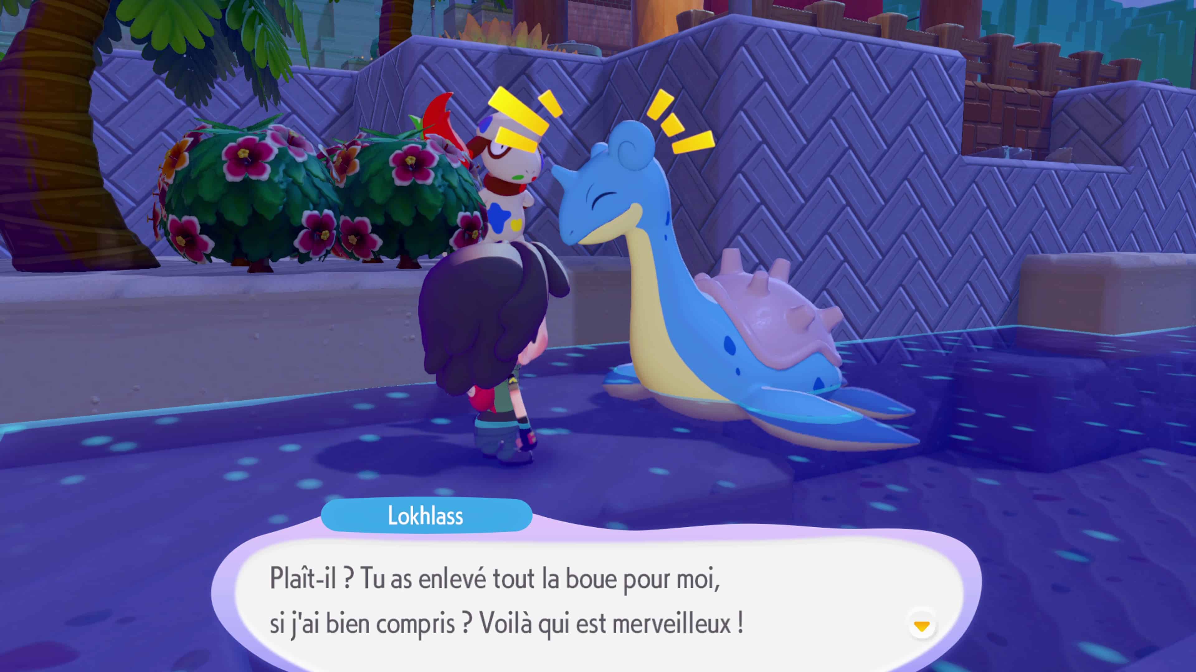 Une fois l’habitat installé, Lokhlass vous demandera de nettoyer la boue aux alentours. Pour cela, demandez à un Pokémon possédant la capacité Arrosage (comme Tiplouf) de vous accompagner afin qu’il puisse ramollir la boue. Il ne vous restera ensuite plus qu’à utiliser Pistolet à eau sur la saleté pour la nettoyer. Lokhlass vous montrera alors comment nager, et votre Métamorph pourra prendre son apparence pour utiliser Surf.