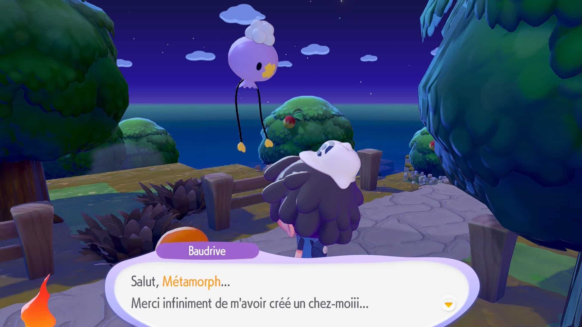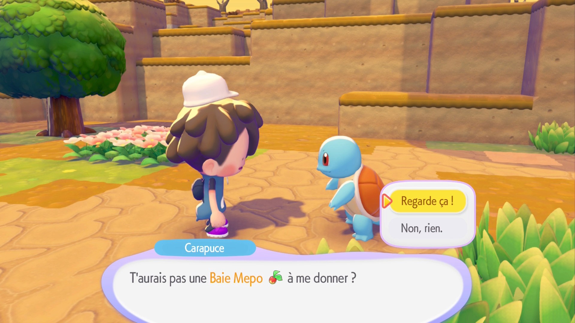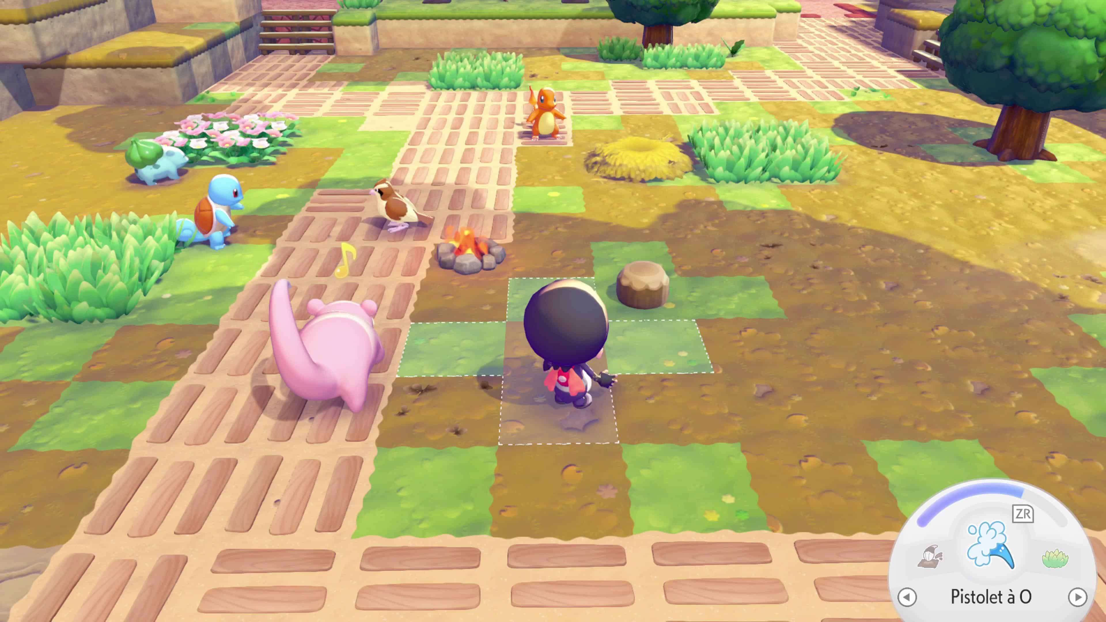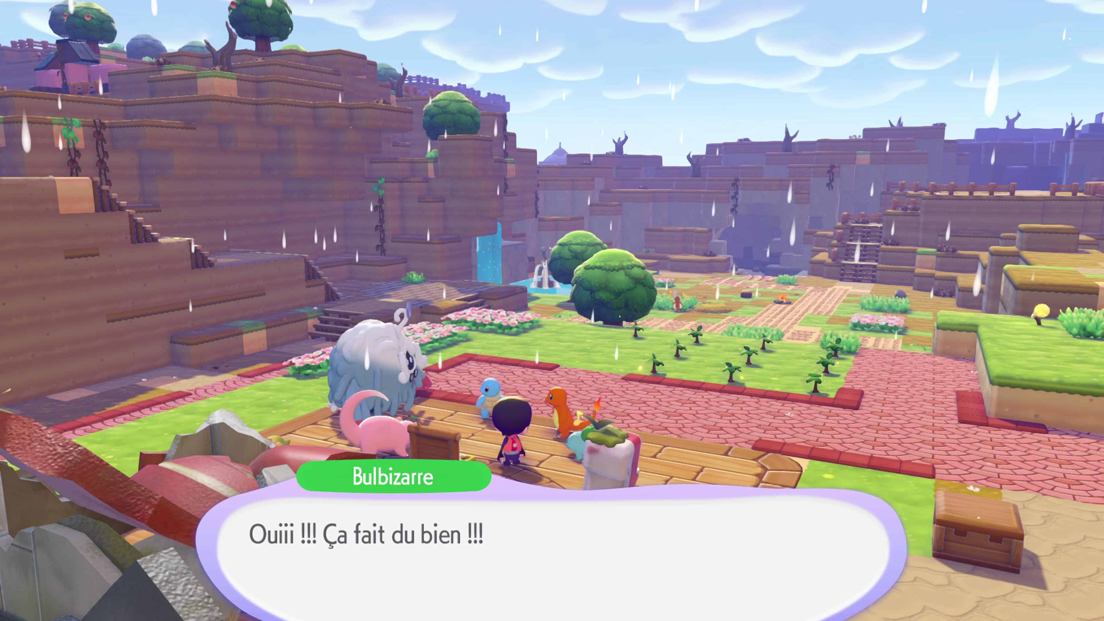 Ceci fait, construisez un nouveau parterre de fleurs pour faire apparaître Salamèche que vous devez conduire jusqu’au feu de camp pour qu’il l’allume, vous n’aurez pas sa capacité Feu. Après cette introduction, suivez le professeur Bouldeneu jusqu’au PC du Centre Pokémon de Terrassec un peu plus loin.