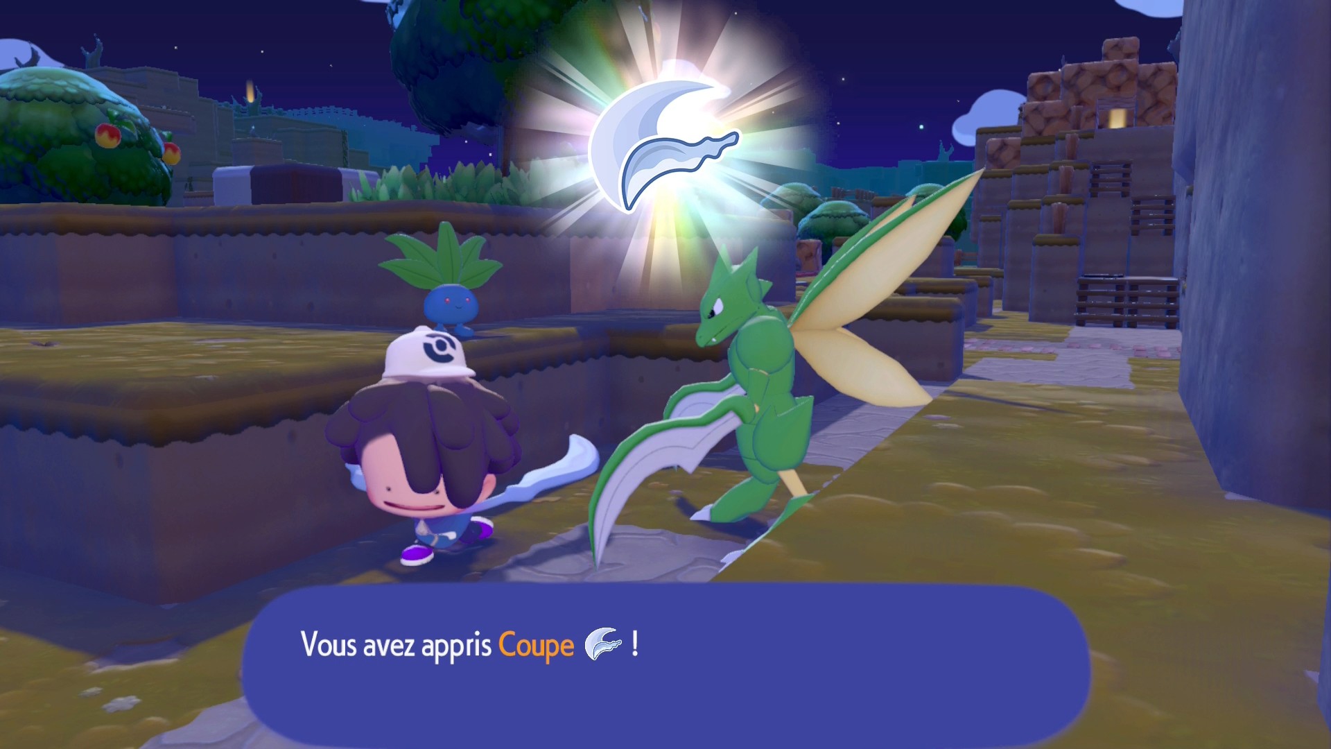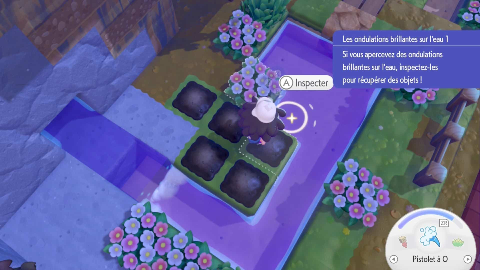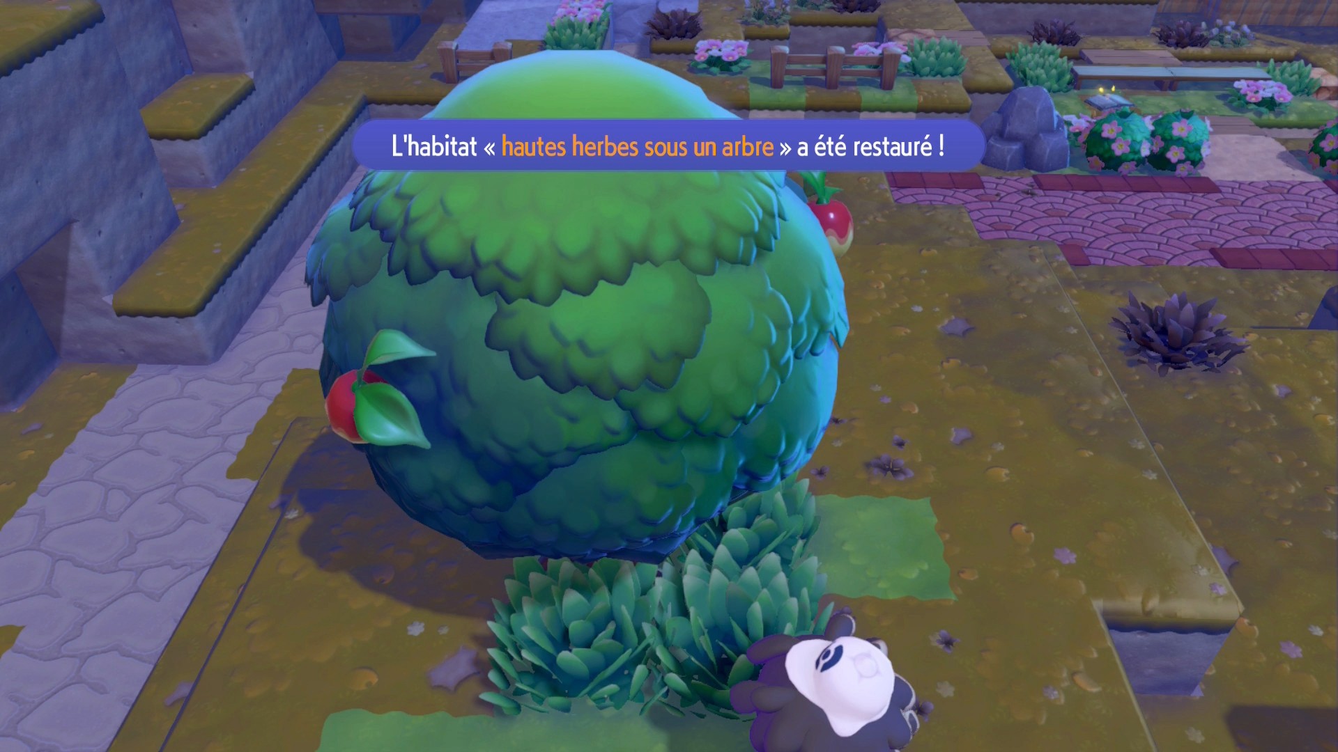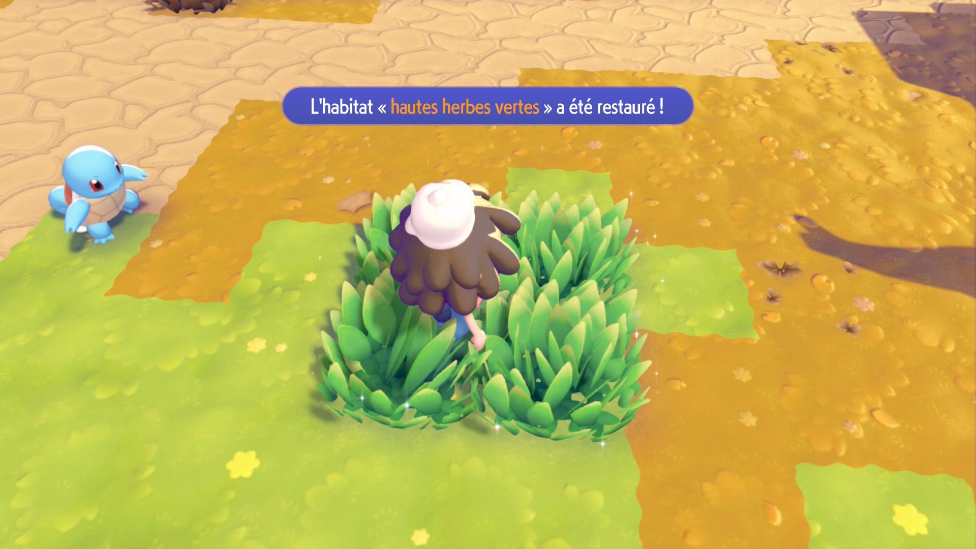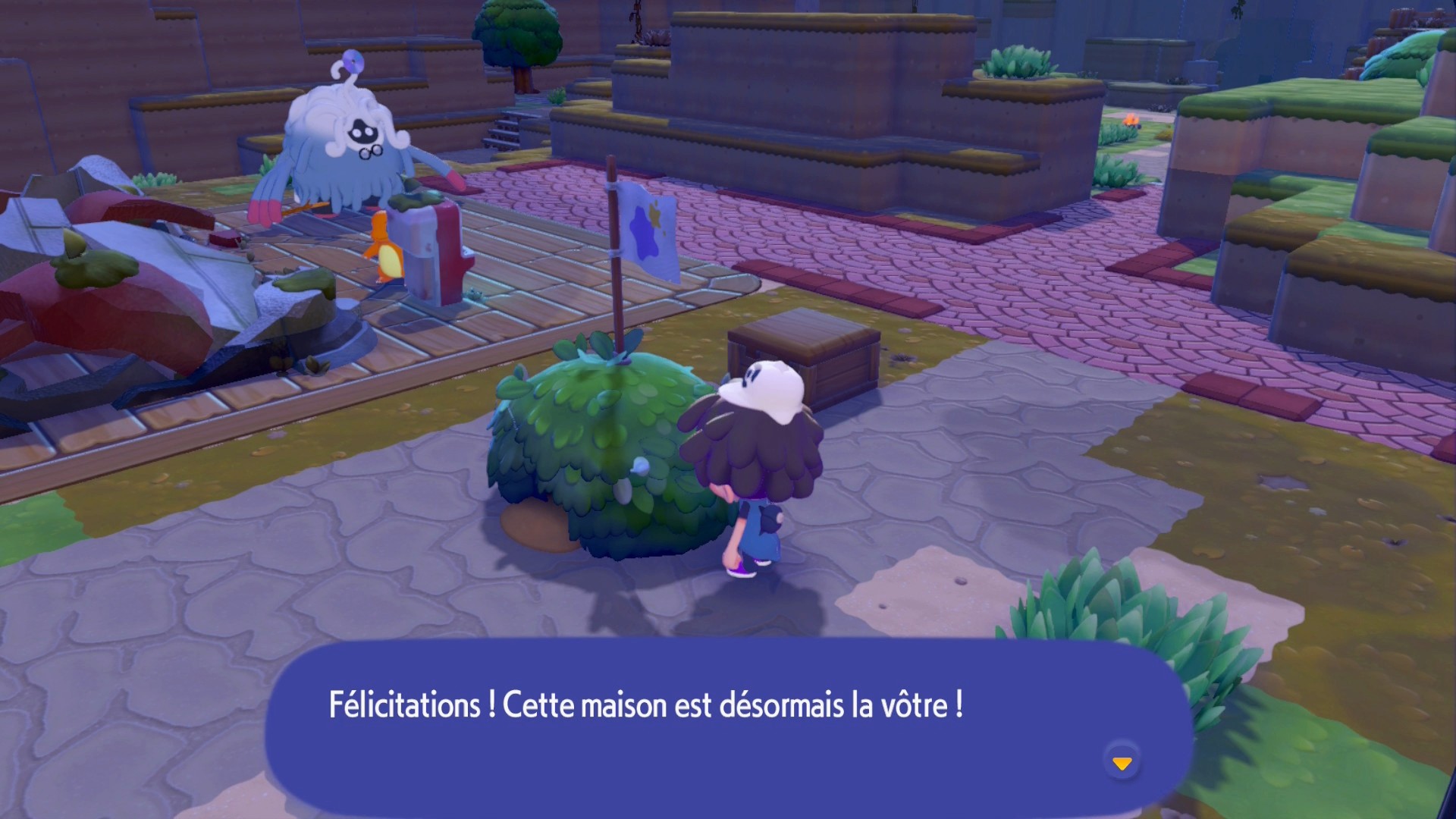 Ceci fait, construisez un nouveau parterre de fleurs pour faire apparaître Salamèche que vous devez conduire jusqu’au feu de camp pour qu’il l’allume, vous n’aurez pas sa capacité Feu. Après cette introduction, suivez le professeur Bouldeneu jusqu’au PC du Centre Pokémon de Terrassec un peu plus loin.