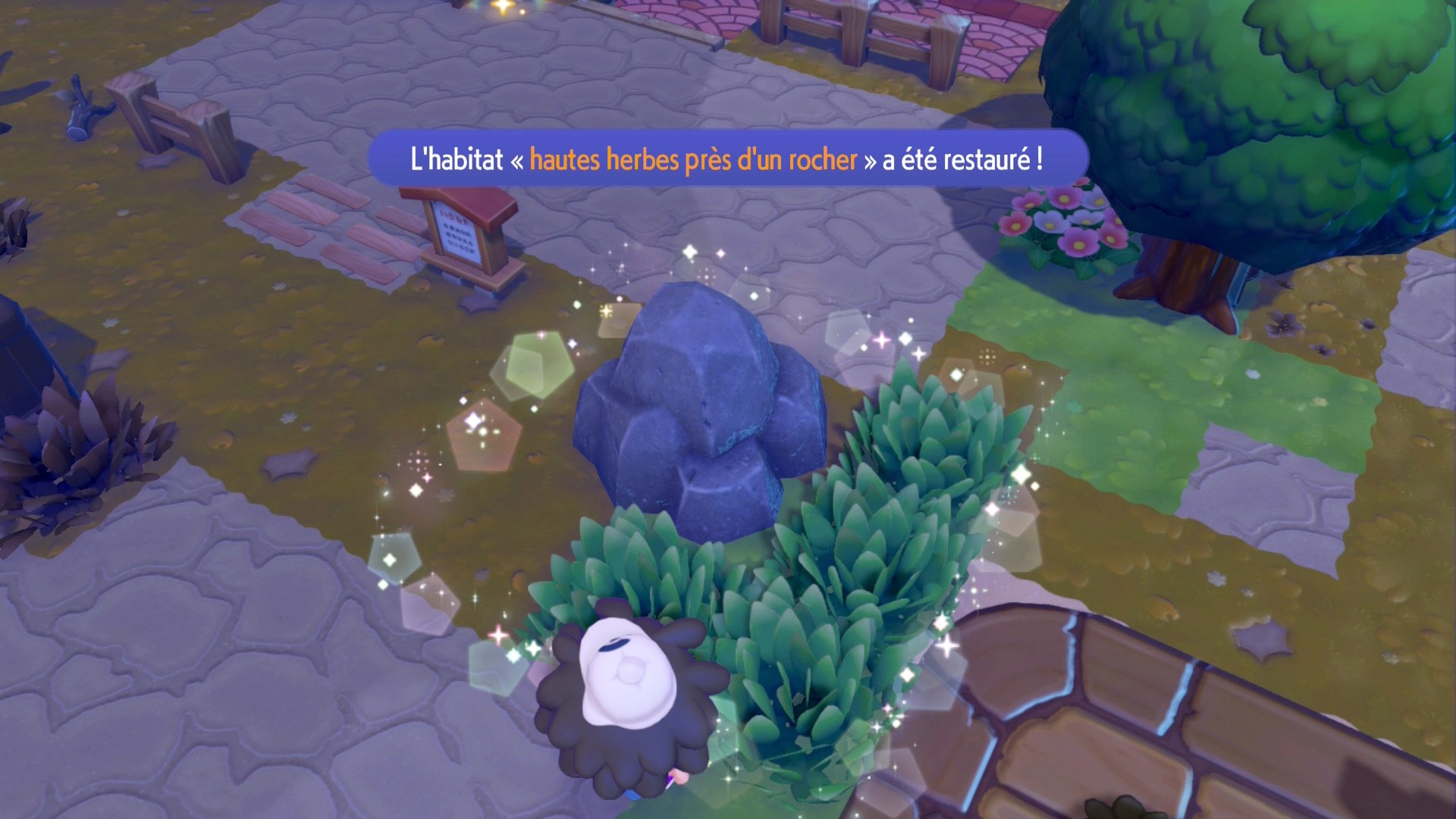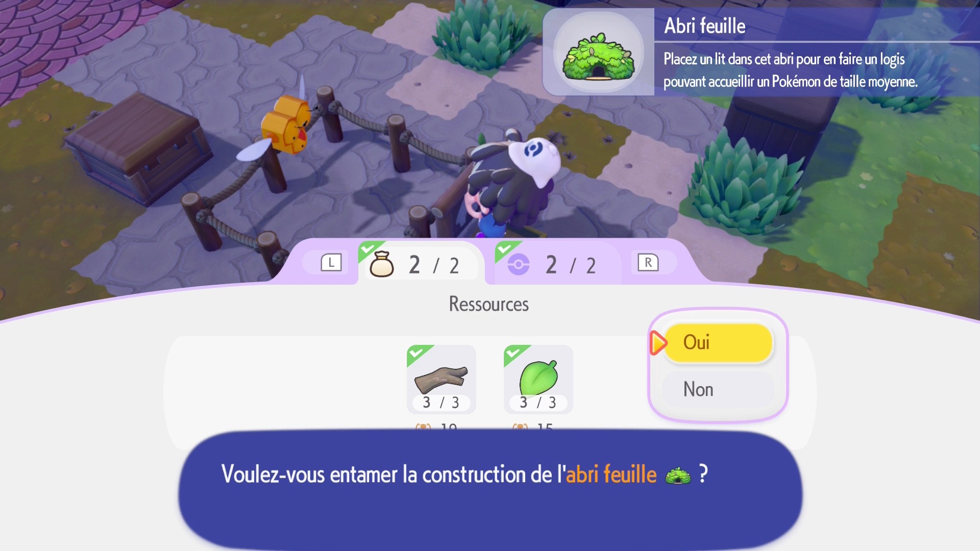 Après avoir construit leurs habitats respectifs, fabriquez celui du Pokémon constructeur, Charpenti, grâce à un carré d’herbes près d’un rocher. Ce Pokémon sera nécessaire pour valider les prochaines étapes de construction d’abris mais également pour la reconstruction du Centre Pokémon. Le mieux ici est de tout faire pour améliorer la qualité de vie de la région au niveau 2 pour poursuivre grâce aux indications du professeur Bouldeneu.