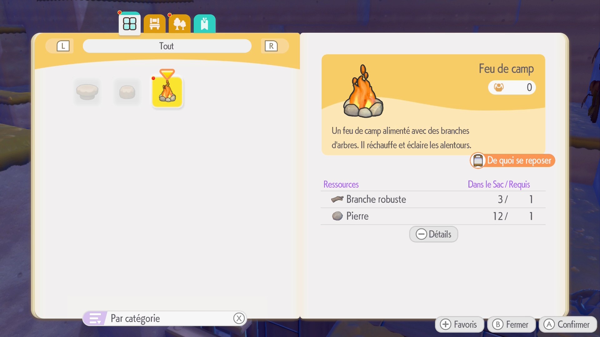 Pour la suite des quêtes de Terrassec, vous allez devoir construire votre abri. Achetez un kit nécessaire à celui au PC et posez votre chantier où vous voulez. Rassemblez les ressources nécessaires et demandez à Charpenti et un second Pokémon de procéder à la construction. Pendant les 10 minutes nécessaires à la construction, profitez-en pour explorer les environs et chercher des traces d’autres Pokémon.