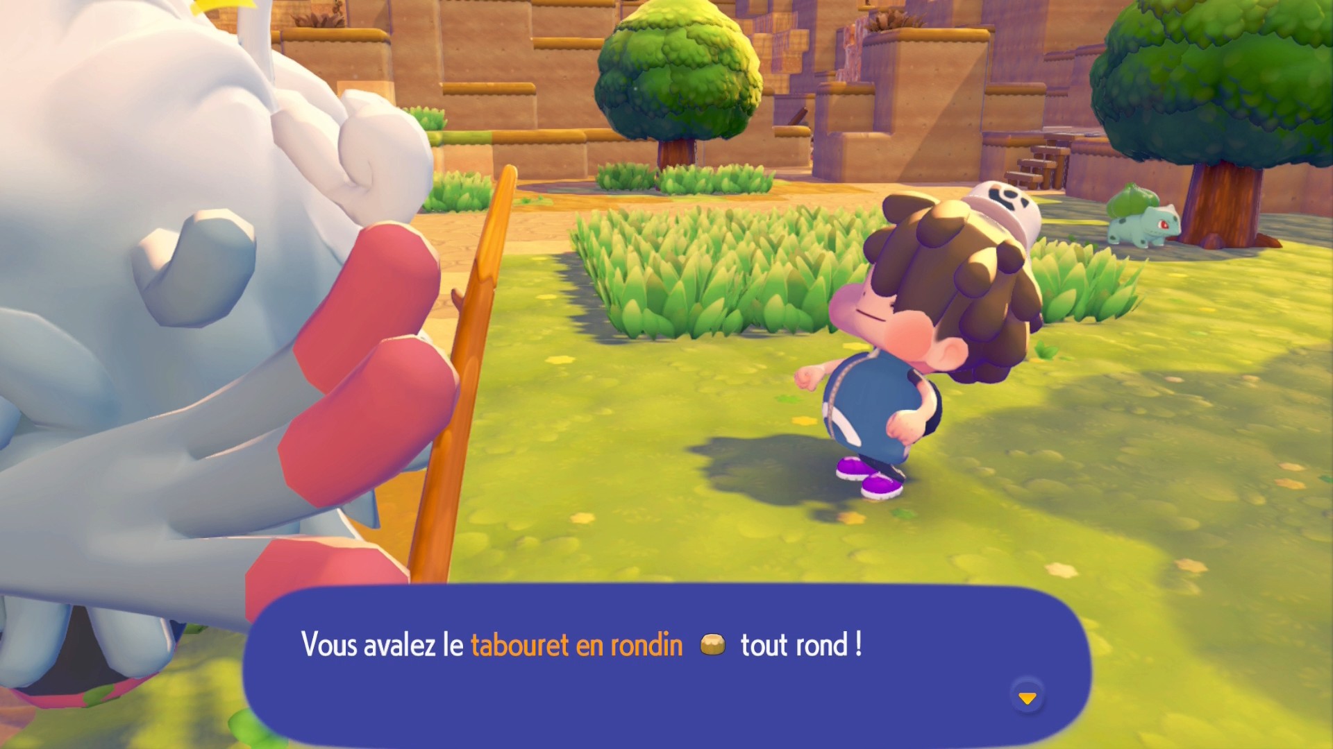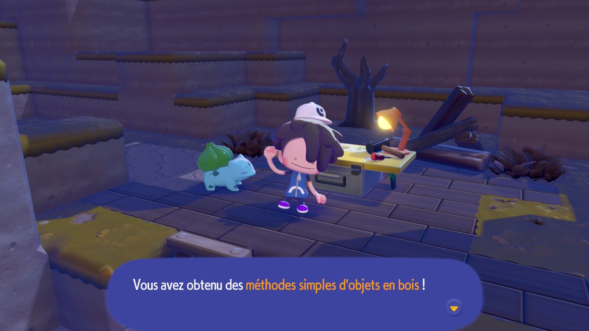 Après avoir créé une autre parcelle d’Hautes herbes vertes pour y installer Carapuce, offrez-lui une Baie Mepo, que vous pouvez récolter dans les arbres du coin. Le professeur Bouldeneu va alors vous confier un tabouret qu’il vous faudra recracher pour vous asseoir dessus avant de partir à la recherche d’un établi avec Bulbizarre. Fabriquez un feu de camp et installez-le près du tabouret que vous avez posé.