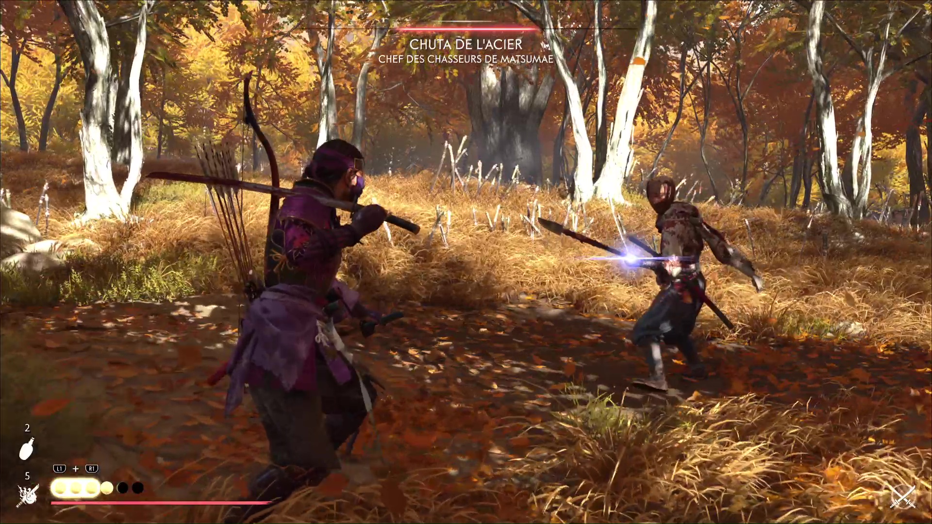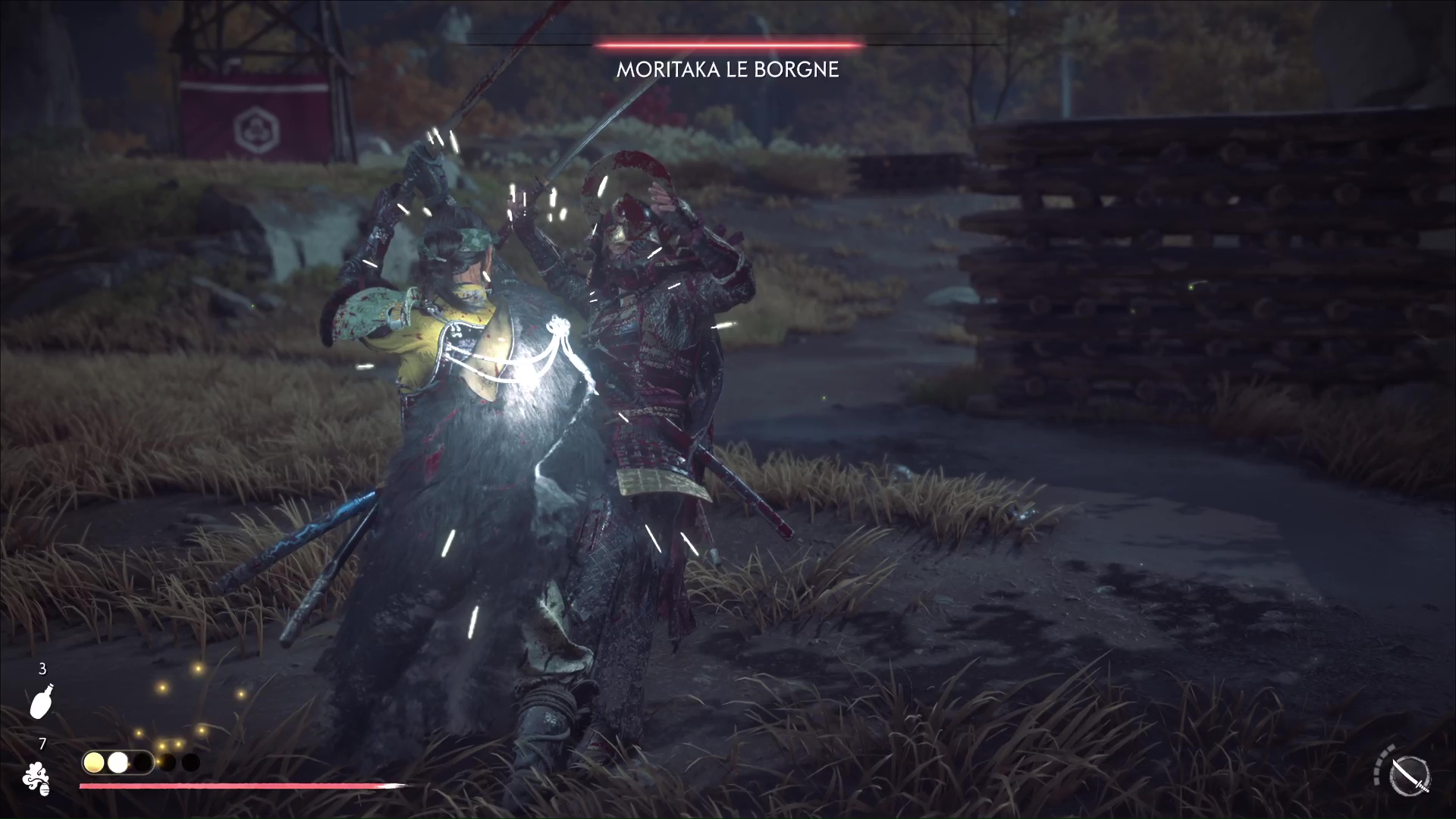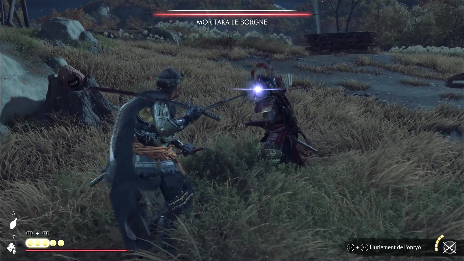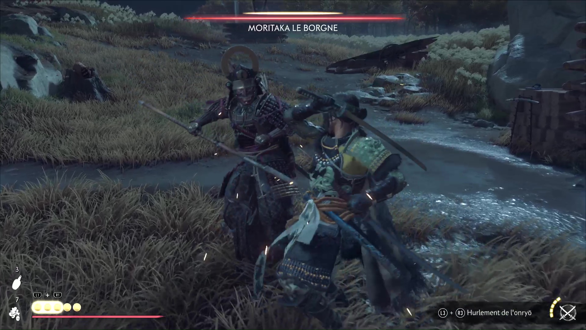 Lorsque le duel sera lancé, Moritaka sortira sa lance. Répondez donc avec les doubles katanas, si vous les avez. Votre adversaire sort différentes attaques bleues en essayant de vous piquer avec sa lance. Il arrivera aussi qu’il sorte son katana.