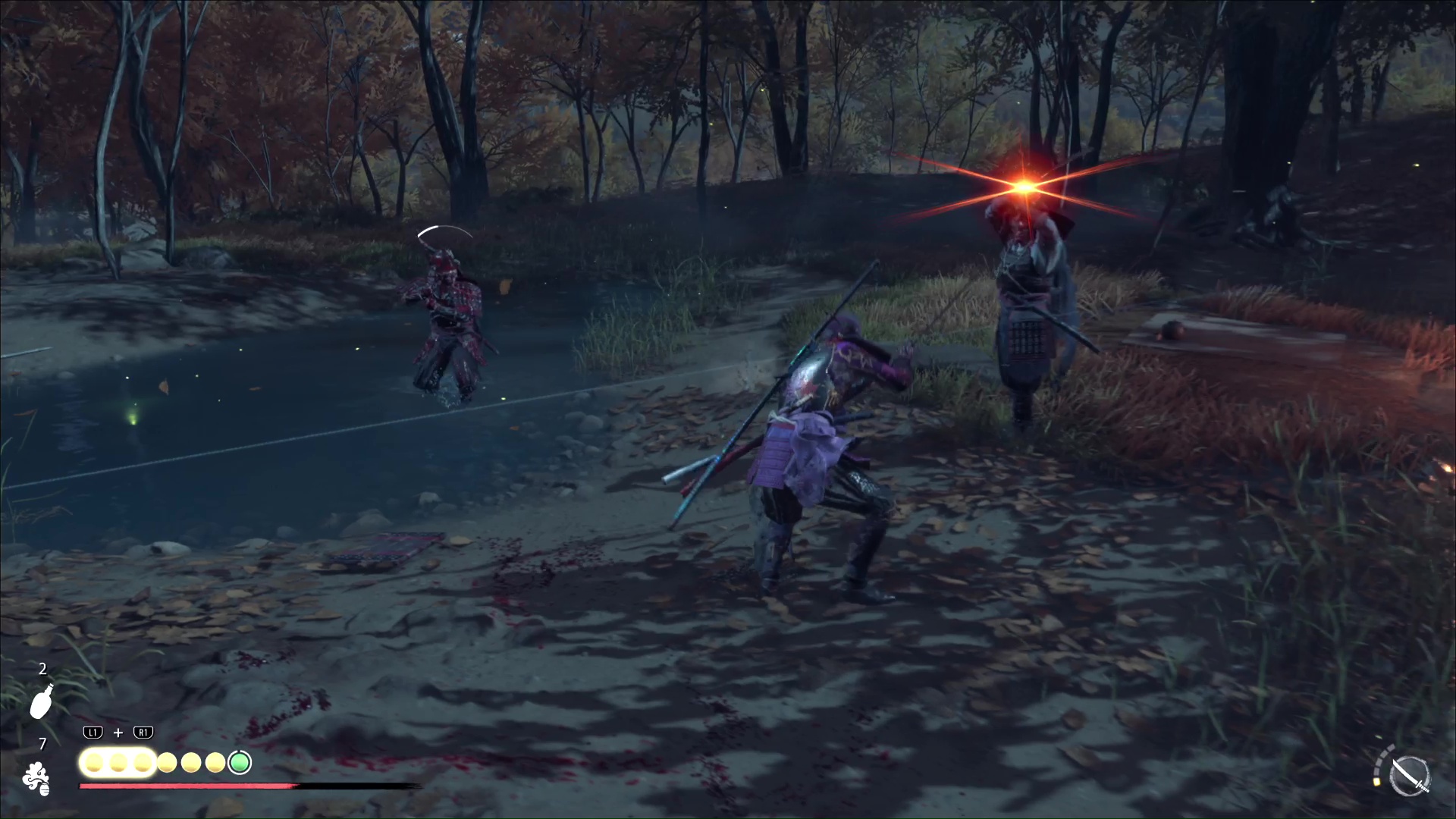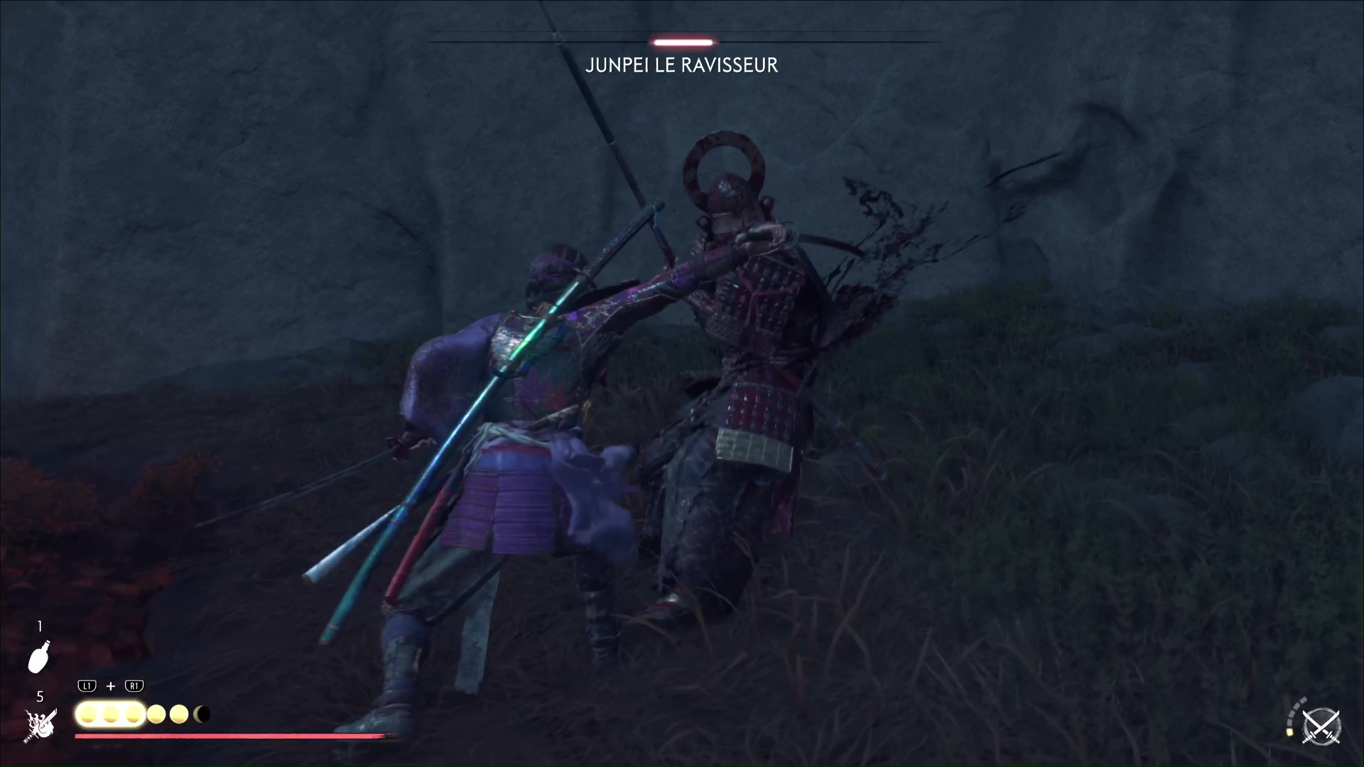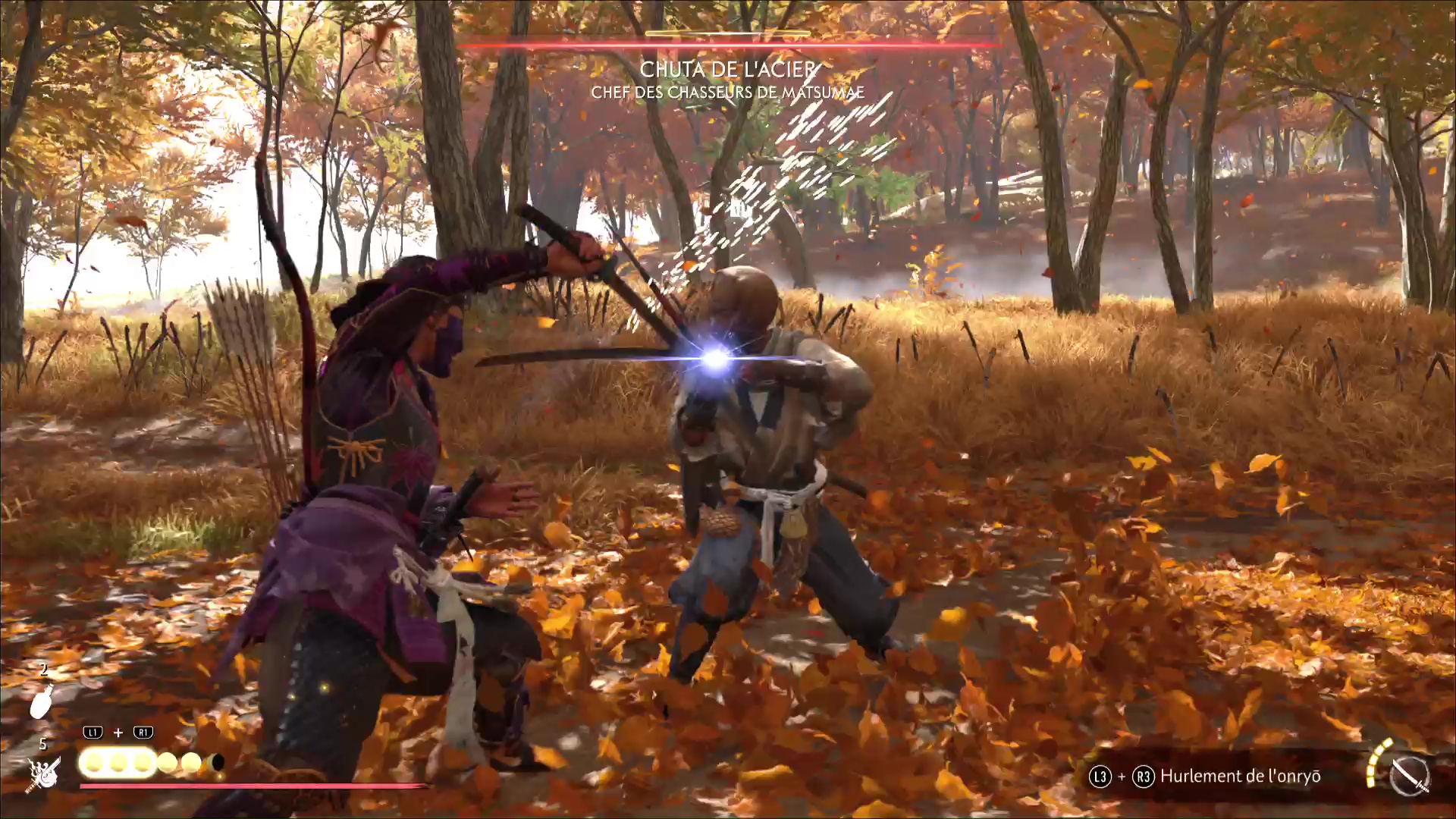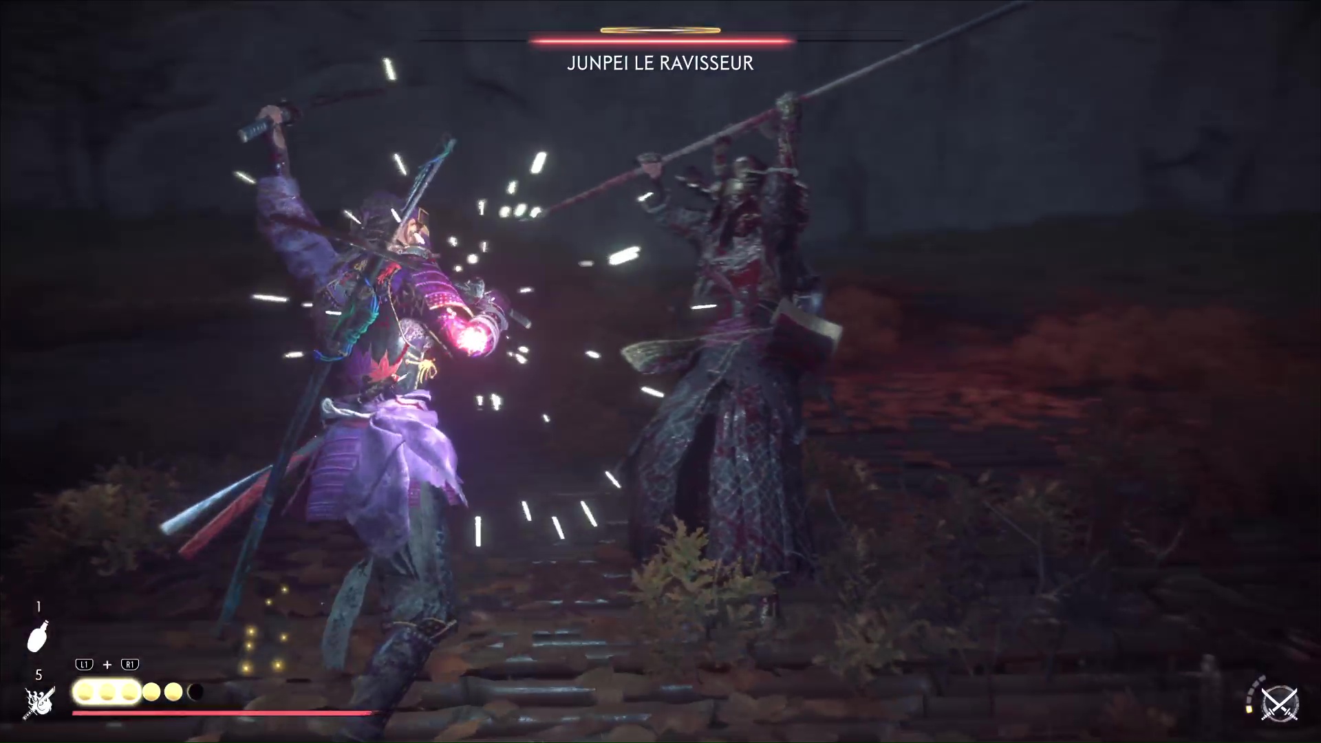 Lorsque le duel sera lancé, Moritaka sortira sa lance. Répondez donc avec les doubles katanas, si vous les avez. Votre adversaire sort différentes attaques bleues en essayant de vous piquer avec sa lance. Il arrivera aussi qu’il sorte son katana.