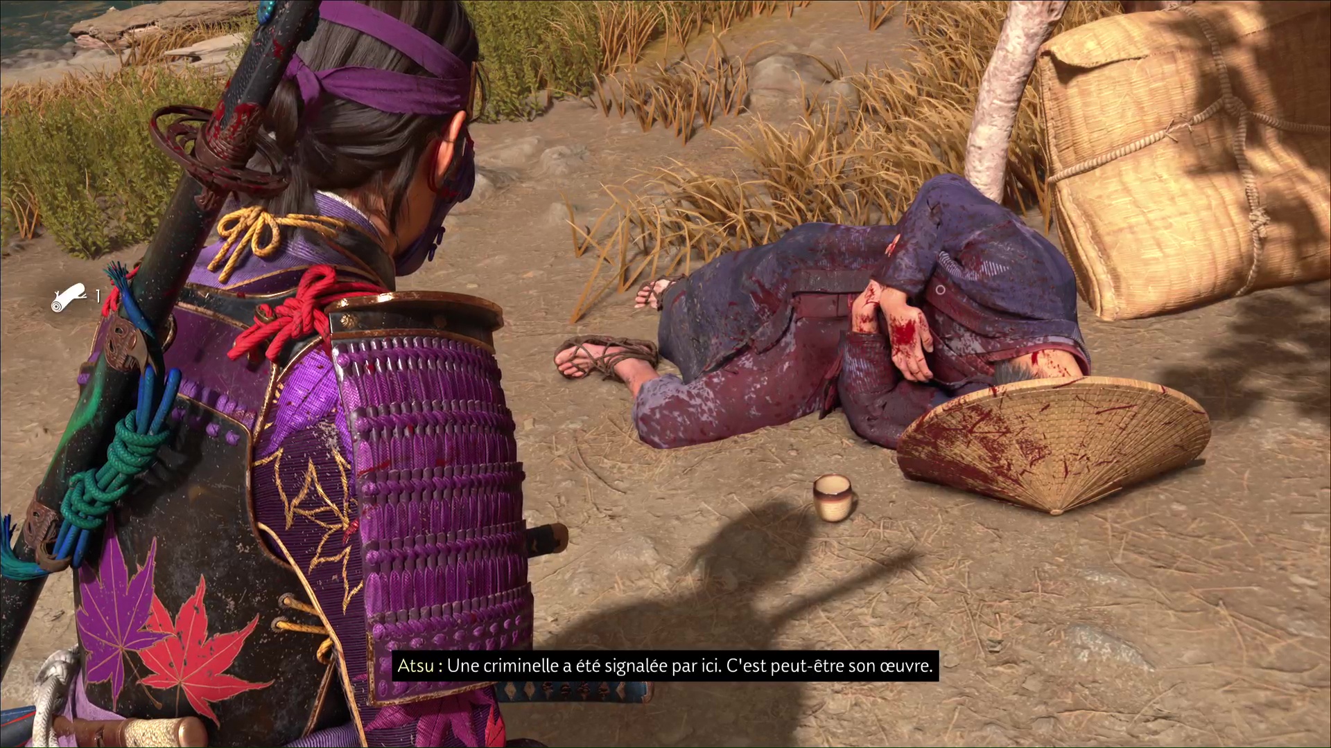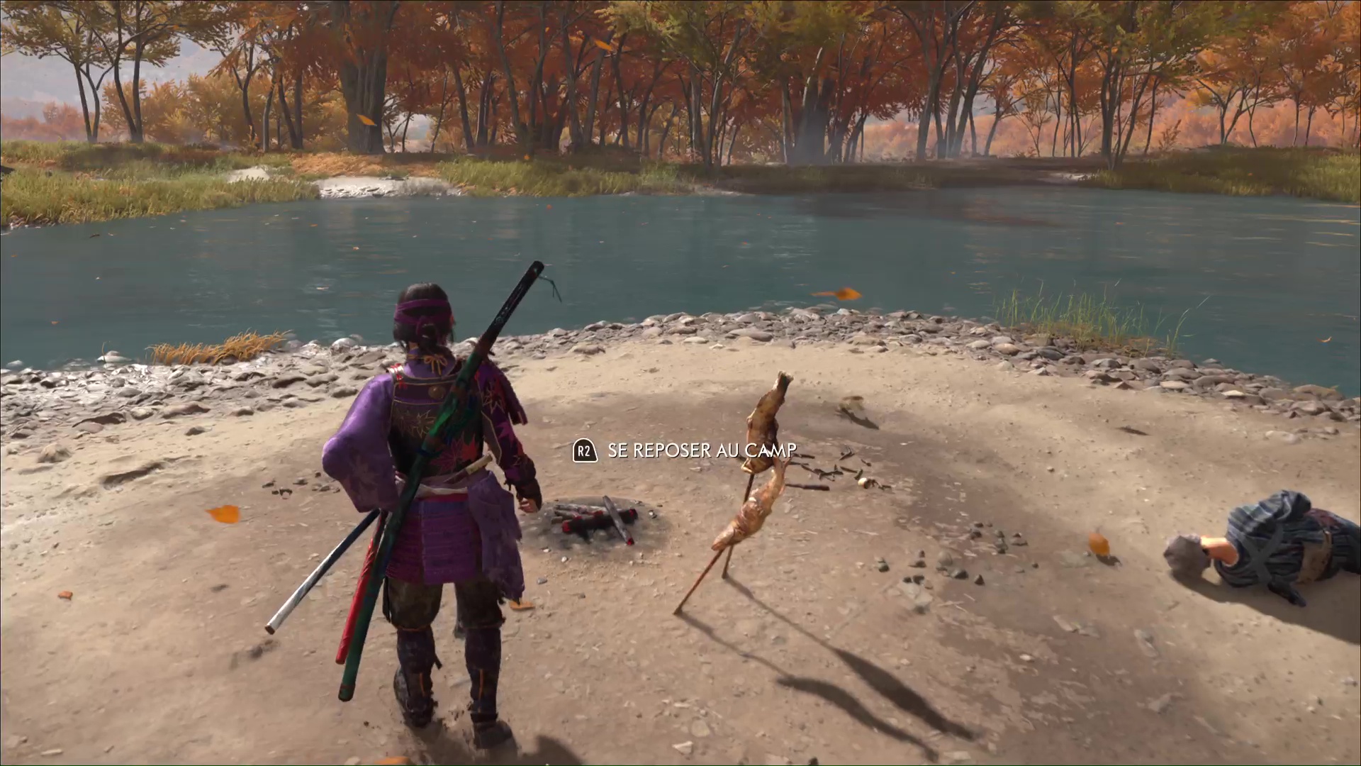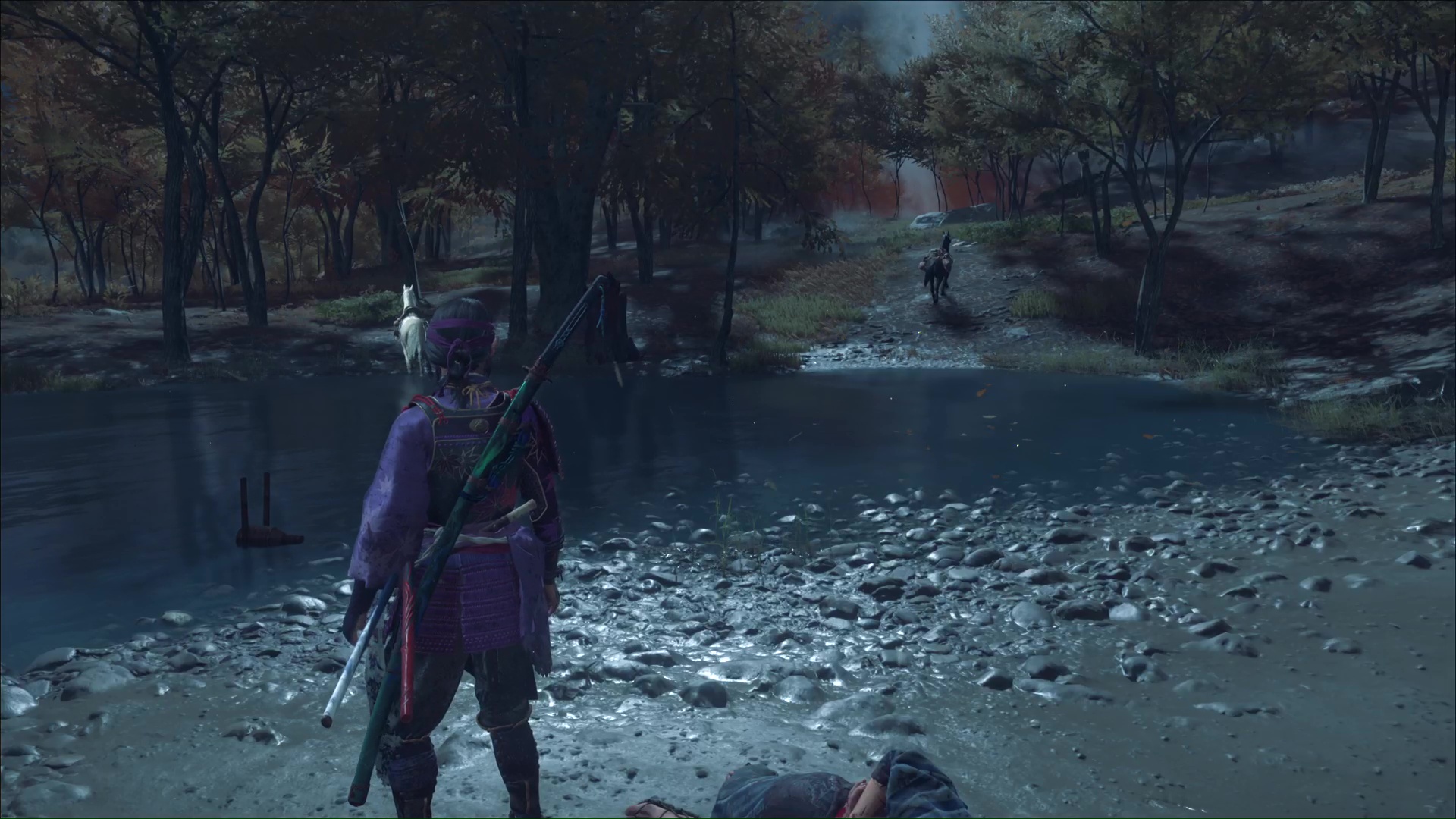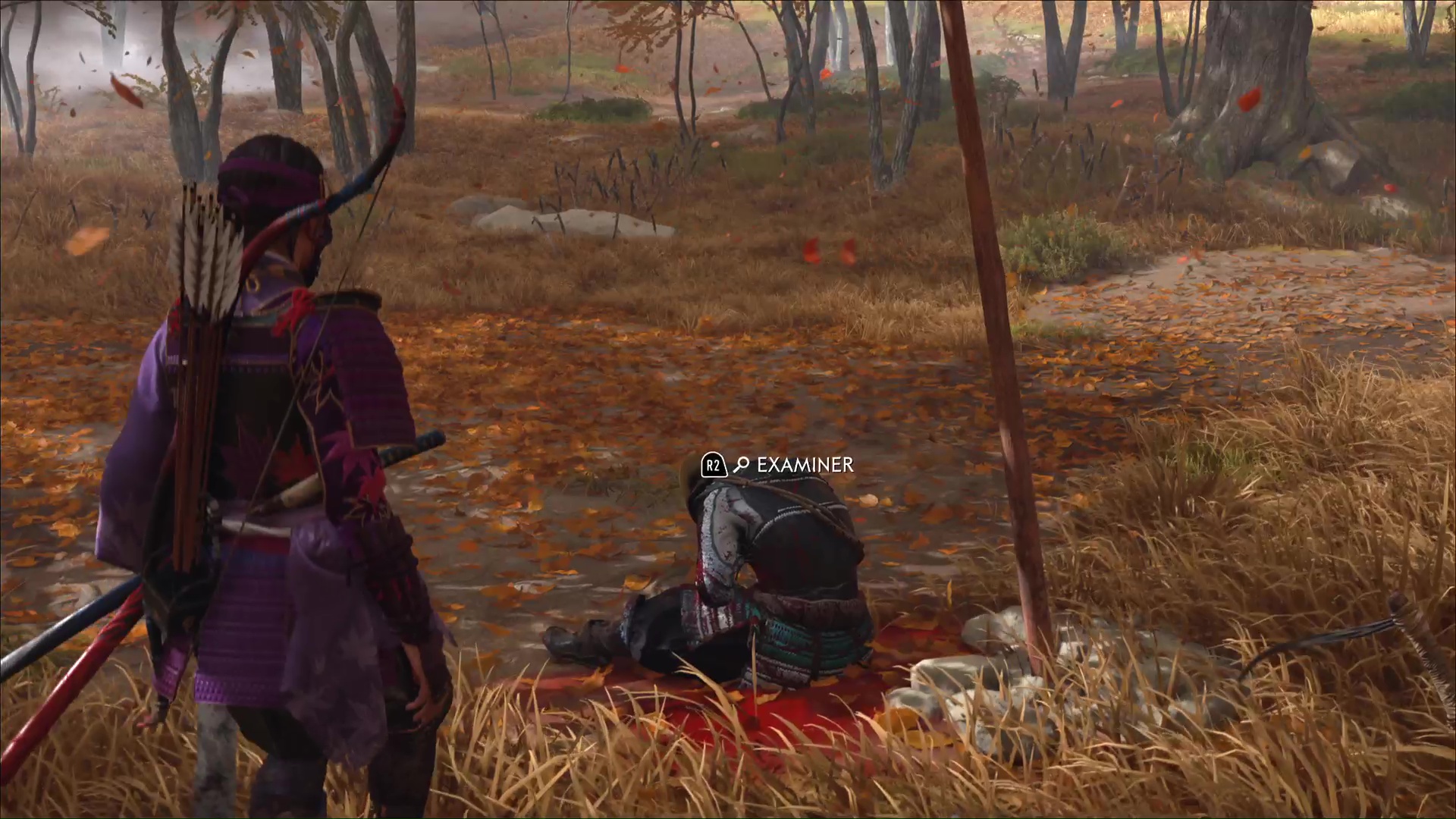 Ce dernier aurait regagné un camp un peu plus loin au nord, après la rivière. Partez donc en direction de la Rivière Niikappu et allez légèrement au-dessus de l’inscription de cette localisation sur la map. Quelques pas à l’est du pilier des défunts, vous trouverez un samouraï mort.