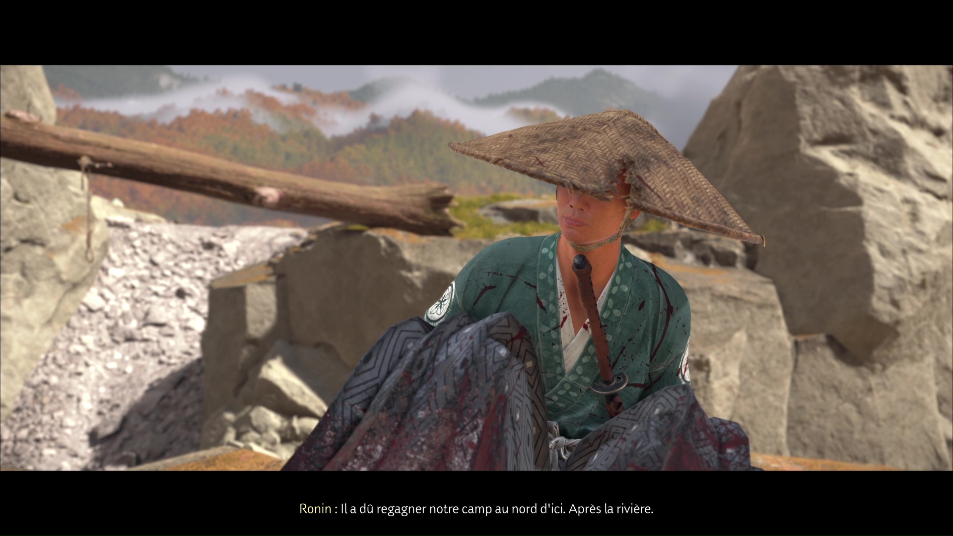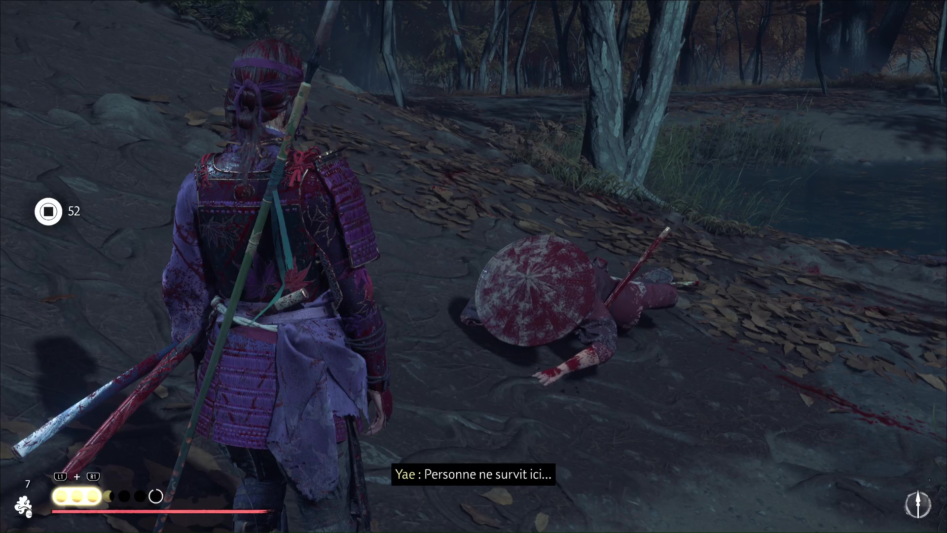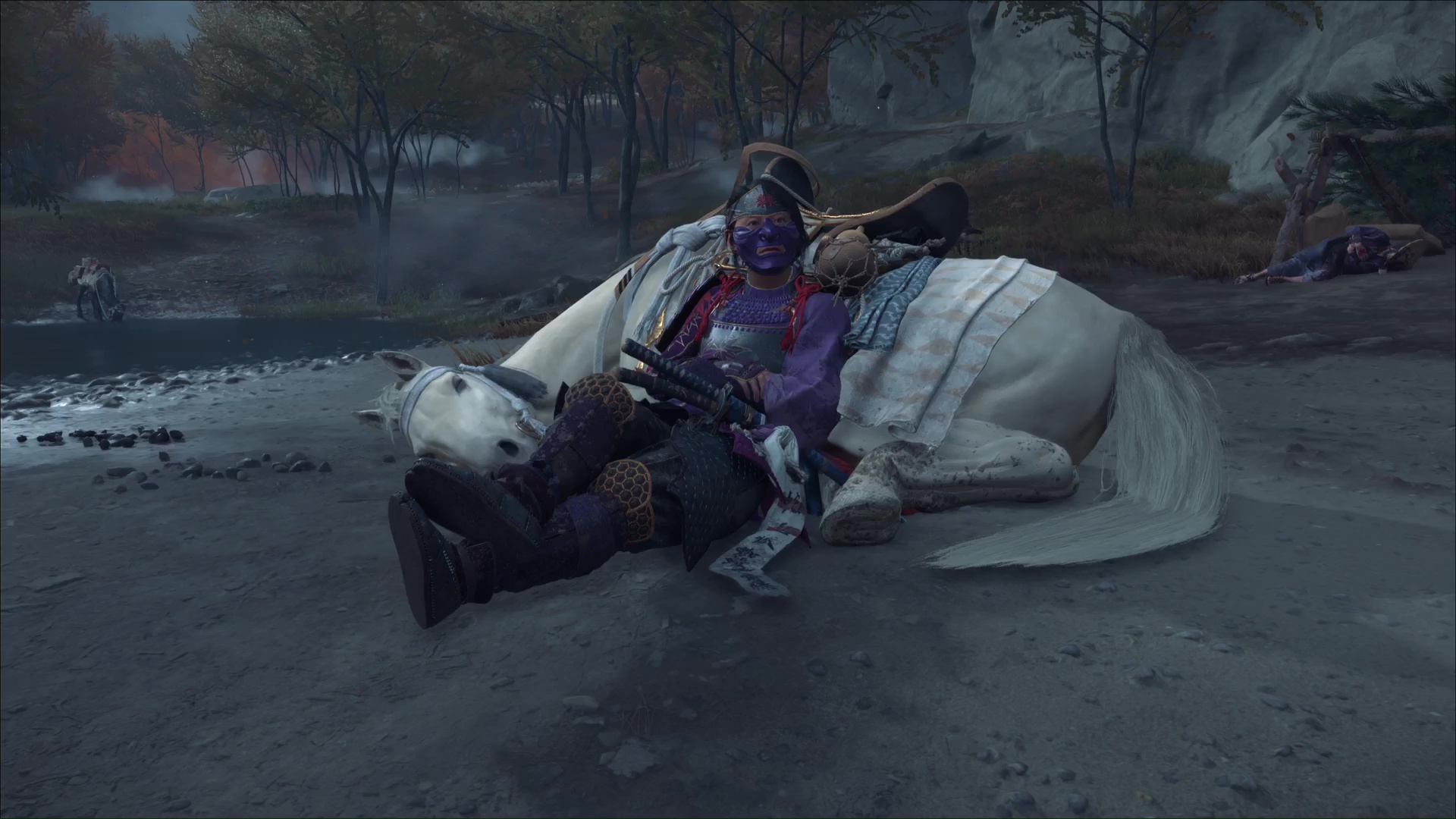 Ce dernier aurait regagné un camp un peu plus loin au nord, après la rivière. Partez donc en direction de la Rivière Niikappu et allez légèrement au-dessus de l’inscription de cette localisation sur la map. Quelques pas à l’est du pilier des défunts, vous trouverez un samouraï mort.