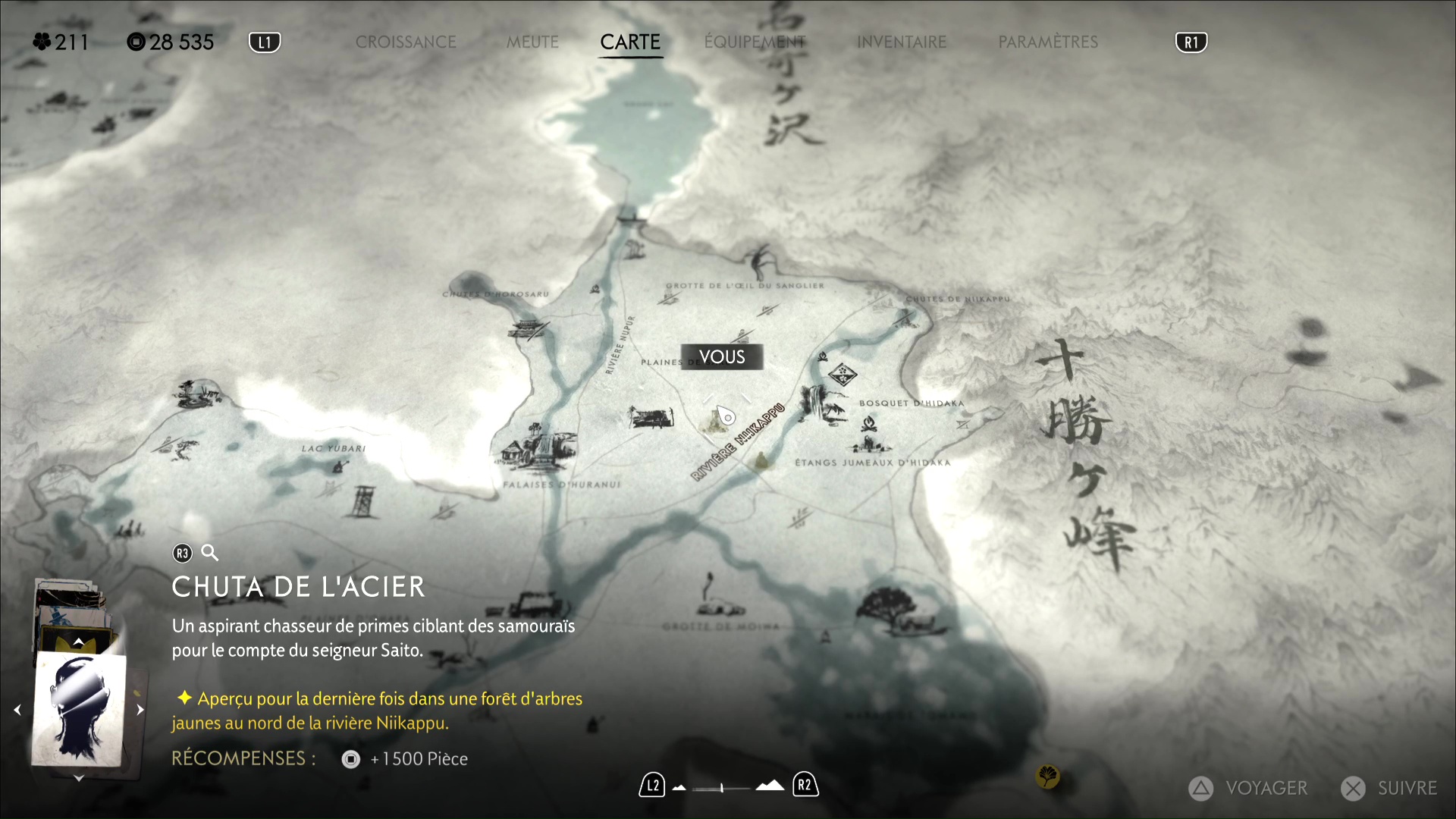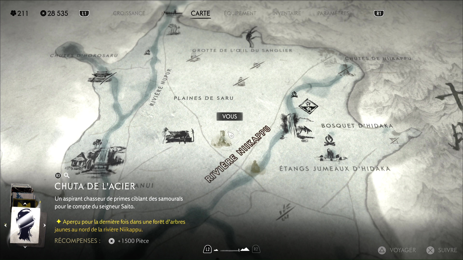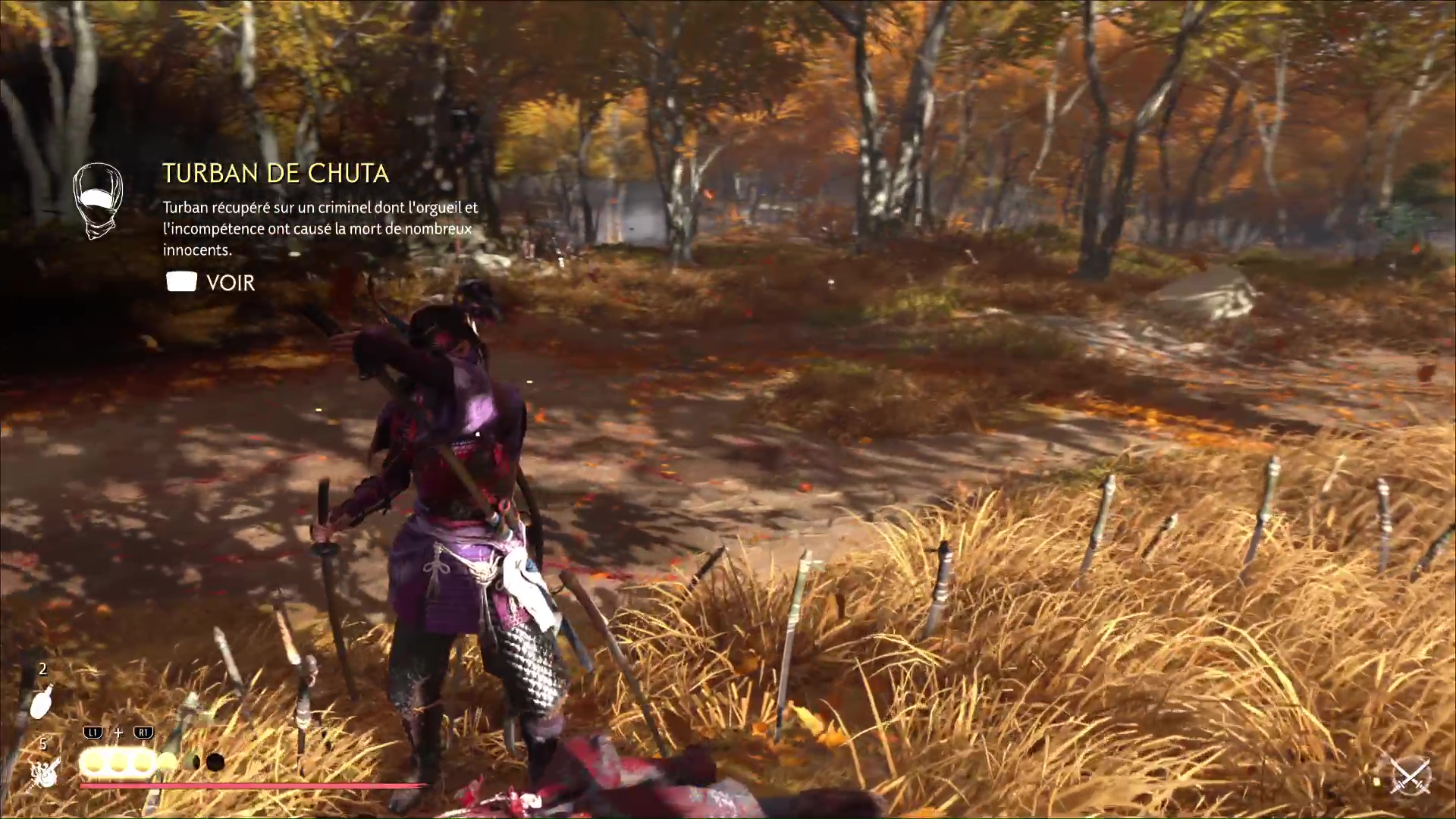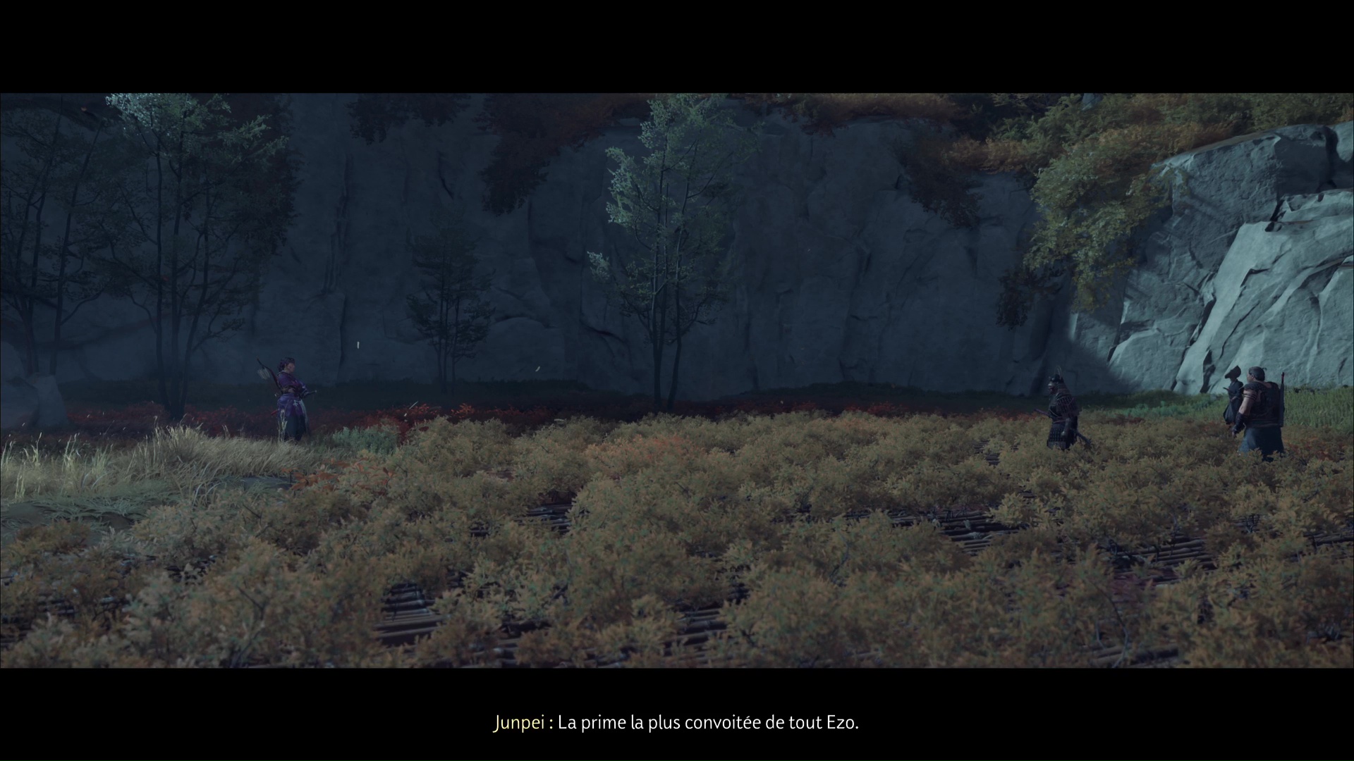 Ce dernier aurait regagné un camp un peu plus loin au nord, après la rivière. Partez donc en direction de la Rivière Niikappu et allez légèrement au-dessus de l’inscription de cette localisation sur la map. Quelques pas à l’est du pilier des défunts, vous trouverez un samouraï mort.