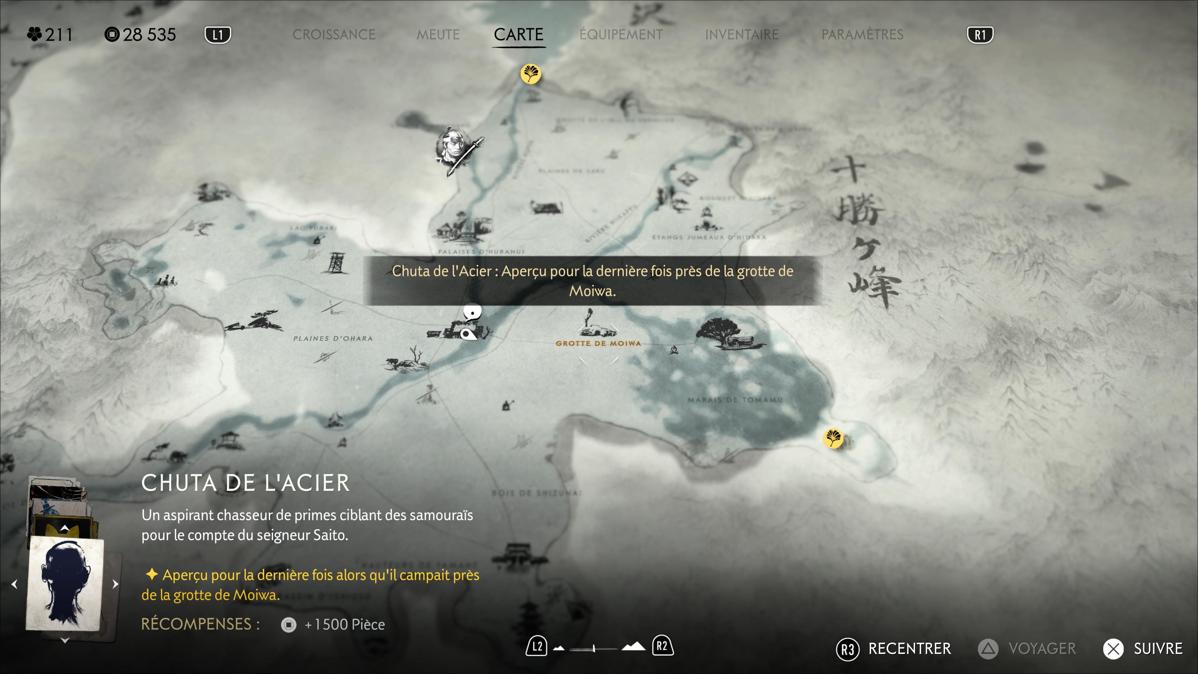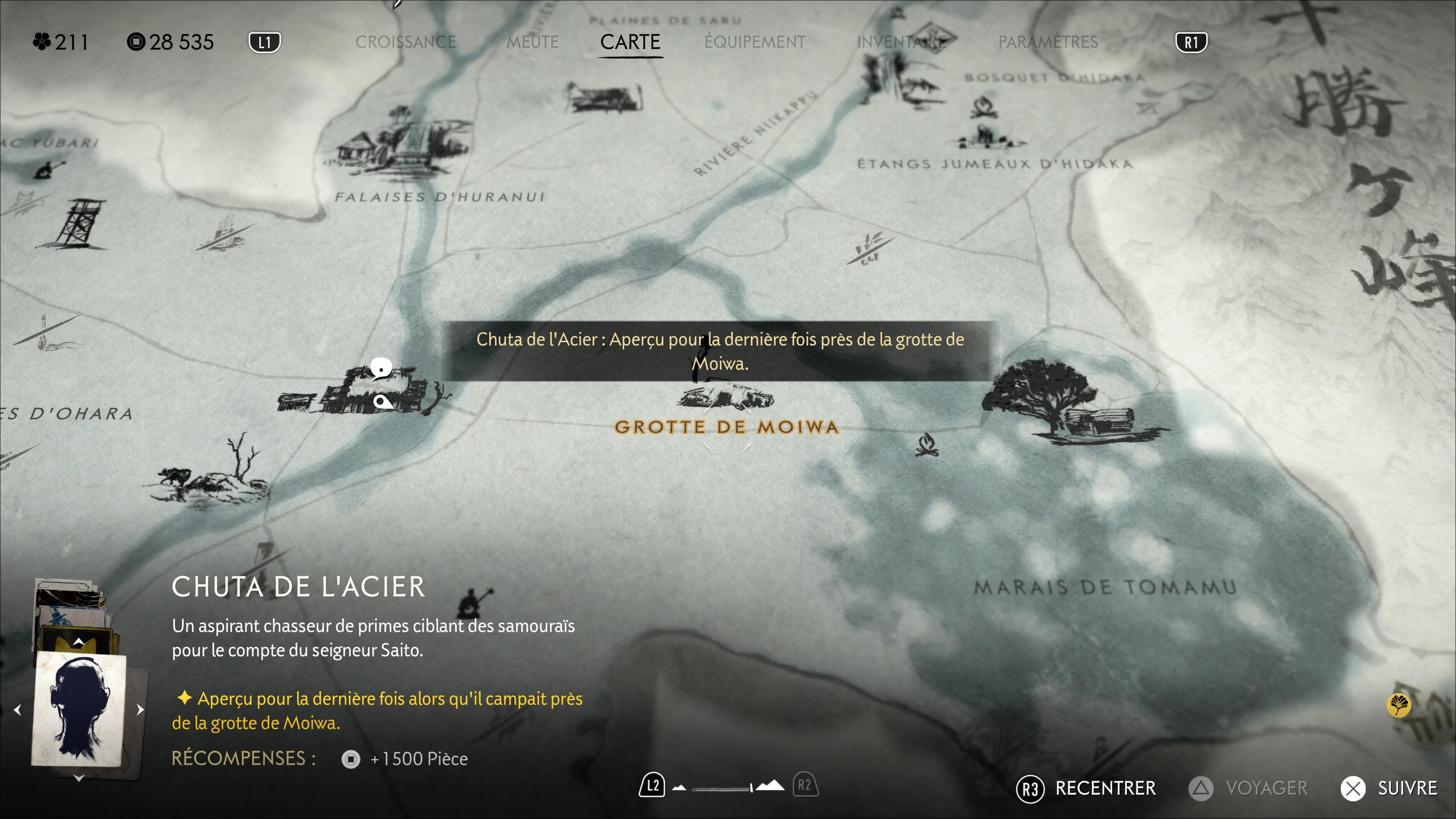 Voilà quelqu’un de familier. Chuta de l’Acier, que vous avez rencontré durant la quête « Aux grands maux… », traînerait près de la Grotte de Moiwa, à l’est de l’Auberge du repos d’Huranui.
