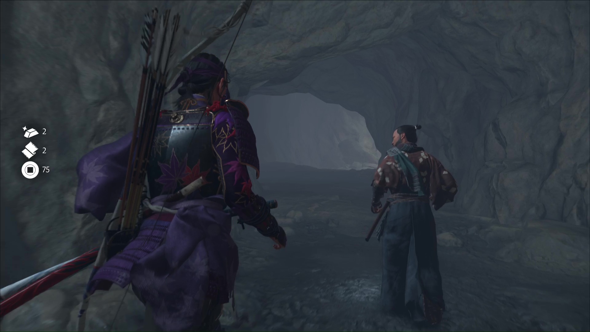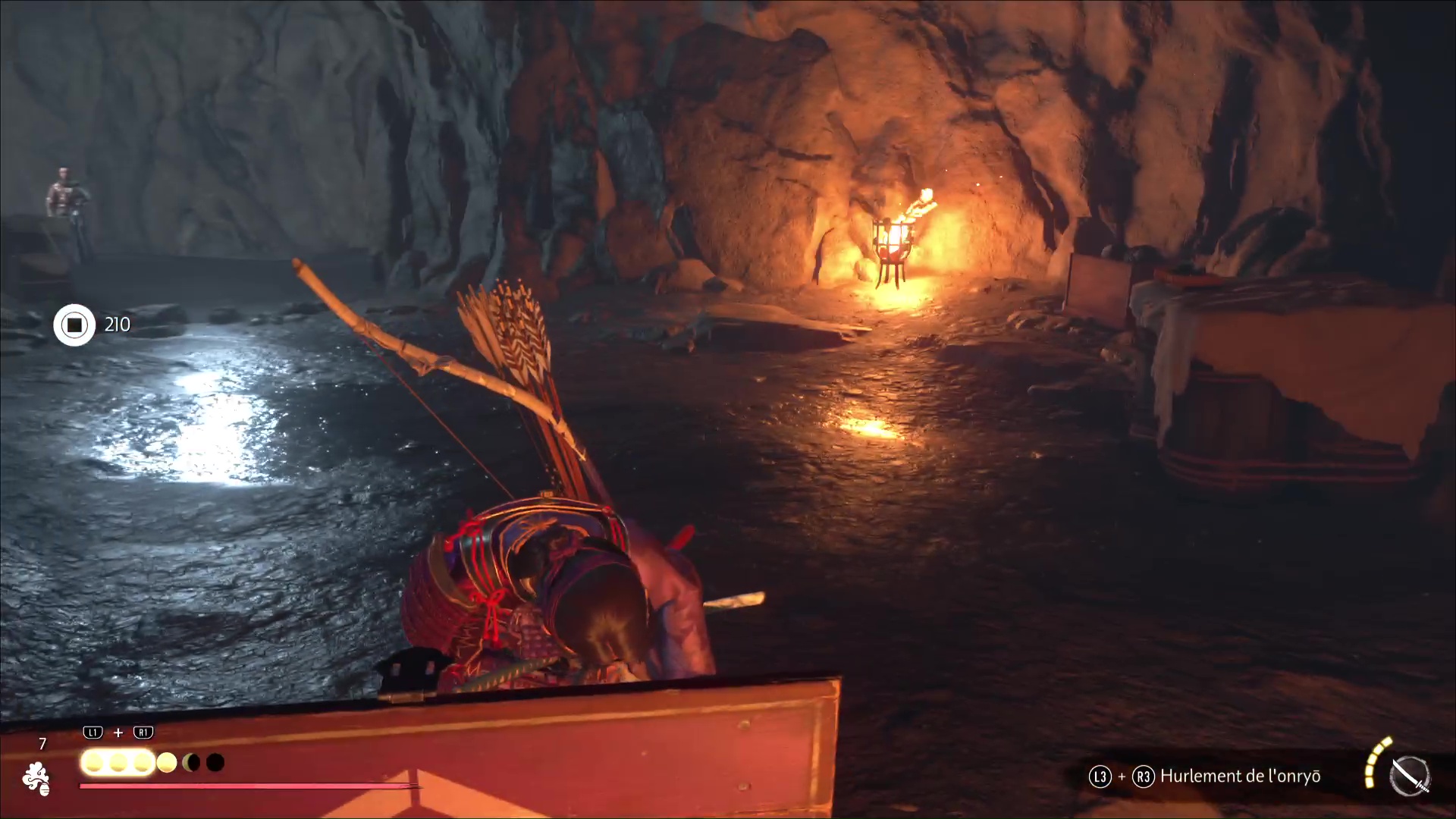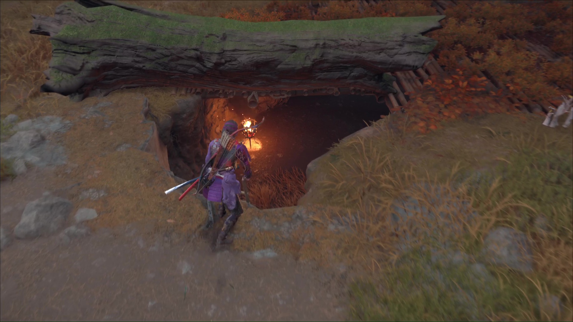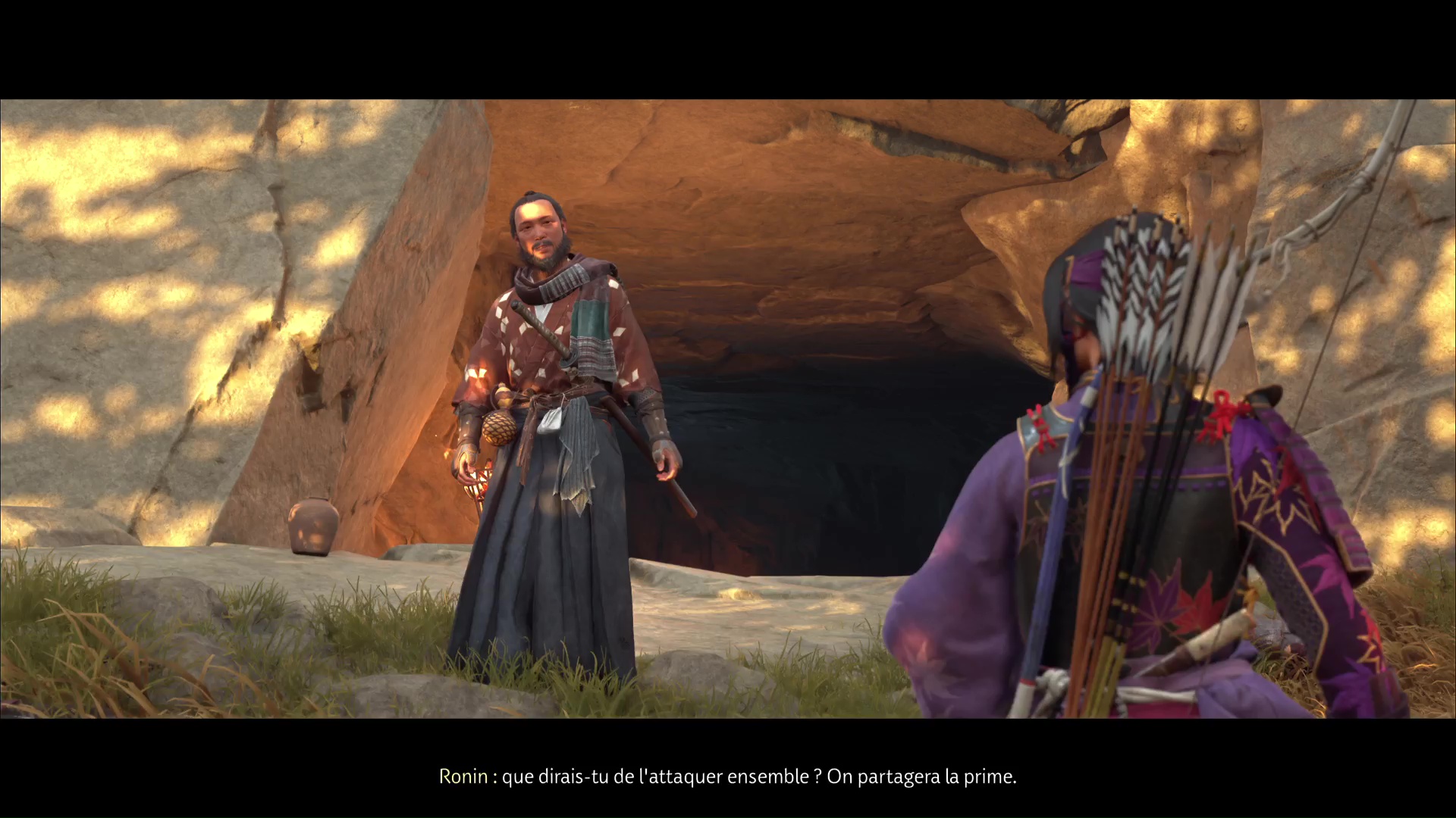 Approchez de l’entrée de la grotte pour dialoguer avec un ronin. Il confirme la piste de Junpei et vous propose de chasser à deux la prime. Progressez à l’intérieur de la grotte et fouillez les lieux au fur et à mesure de votre avancée, afin de gagner ressources et argent.