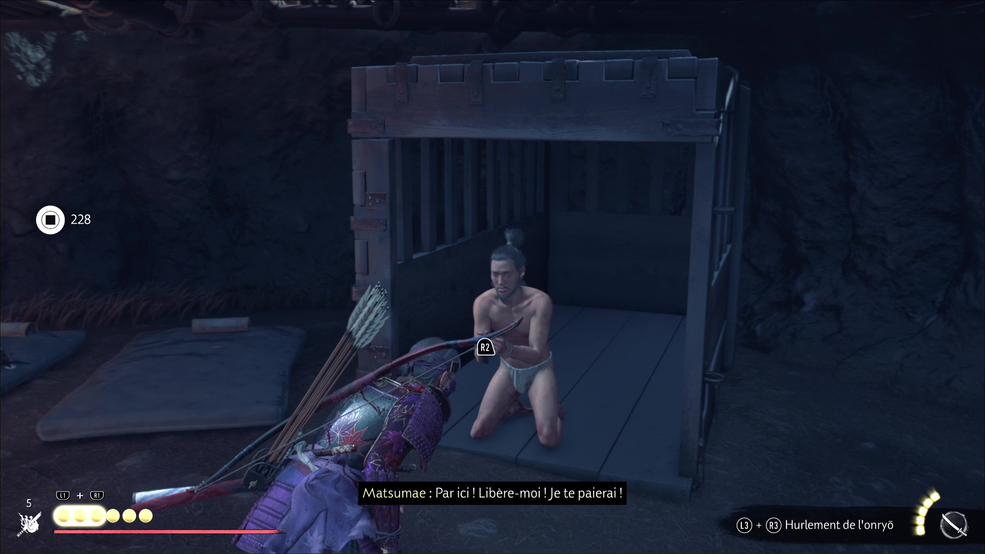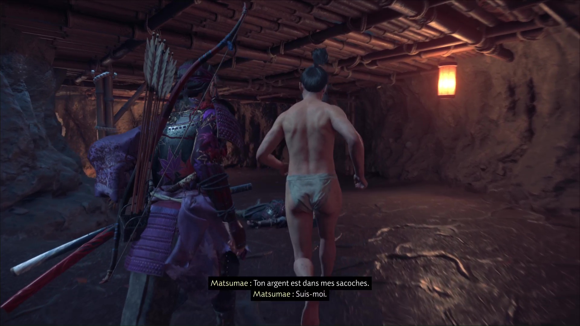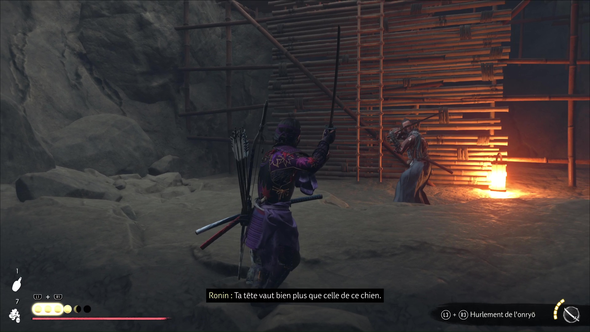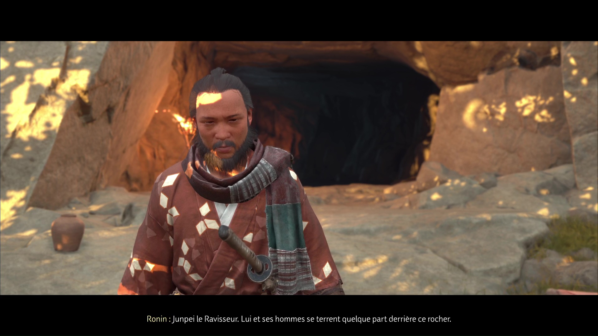 Approchez de l’entrée de la grotte pour dialoguer avec un ronin. Il confirme la piste de Junpei et vous propose de chasser à deux la prime. Progressez à l’intérieur de la grotte et fouillez les lieux au fur et à mesure de votre avancée, afin de gagner ressources et argent.