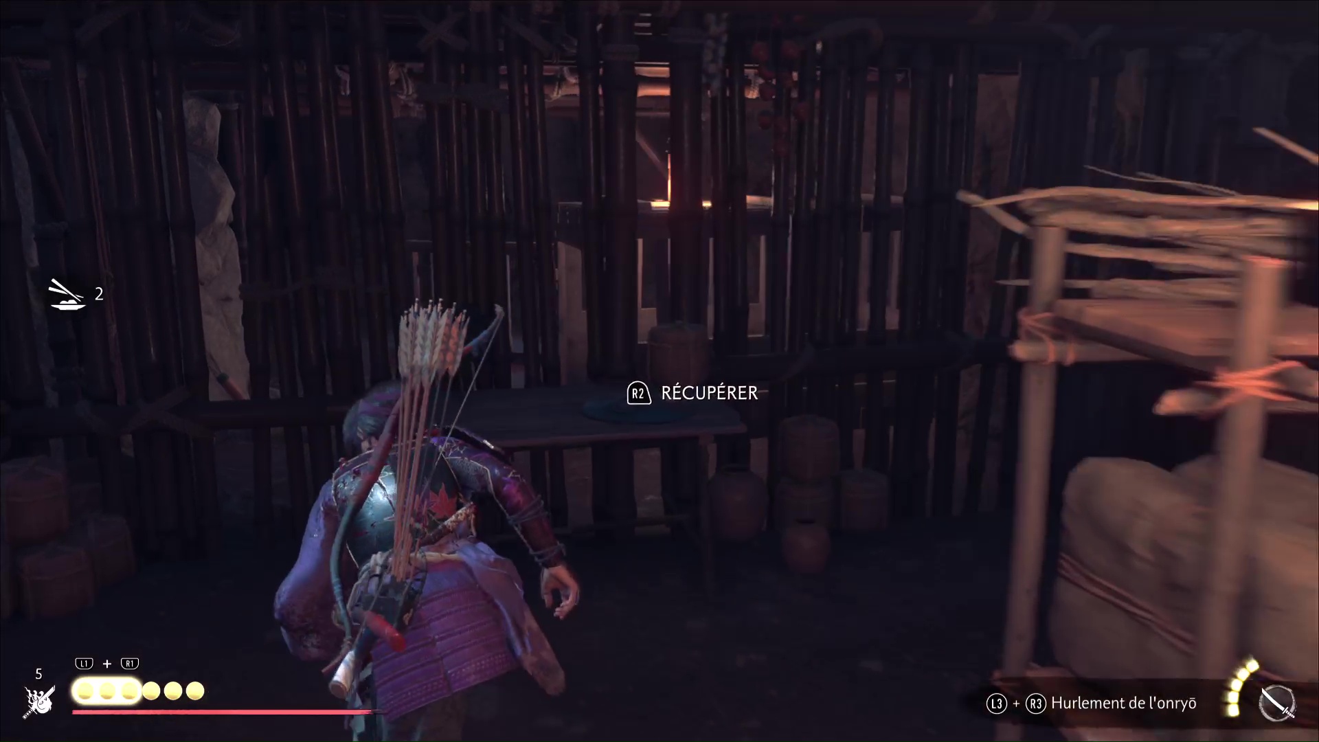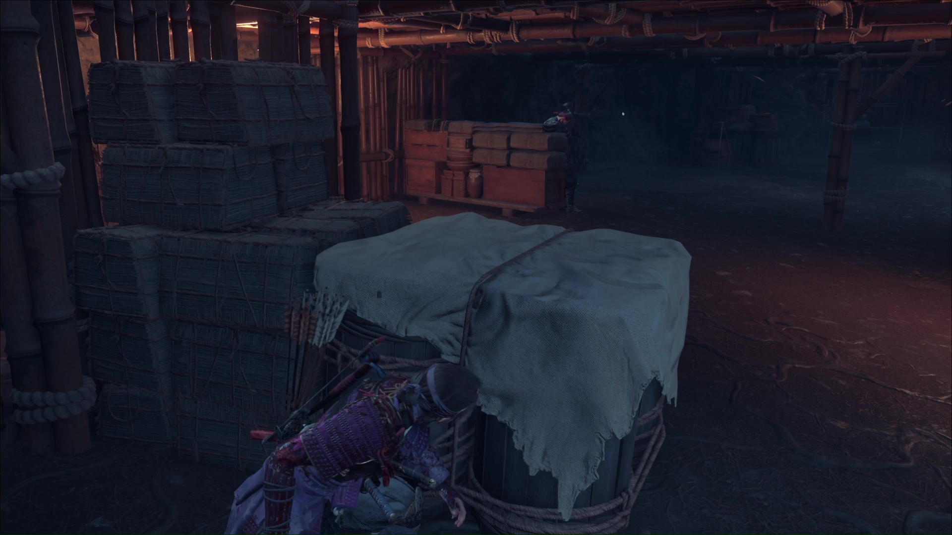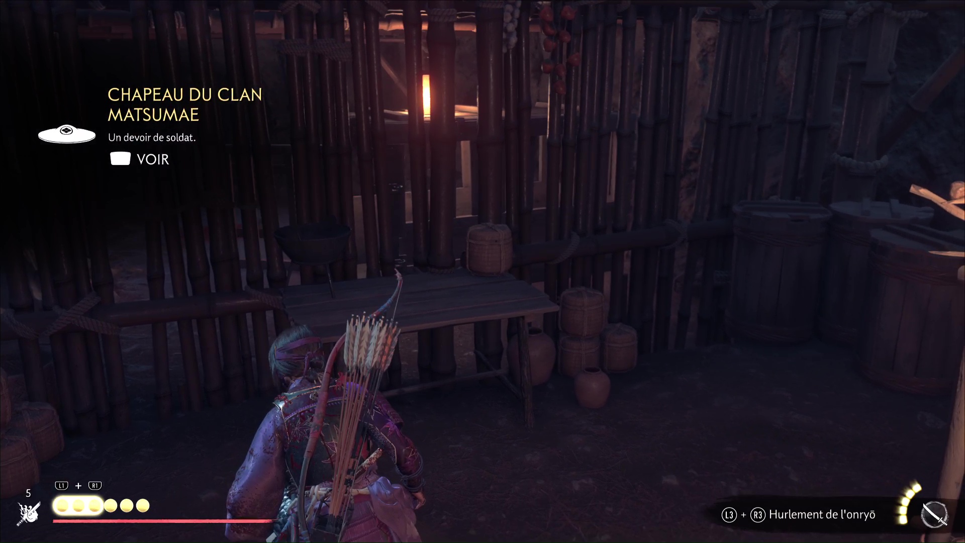 Continuez discrètement et un autre garde dormira contre des caisses. Occupez-vous-en et tournez-la tête sur la gauche pour apercevoir, sur une table, le Chapeau du clan Matsumae.