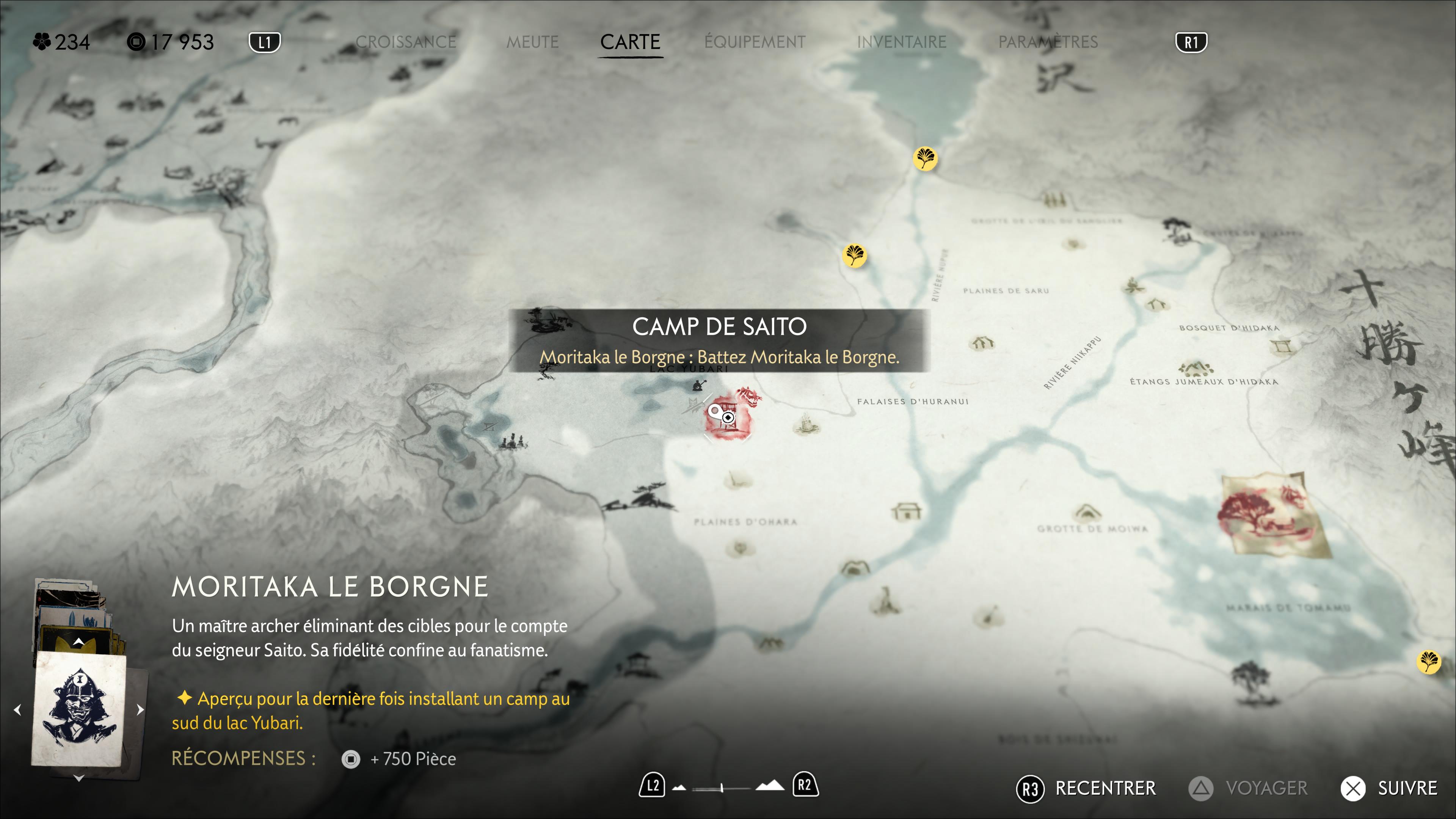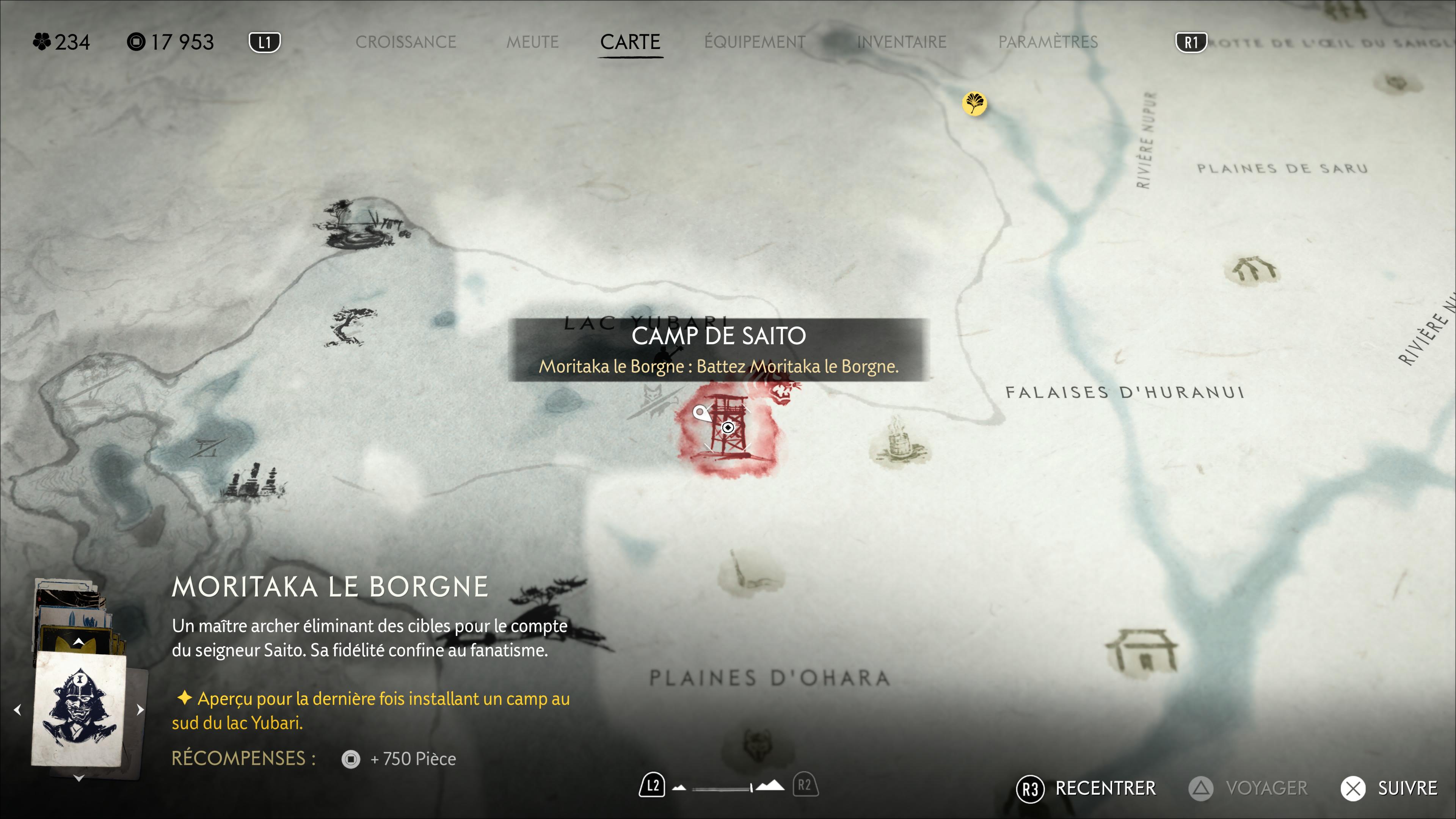 Dirigez-vous vers l’ouest des Monts Tokachi. Au nord de la zone Plaines d’Ohara, vous tomberez sur le Camp de Saito. C’est ici que vous trouverez la prime Moritaka le Borgne.