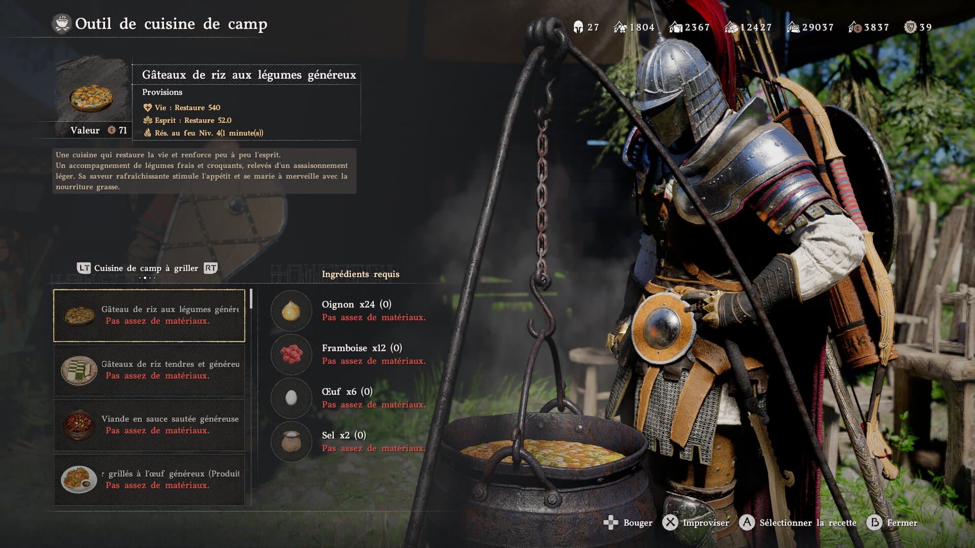 Mais au début de l’aventure, des recettes, vous en manquez. Et ce n’est pas si grave, car il vaut mieux prioriser la simplicité plutôt que de chercher absolument à élaborer des plats qui nécessitent plein d’ingrédients. Certes, ces derniers remontent davantage vos PV, mais en début de partie, votre barre maximale de santé est de toute façon assez basse. Contentez-vous plutôt de simplement faire griller des viandes (du bœuf ou du poulet), sans autre artifice derrière. Vous obtiendrez un plat tout simple, qui vous redonne un peu de santé et que vous pouvez multiplier très facilement sans perdre trop d’argent.