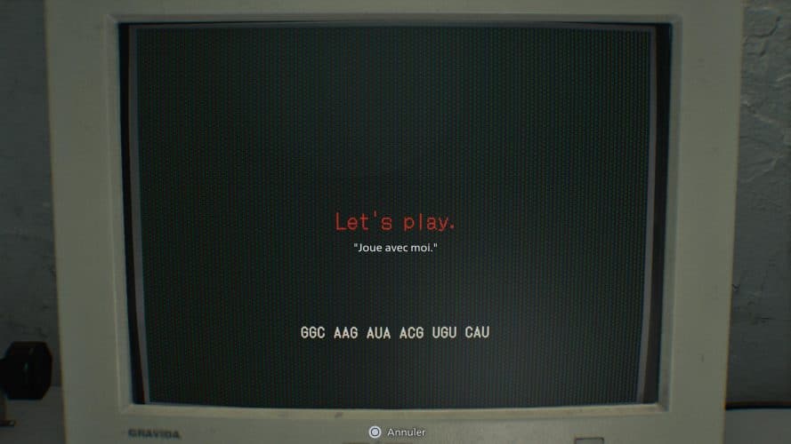 L’analyse va se valider en affichant un étrange message « Joue avec moi », accompagné d’une séquence de lettres, correspondant à l’ARN de la main coupée : GGC AAG AUA ACG UGU CAU.
