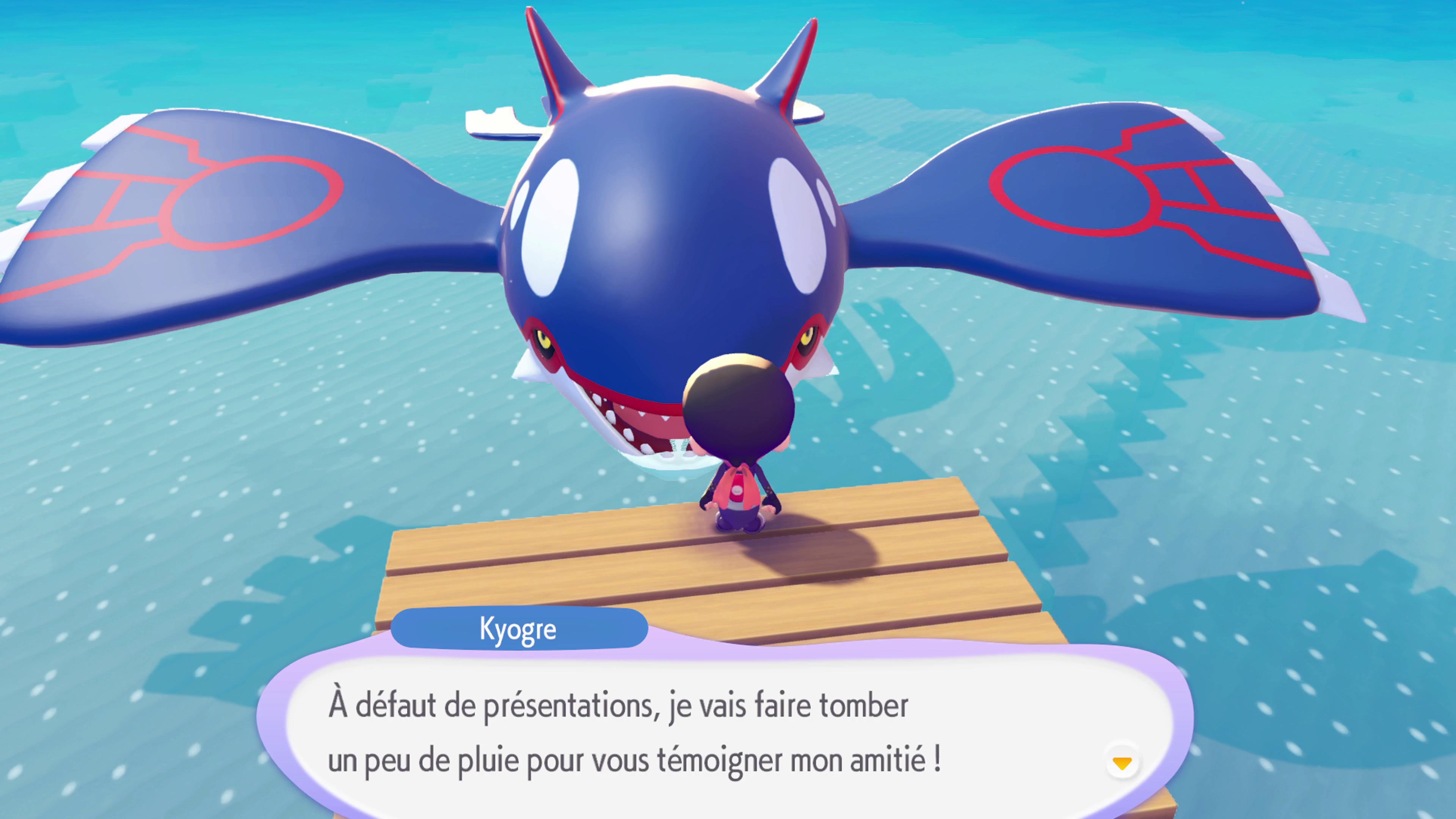 Placez ensuite deux Morpheo-Météo en forme Pluie contre un mur et amenez Carapuce sur place. Rendez-vous ensuite sur la plage où vous avez rencontré Ramoloss pour la première fois et atteignez Kyogre en réparant le ponton (la recette se trouve dans une Poké Ball jaune située à côté de l’établi de la plage).