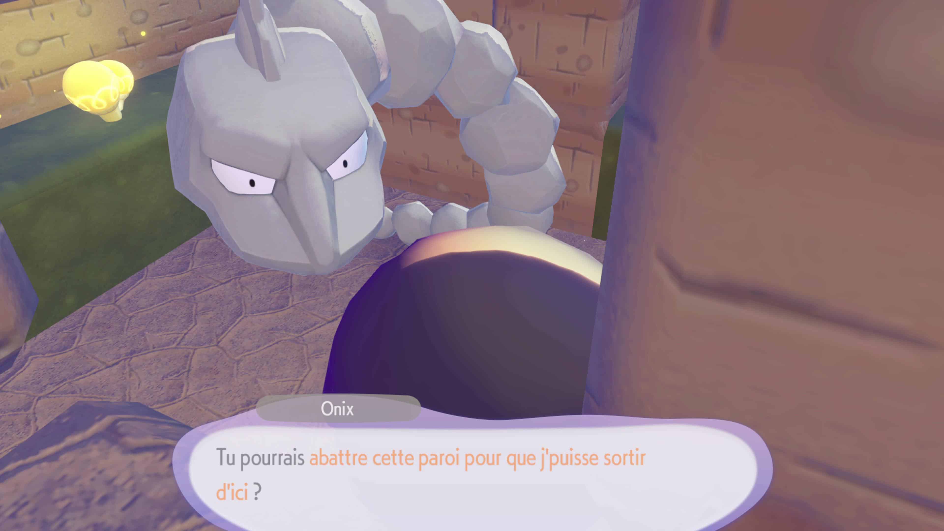 Pour déclencher le début de la quête, rendez-vous dans la grotte située au nord-ouest de la carte. Vous verrez une bulle de dialogue provenant d’un Onix appelant à l’aide. Brisez les rochers à l’aide de la capacité Éclate-Roc, puis parlez à Onyx. Rendez-vous ensuite voir le professeur Bouldeneu, qui vous dirigera vers l’endroit où vous avez rencontré Magicarpe pour la première fois. Pour poursuivre la quête, vous aurez besoin de l’aide d’un autre Pokémon.
