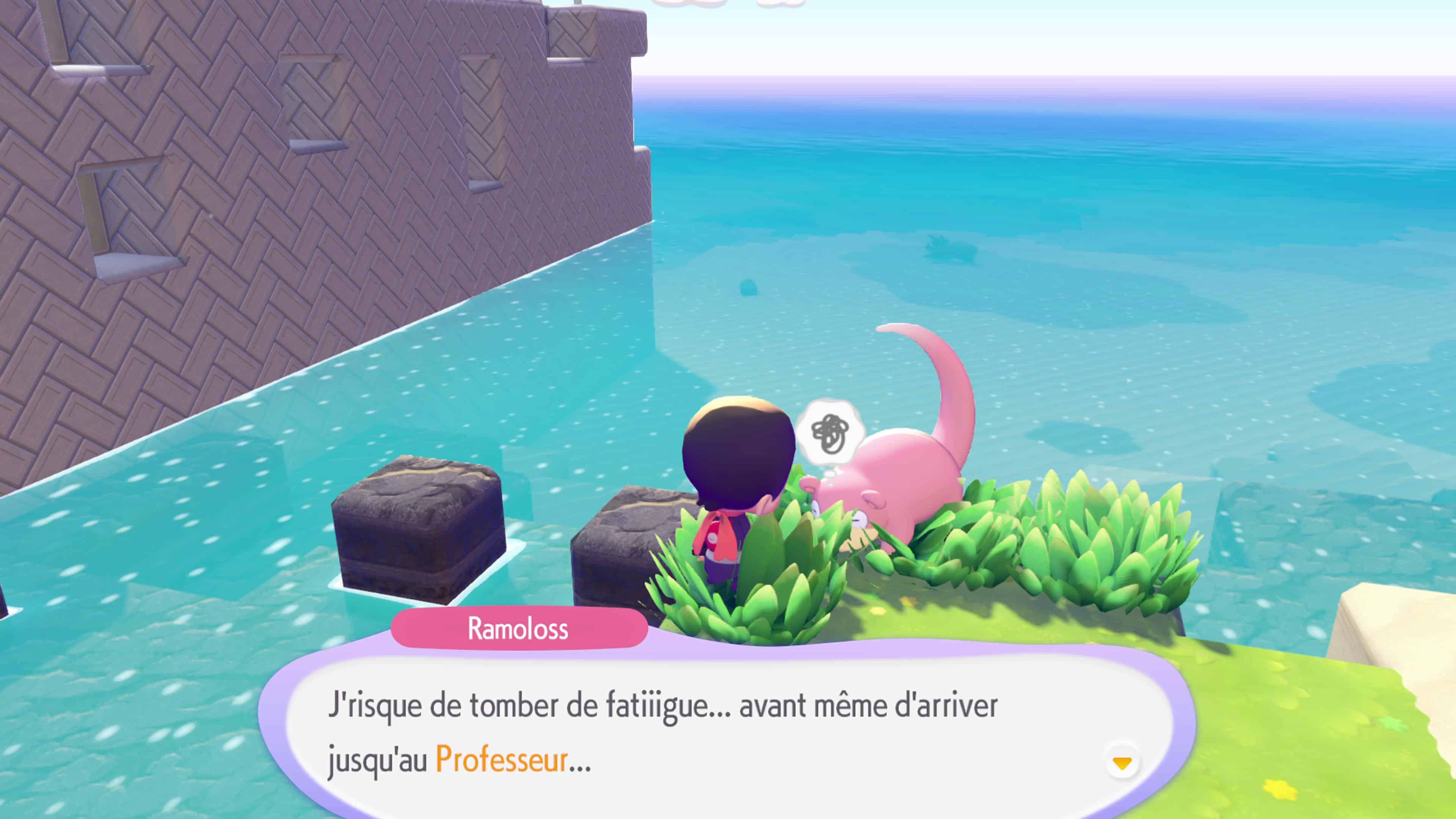 Une fois arrivé au Centre Pokémon, le professeur Bouldeneu vous explique que le bâillement de Ramoloss possède le pouvoir de faire tomber la pluie. Malheureusement, il n’est pas encore assez puissant pour provoquer cet effet.