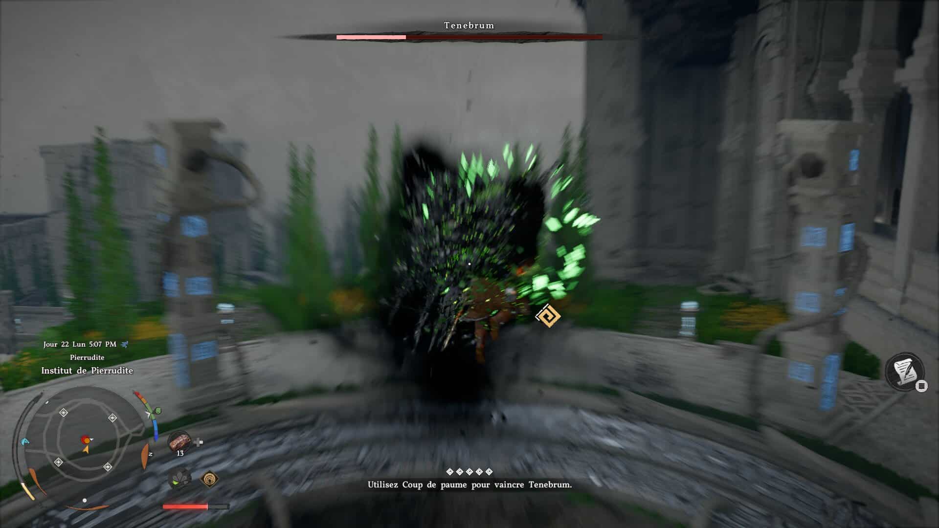 Une fois proche de lui, un coup de paume suffit pour lui infliger de gros dégâts. Il vous repoussera, mais vous n’aurez plus qu’à réeffectuer cette même manœuvre deux fois pour le battre. Simple comme tout, mais le jeu se montre cryptique, c’est pourquoi certaines personnes pourraient ne pas voir la solution dès le départ.