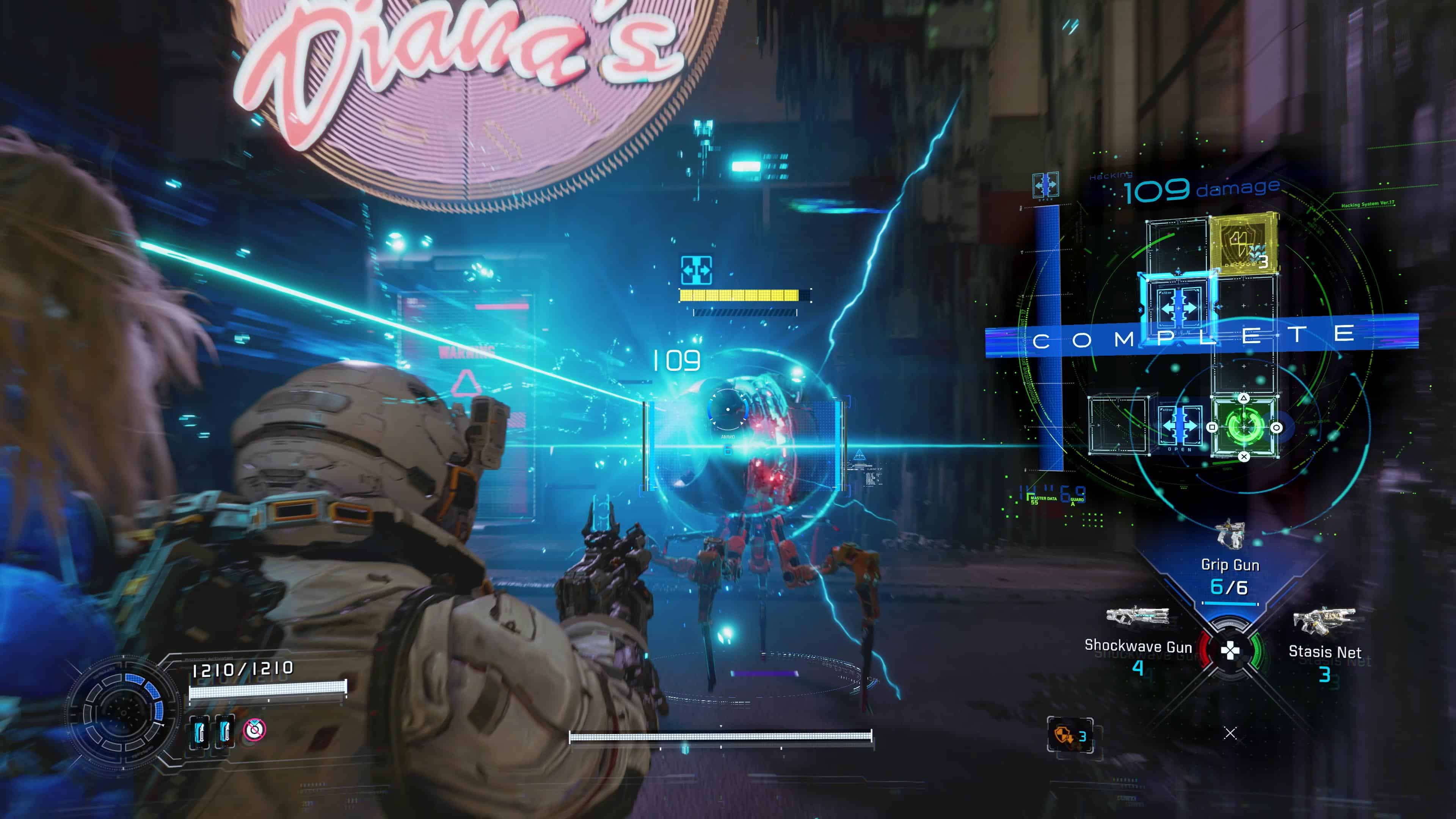 Pragmata gagne ainsi rapidement en intensité, en demandant une gestion plus rigoureuse des foules, une exécution rapide des piratages et une observation attentive des formations ennemies. Le jeu montre très vite qu’il est impossible d’attaquer sans réfléchir. Il faut souvent utiliser l’arsenal de Hugh (comme l’arme de stase qui créée un petit dôme de ralentissement) pour neutraliser temporairement un ou plusieurs ennemis afin de se concentrer sur les autres. La tâche est d’autant plus compliquée que les champs de bataille sont souvent assez étroits, ce qui renforce encore le caractère intense des affrontements.