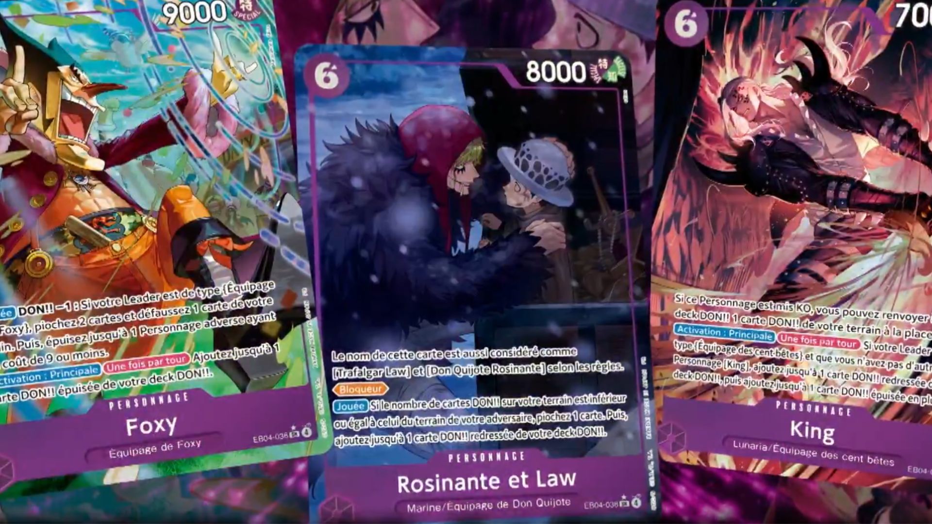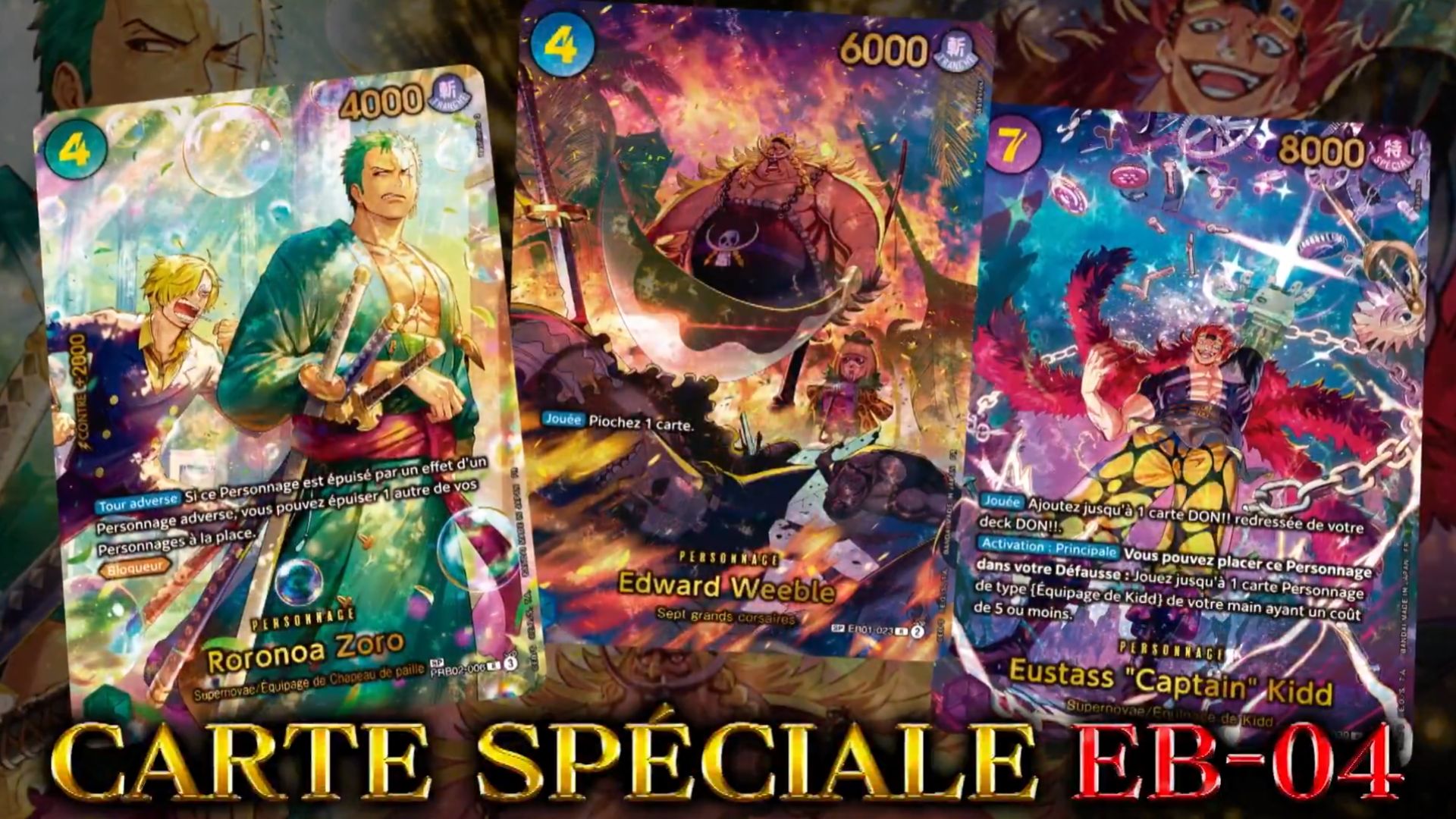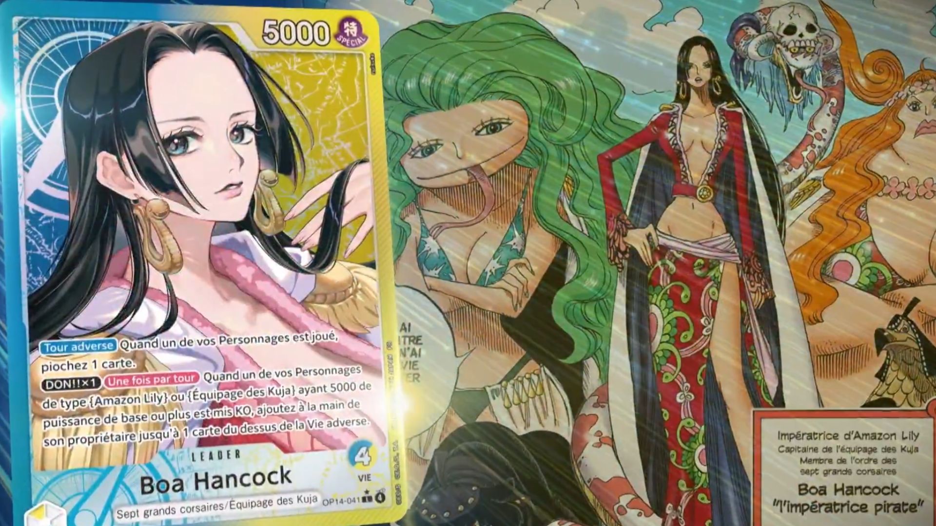 Ainsi, le nouveau set Les Sept de la mer d’Azur [OP14-EB04] contiendra plus de 165 cartes à sa sortie le 16 janvier 2026, avec entre autre :