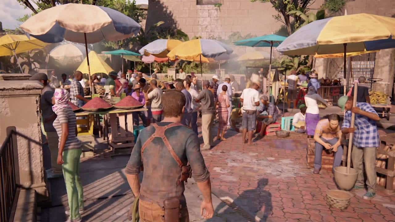 Commençons par un premier exemple du côté d’Uncharted 4 : A Thief’s End avec le trophée intitulé « C’est le trac » sur PS4. Pour le débloquer, il faut rester parfaitement immobile pendant 30 secondes en arrivant au marché, juste avant la poursuite en ville.