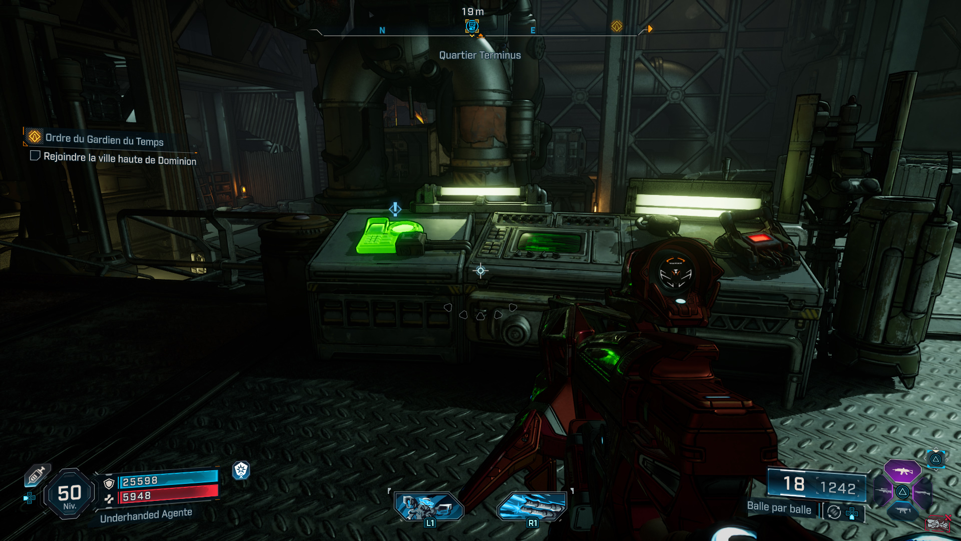 Après avoir interagi avec la console, partez en direction du sud-est pour rejoindre l’entrée de l’usine de batterie. Essayez donc d’ouvrir la porte en utilisant le boitier à droite pour avoir affaire à une vague de soldats de l’Ordre. Sur le coup, Max vous demande alors de vous rendre à plusieurs endroits dans tout Dominion pour récupérer des composants (réservoir de plasma, bobines thermiques, onduleur thermique, carburant à ions, mèche). Ne tenez pas compte de ces objectifs et attendez un petit moment pour qu’il se souvienne enfin du code permettant d’ouvrir la porte.