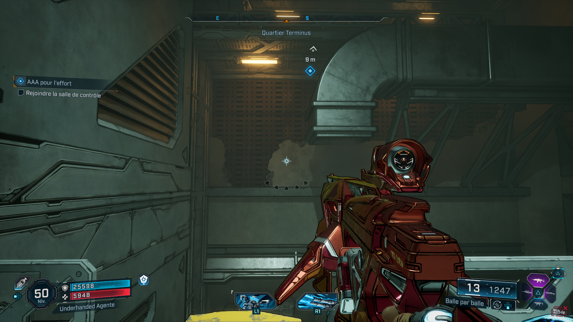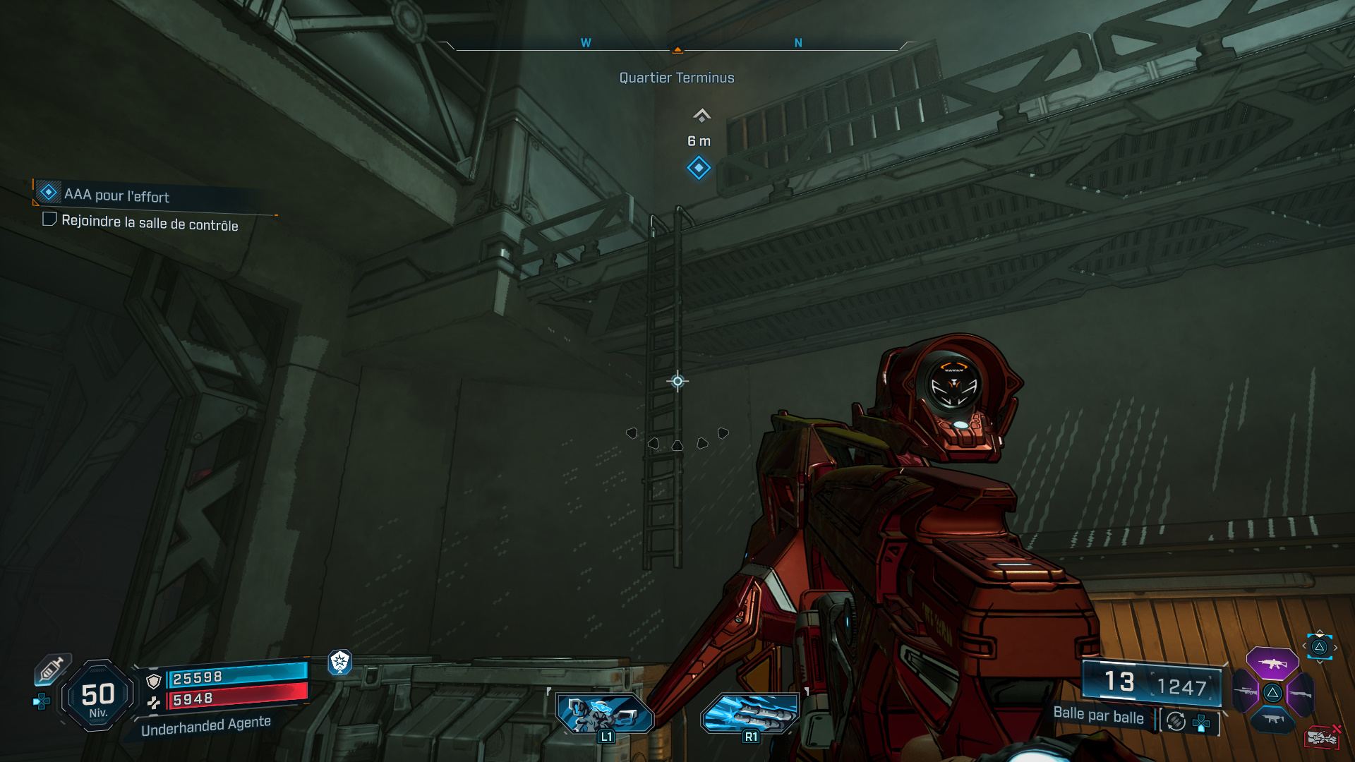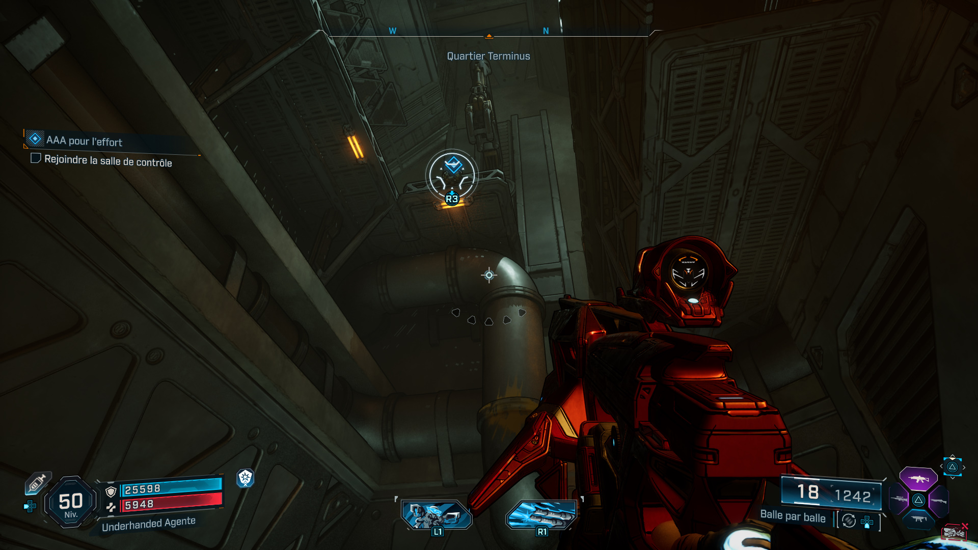 Avancez ensuite en suivant de nouveau l’indicateur de votre boussole, puis montez à l’échelle un peu plus loin. Planez jusqu’à la grille et déplacez-vous à droite pour remonter sur une plateforme. De là, levez les yeux pour apercevoir un point d’accroche vous permettant de grimper davantage, et suivez enfin le couloir pour arriver dans la salle de contrôle où vous attendent de nombreux ennemis.