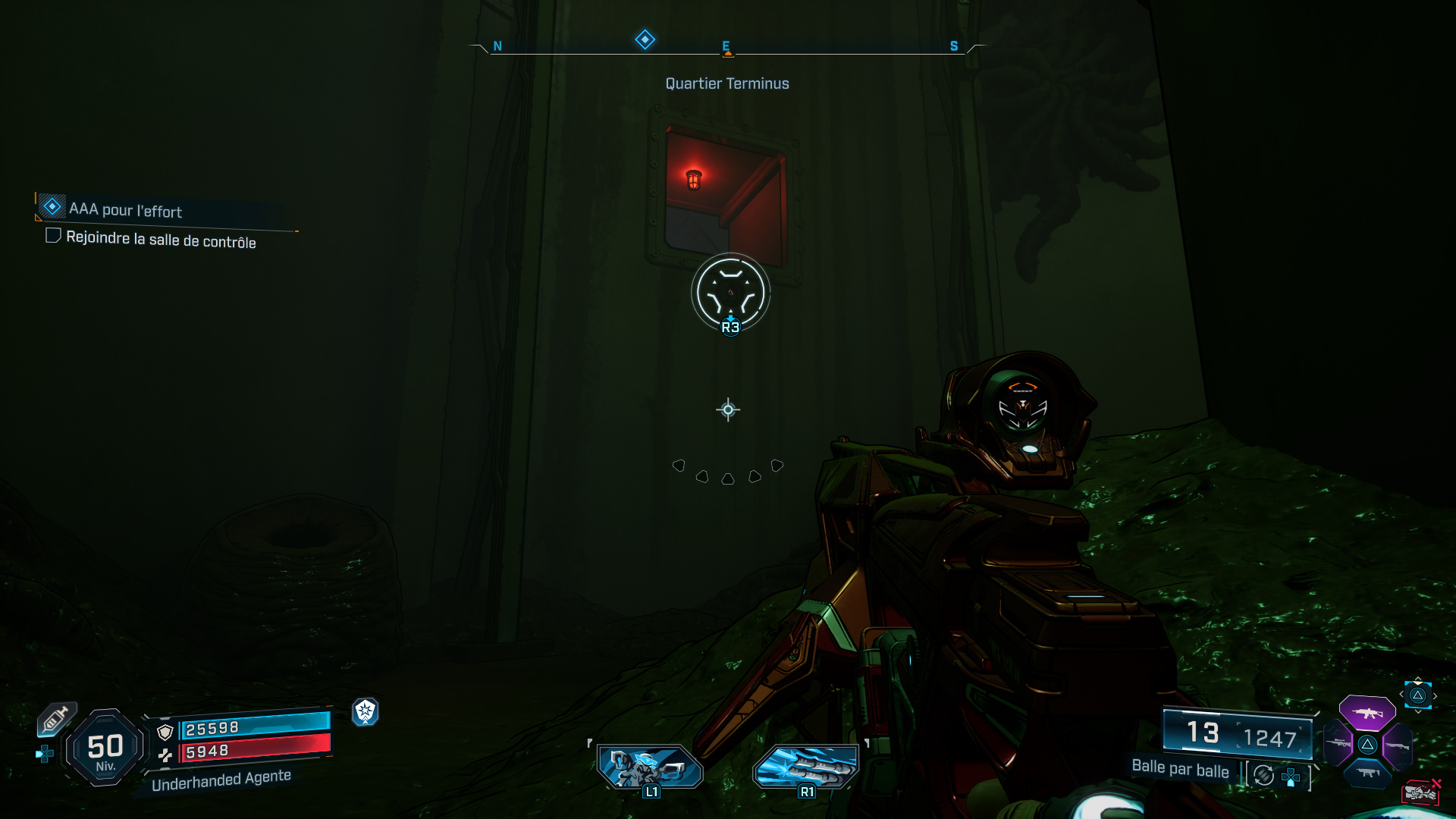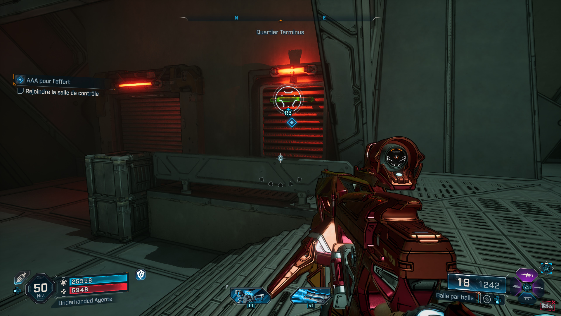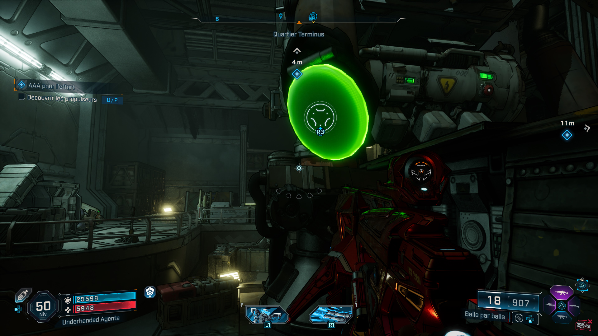 Avancez ensuite en suivant de nouveau l’indicateur de votre boussole, puis montez à l’échelle un peu plus loin. Planez jusqu’à la grille et déplacez-vous à droite pour remonter sur une plateforme. De là, levez les yeux pour apercevoir un point d’accroche vous permettant de grimper davantage, et suivez enfin le couloir pour arriver dans la salle de contrôle où vous attendent de nombreux ennemis.