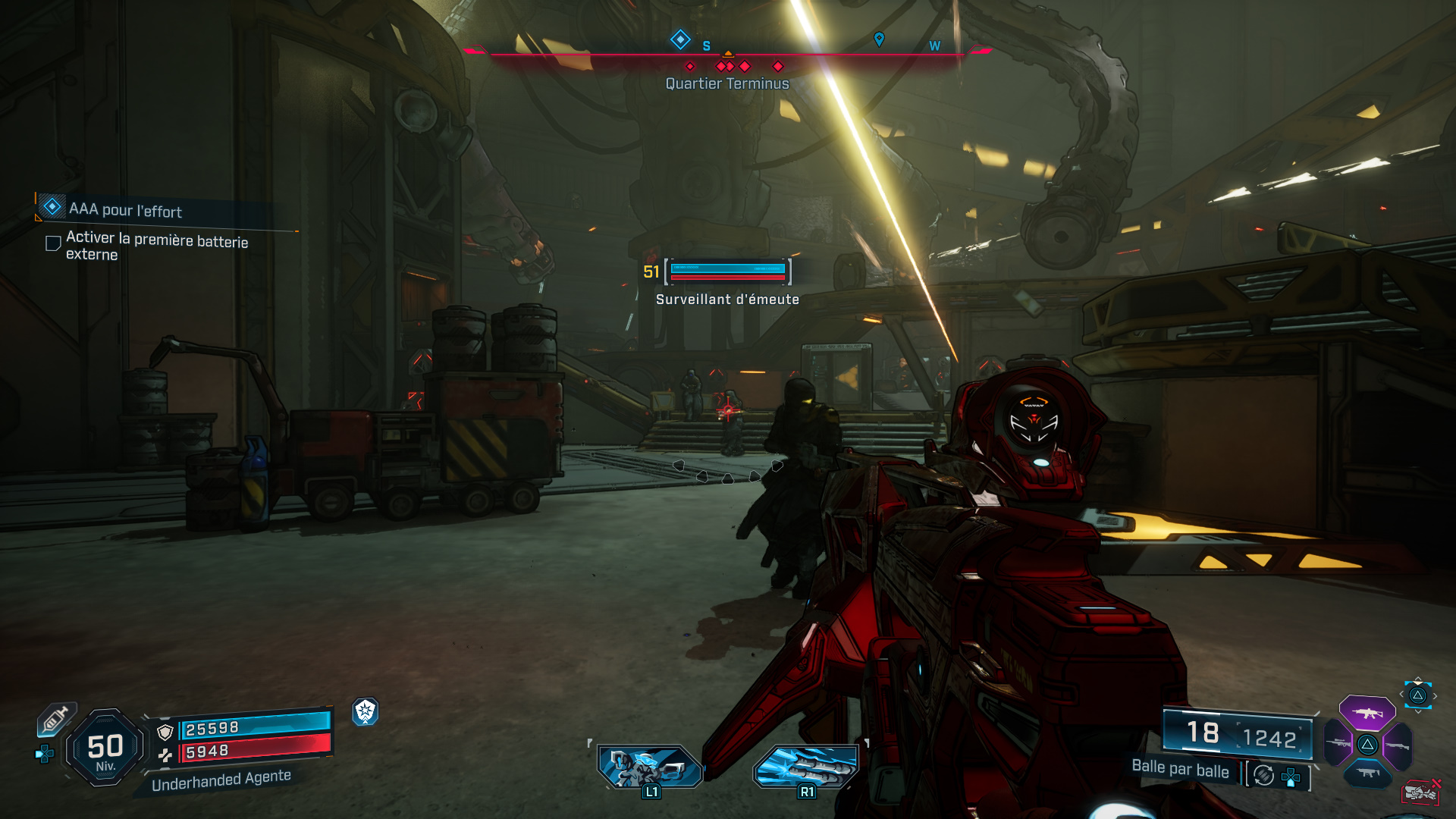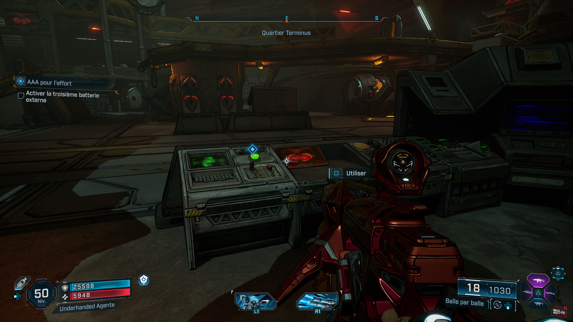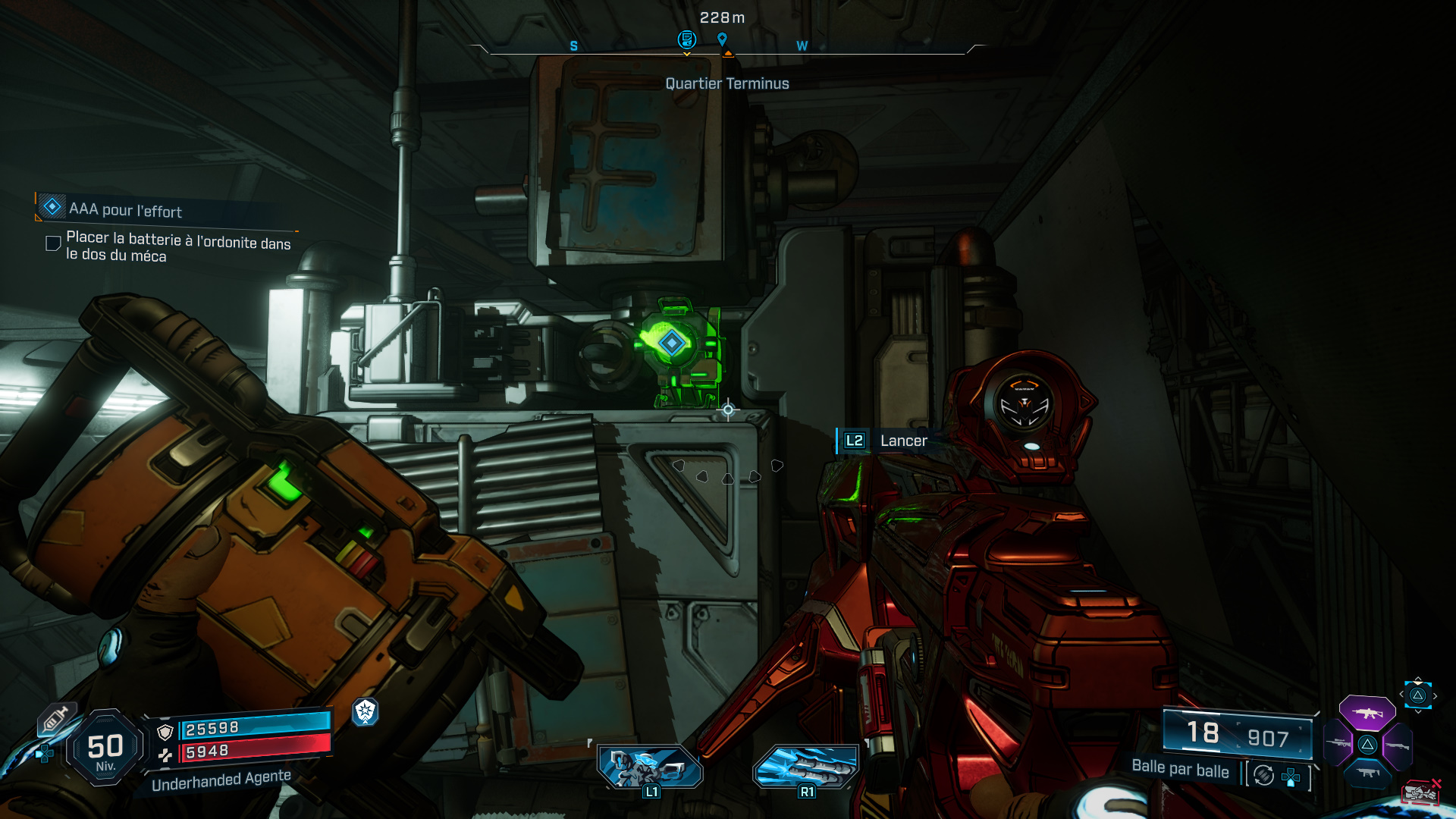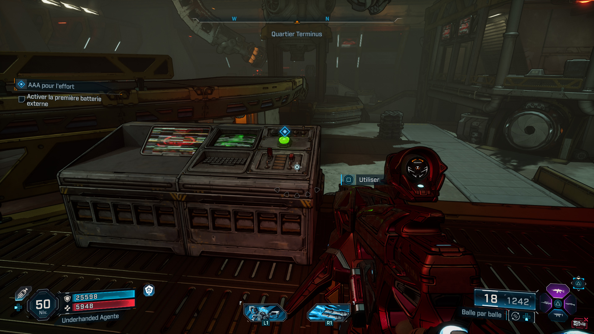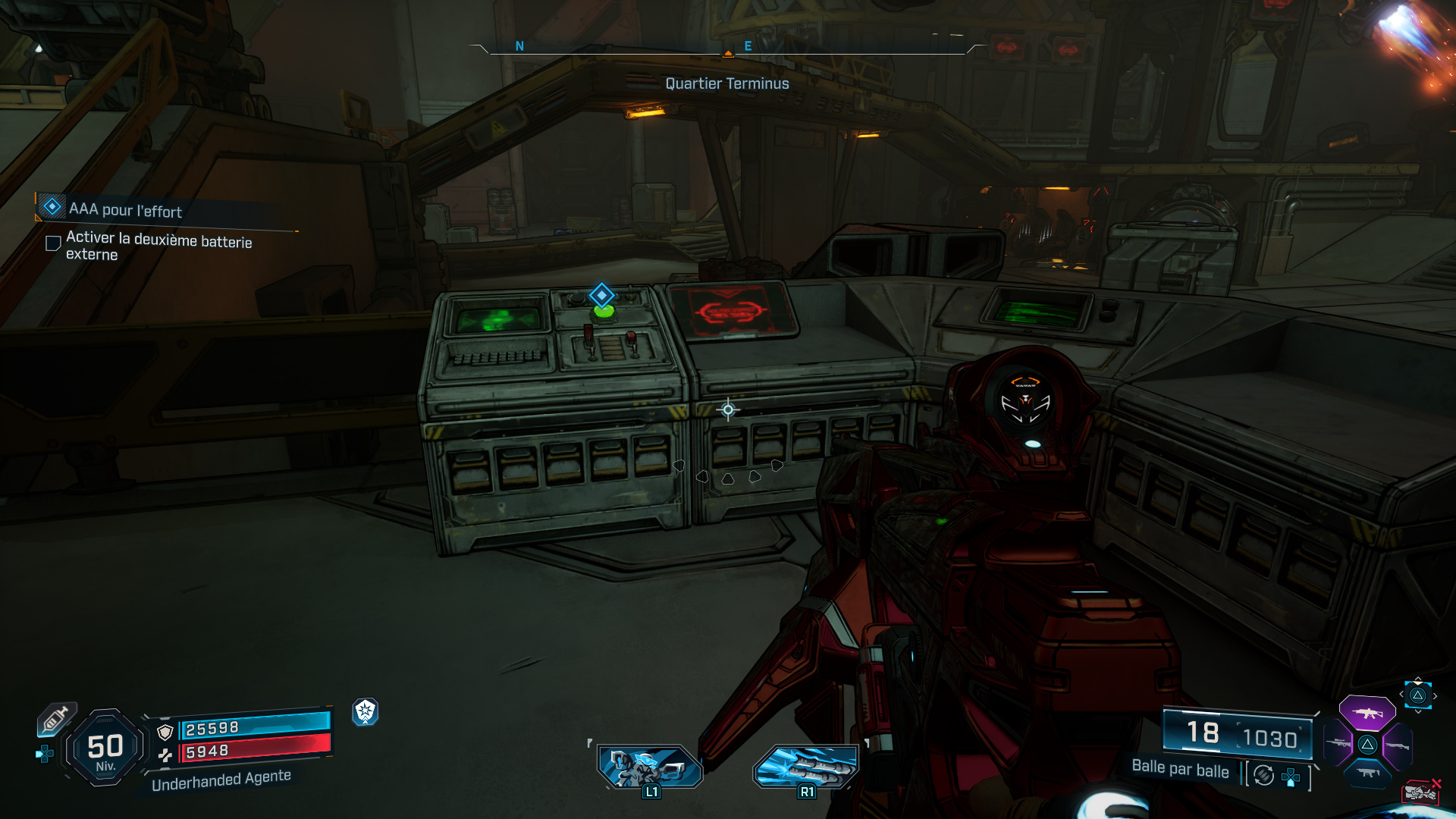 Une fois la zone nettoyée, il s’agit d’activer la première batterie externe au niveau de la passerelle supérieure dans le coin sud-est en appuyant sur le bouton, ce qui fait apparaître une nouvelle vague d’ennemis. Repérez ensuite une autre console dans le coin nord-ouest de la zone cette fois, et appuyez sur le bouton pour activer la deuxième batterie externe. Enfin, activez la troisième et dernière batterie externe à l’endroit indiqué par votre boussole pour faire face à une énième vague de soldats de l’Ordre.
